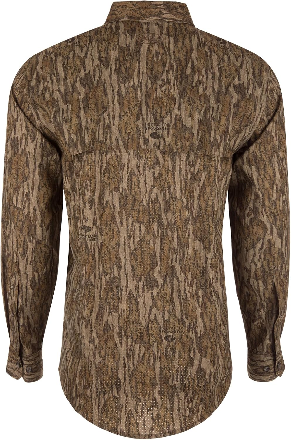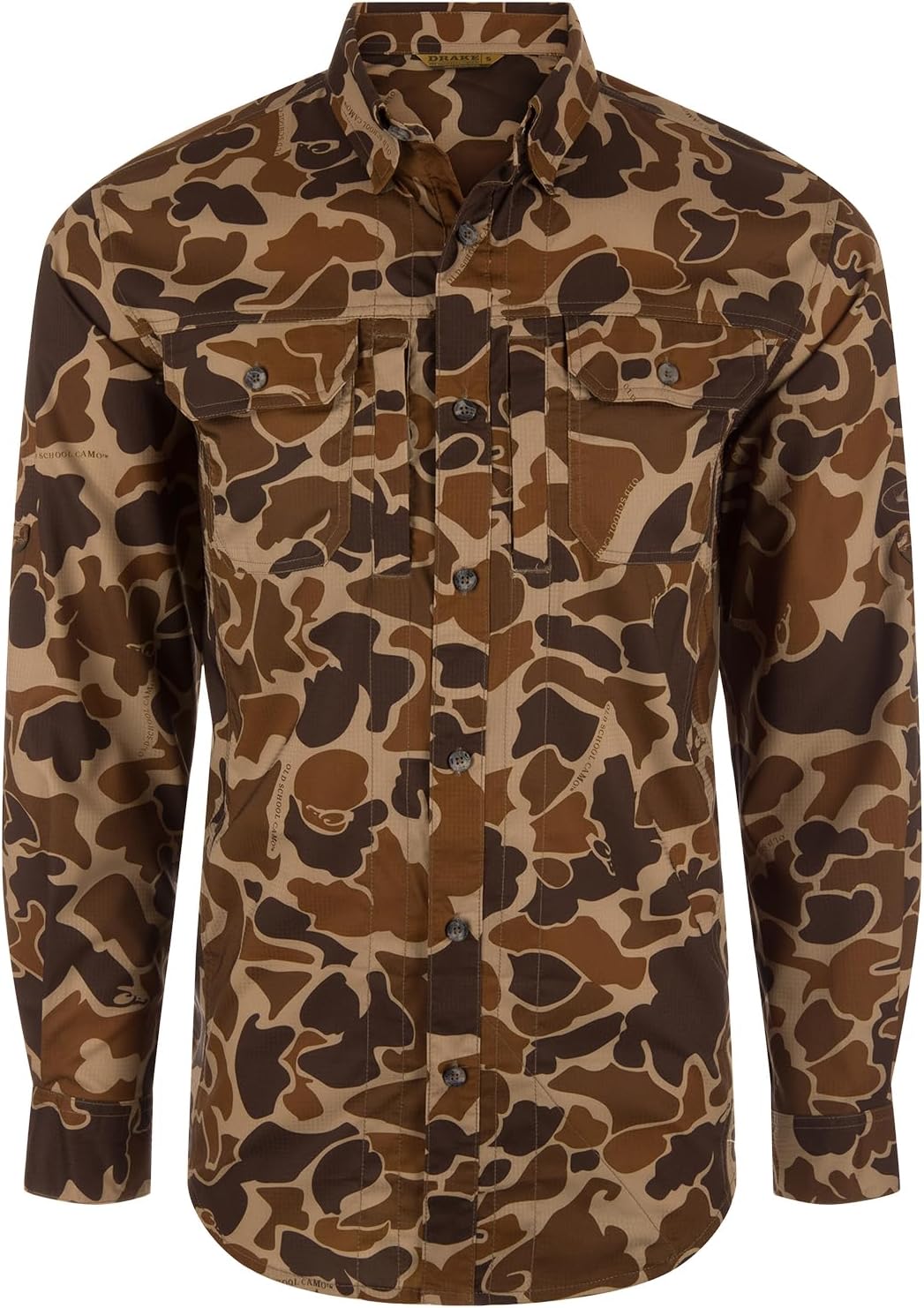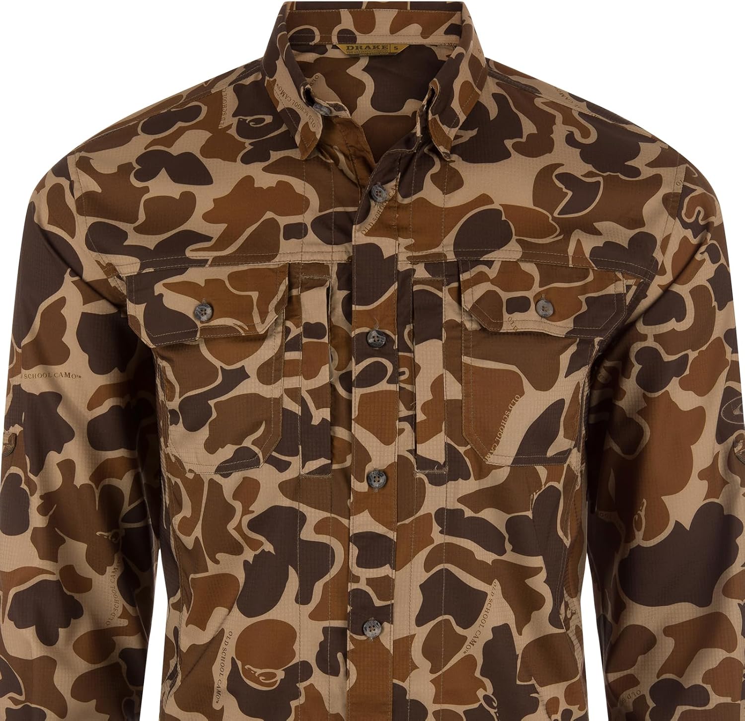DRAKE WATERFOWL MEN'S EST WINGSHOOTER TREY LONG SLEEVE SHIRT (DW0093): Built for early-season pursuits and unpredictable outdoor conditions, the Drake EST Wingshooter Trey Long Sleeve Shirt for men delivers a perfect balance of breathable comfort, sun protection, and technical performance. Constructed from an ultra-light 3oz / 102 GSM blend of 93% polyester and 7% spandex, this long-sleeve shirt features a waffle dobby texture that offers subtle structure while allowing natural movement through built-in stretch. The UPF 30 sun protection shields your skin during long hours in the field, while the shirt's moisture-wicking technology pulls sweat away to keep you dry and focused in high-exertion conditions. For fast recovery after intense movement or hot, humid weather, the quick-drying fabric ensures you stay comfortable from sunrise to sundown. Engineered for functionality, this men's outdoor shirt includes a hidden button-down collar for a clean, secure fit that won't flap in the wind. A vented cape back combined with laser-punched ventilation zones enhances airflow and climate control, making this button-down camo shirt a reliable choice in warm or transitional weather. Storage is tailored to the demands of the outdoorsman: a left chest pocket with silent Magnattach closure offers quick access to calls or licenses, while the right chest pocket with a YKK zipper keeps essentials safe and secure. For added utility, a discreet sunglass wipe is sewn into the interior.