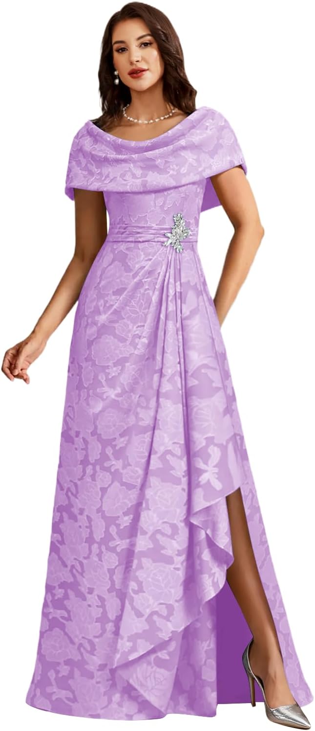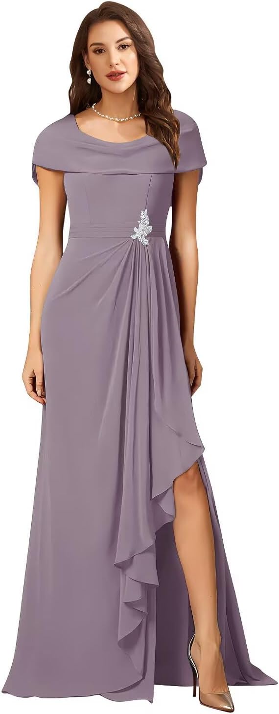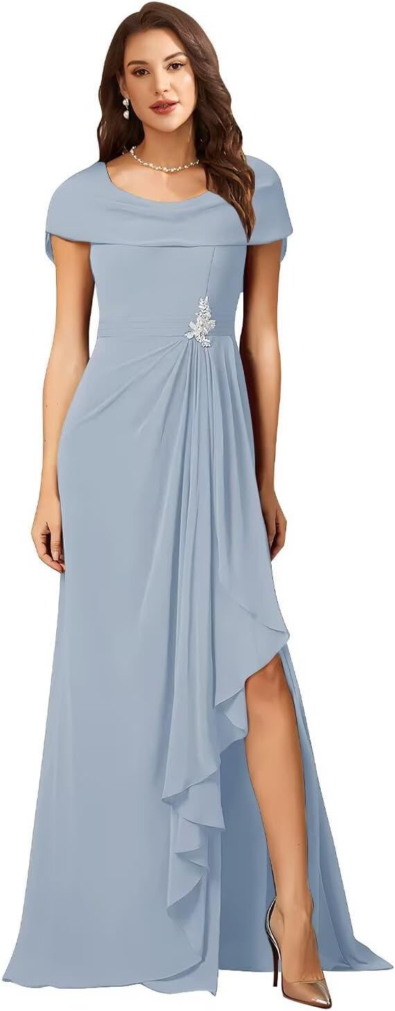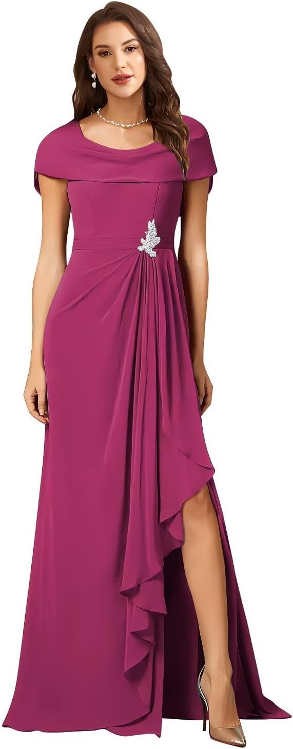 Women's cape sleeves mother of the bride dress with slit,long chiffon ruffles grandmother of the groom gowns for wedding.This plus size mother groom gown for women is elegant and charming,and wearing it will make you pretty Neckline:Cowl NeckSleeve:Cape SleevesLength:Long