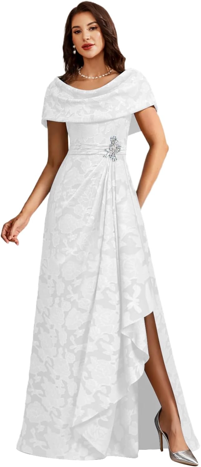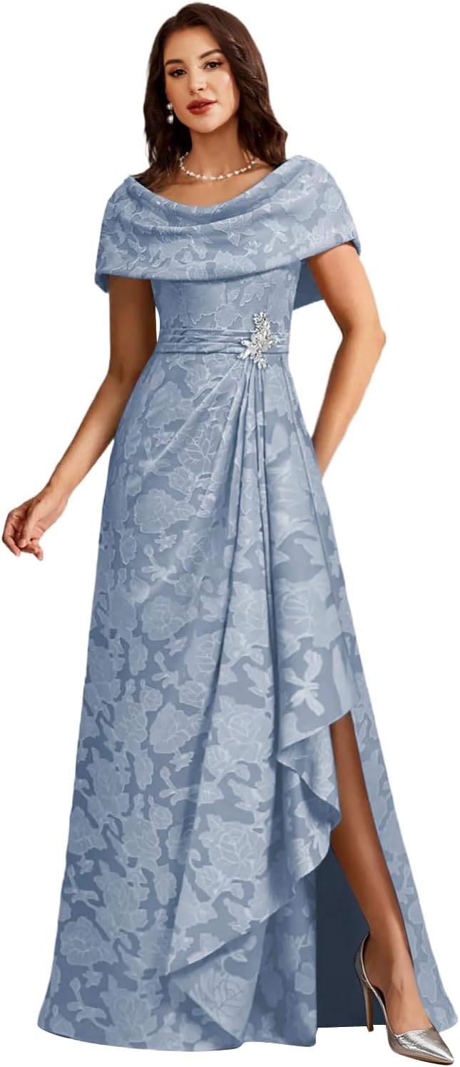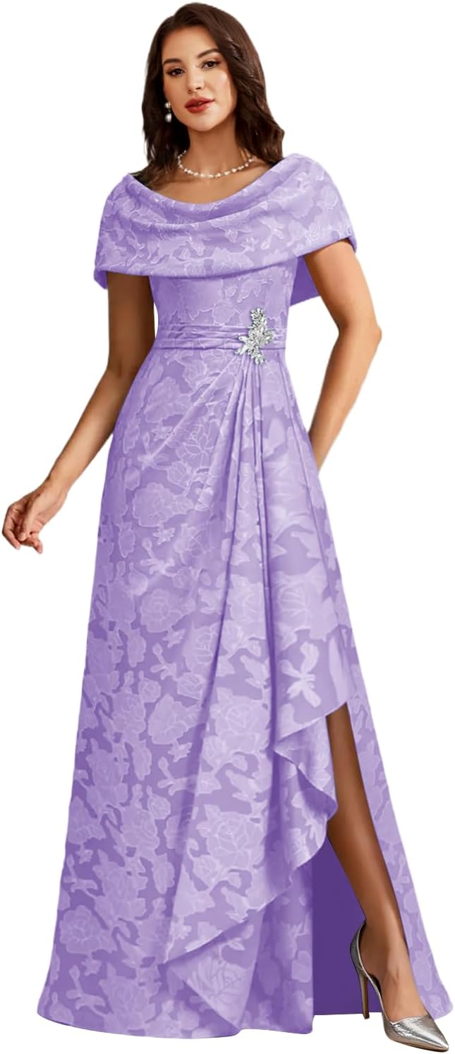 Women's cape sleeves mother of the bride dress with slit,long chiffon ruffles grandmother of the groom gowns for wedding.This plus size mother groom gown for women is elegant and charming,and wearing it will make you pretty Neckline:Cowl NeckSleeve:Cape SleevesLength:Long