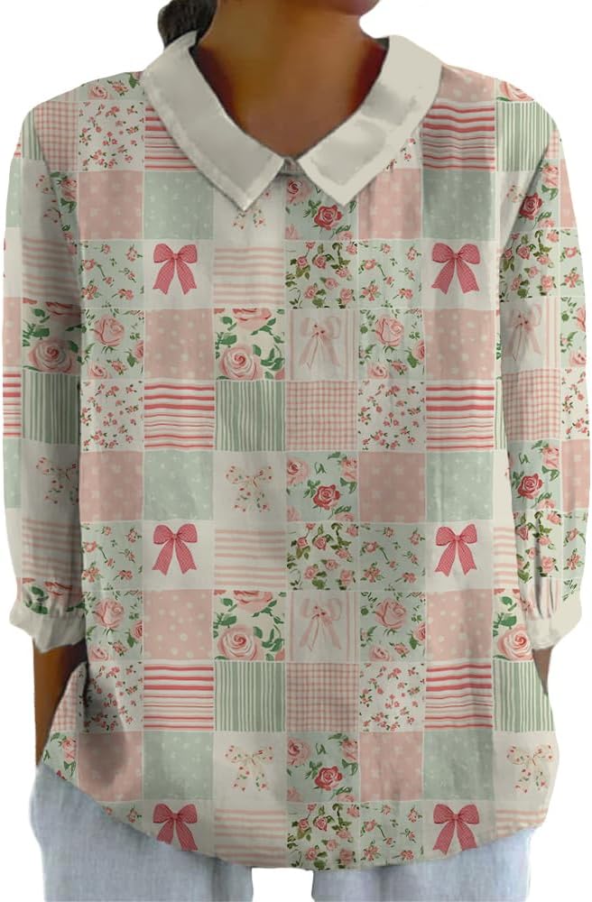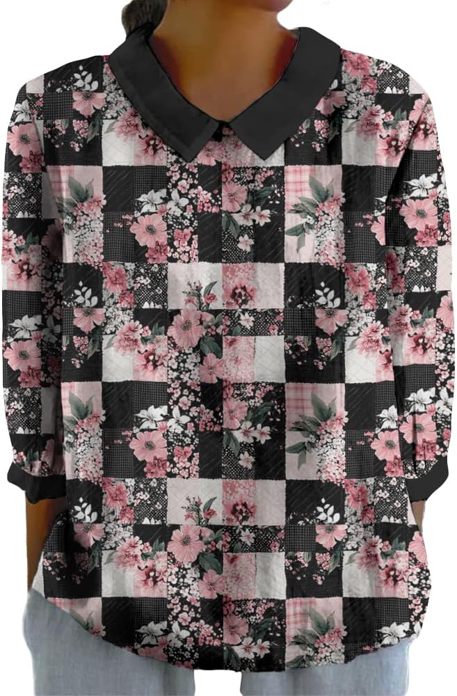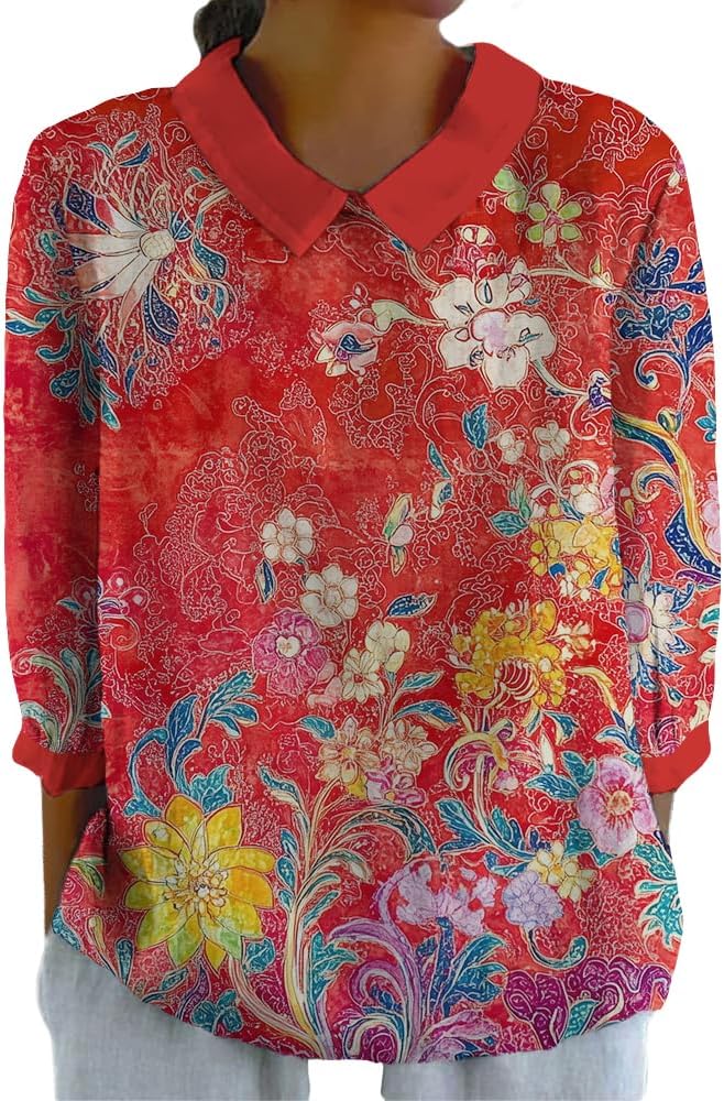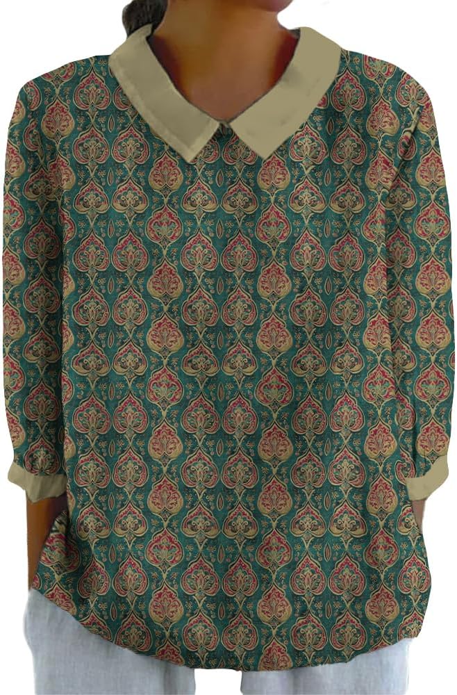 Spatofa Boho Tops for Women 2025 3/4 Sleeve Vintage Floral Printed Lapel Doll Collar TShirt Casual Loose Fit Trendy Tops
