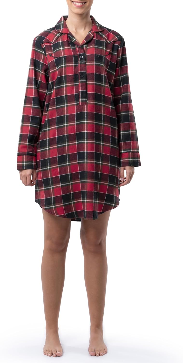 Roomy comfort is here in the form of your new favorite night dress. This Women's Wrangler Flannel Shirtdress is the perfect nighty for hot or cold sleepers alike. Warm flannel keeps you cozily covered while its roomy mid-length skirting ensures you receive ample airflow where you need it. You'll appreciate the classic designs and detailed updates to this classic design.