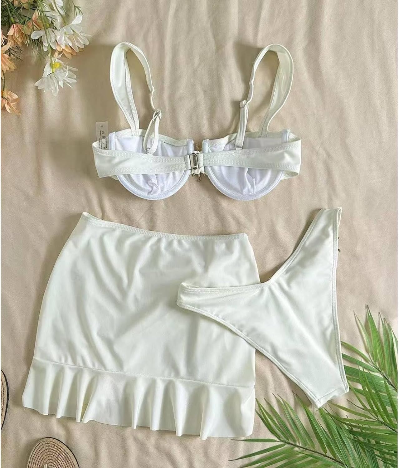 FUFUFARYA Women’s 3 Piece Bikini Set includes an underwire bikini top, V waist high cut bikini bottom, and drawstring ruffle swim skirt cover up, creating a stylish and flattering beach look.Made of 82% Polyamide and 18% Spandex, the fabric is soft, stretchy, breathable and comfortable, providing great fit and support for all-day wear. The balconette underwire top with removable pads lifts and shapes the bust, while the V waist high cut bottom visually elongates the legs.The adjustable drawstring ruffle swim skirt offers extra coverage and a chic resort style. The elegant sun-shaped metal charm detail adds a unique and fashionable touch.Perfect for beach vacation, swimming, tropical holiday, pool party, cruise, honeymoon, resort wear, and summer water activities.