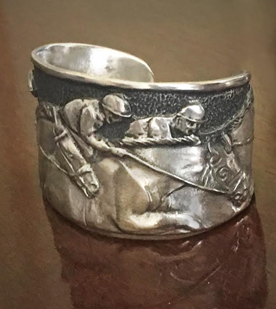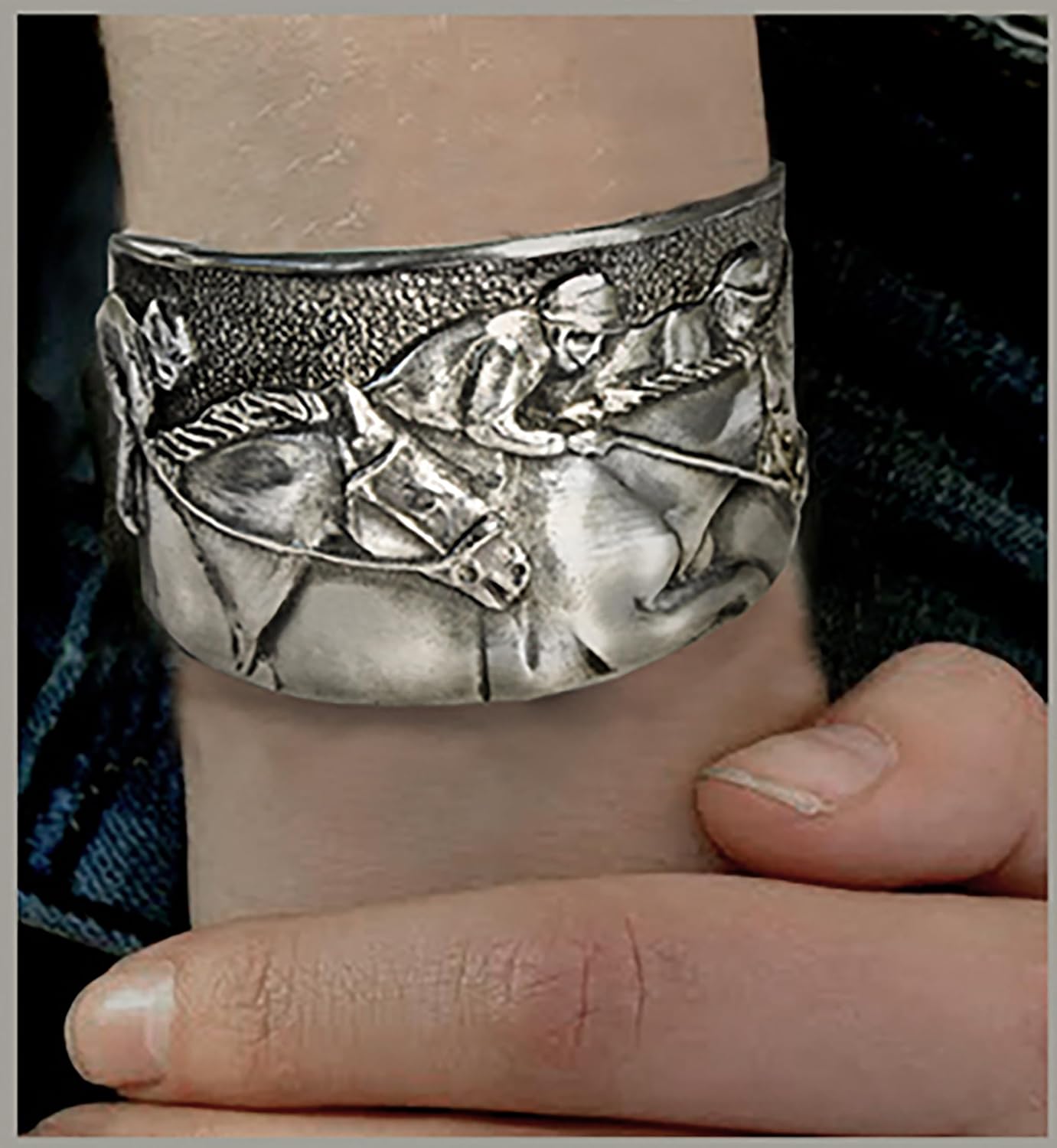 Horse Racing cuff bracelet "Derby Day" hand cast in solid pewter and polished to a mirror finish. Three sculpted horses & jockeys racing! Cuff, fits wrists of 5 1/2 to 8 inches around and is 1 3/4 inch at it's widest tapering to 1 inch on either side.