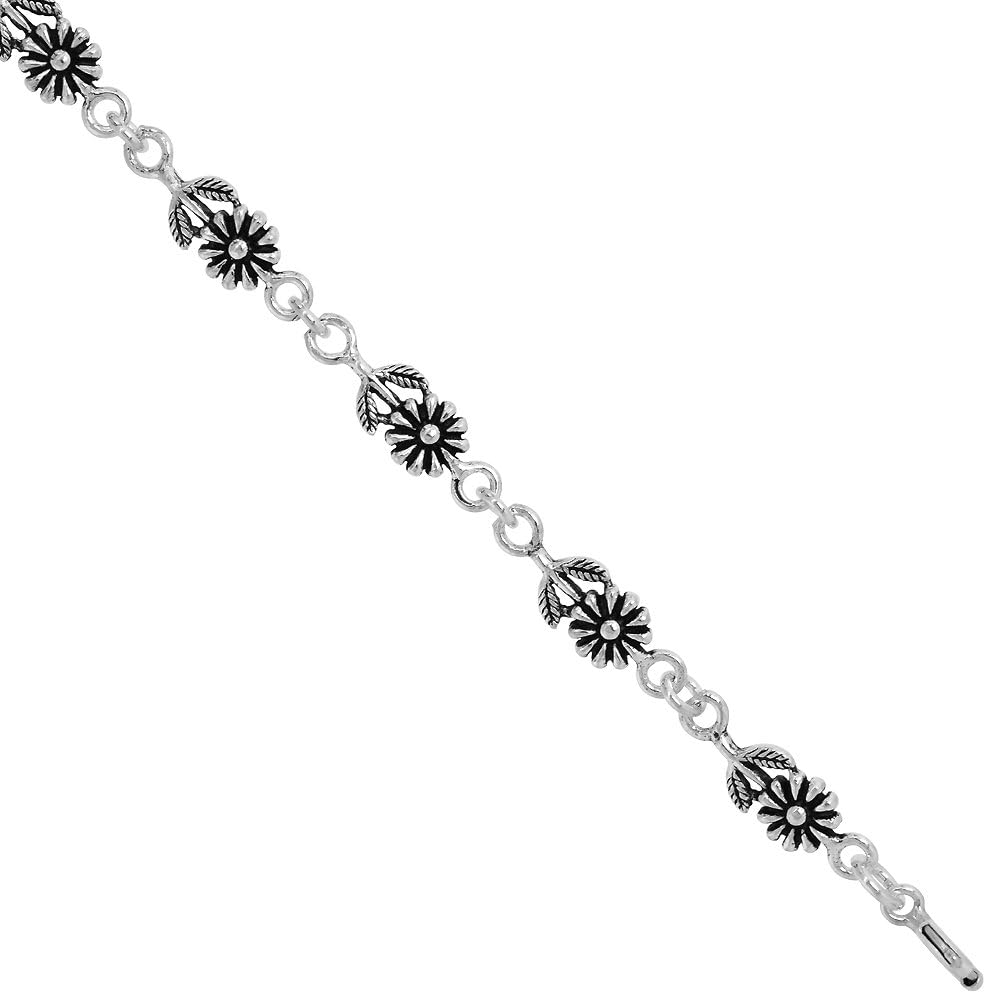 This little Flower Charm Bracelet is very cute solid 925 sterling silver and very well made 7.5 inches long to fit average woman's wrists sizes Its antiqued Finish with a spring ring clasp. The width is over 1/4 inch (7mm).