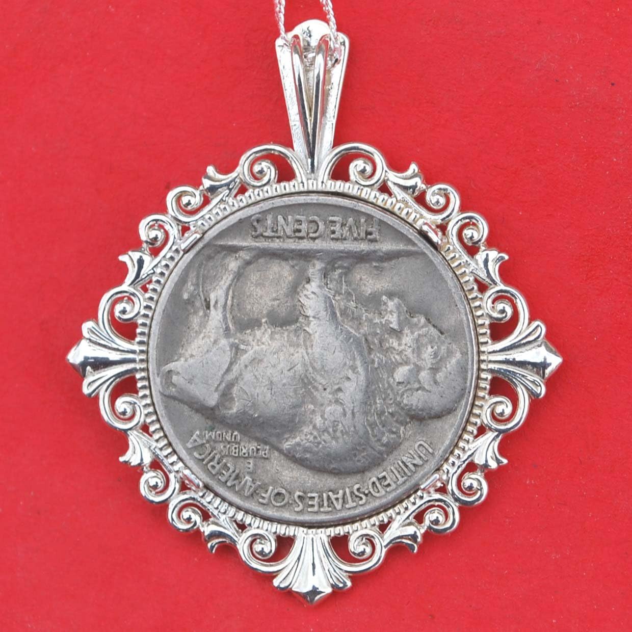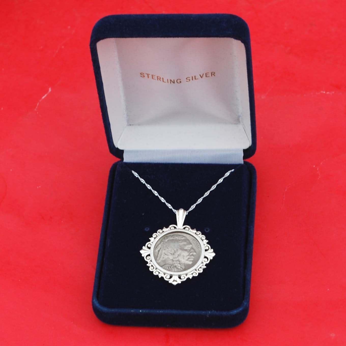 You are looking at a gorgeous SOLID 925 sterling silver necklace with an authentic United States 1937 Indian Head Buffalo Nickel 5 cent XF/AU coin. The frame is well designed with classic Western scrolls, made of solid 925 sterling silver, and is a cast piece instead of stamped one. The coin is at an excellent condition with great details, backside 4-prong set, so you can see both sides of the coin. I designed and made this pendant myself, which is a brand new one and has never been worn or used before. It comes with a 18" 925 sterling silver chain and also a beautiful gift box, so the pendant is ready to wear when it arrives. This necklace will be great for holiday gift, investment purpose or just adding to your coin/jewelry collection. Both chain and pendant are marked with 925 Sterling Silver. I will be happy to combine shipping for multiple items. All Copy Right Reserved. Thanks,