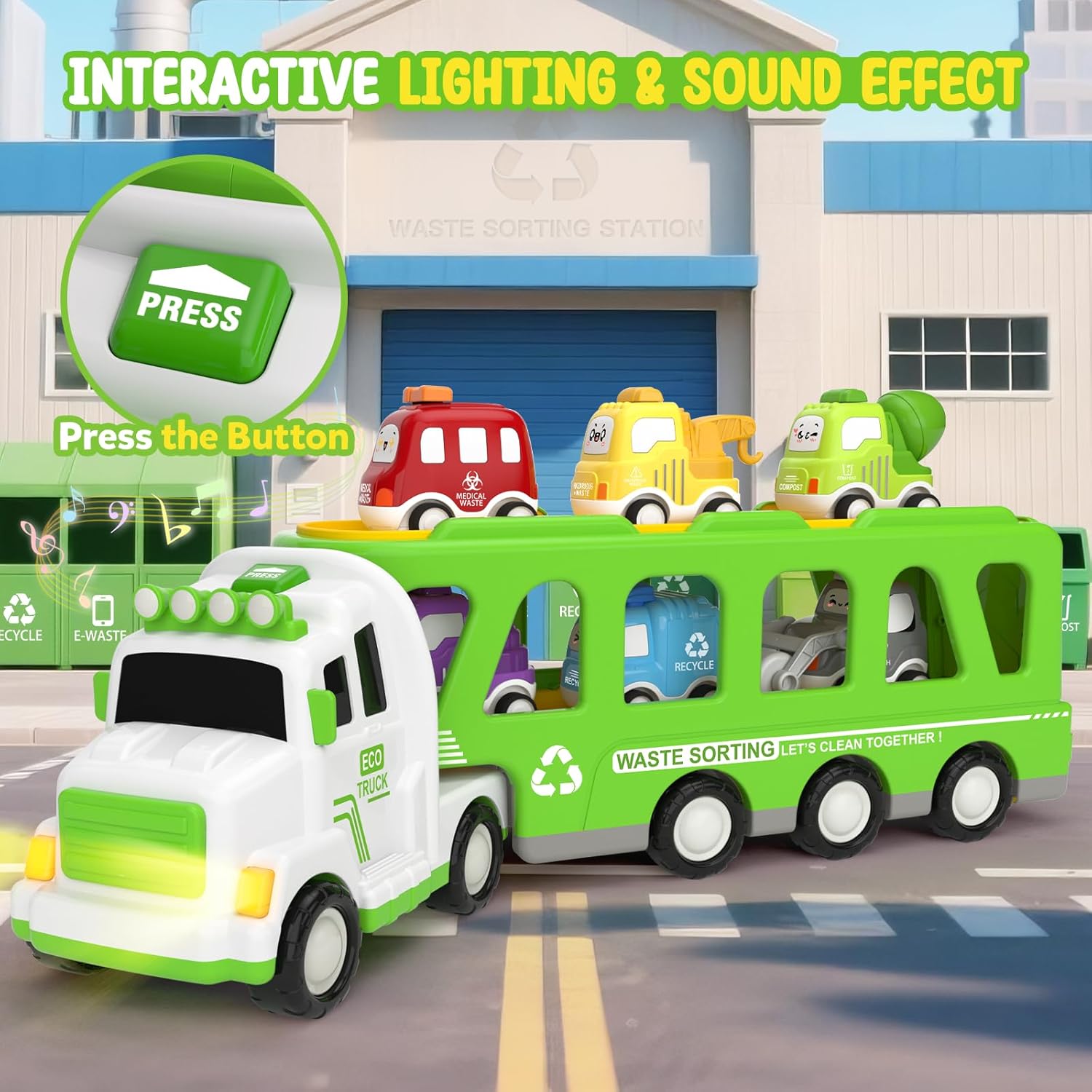 | Included Components | 1 x 17" Large Carrier Truck, 1 x E-waste truck; 1 x Trash Truck; 1 x Compost Truck; 1 x Medical Waste Truck; 1 x Hazardous Waste Truck, 1 x Recycle Truck; 1 x Playmat |
