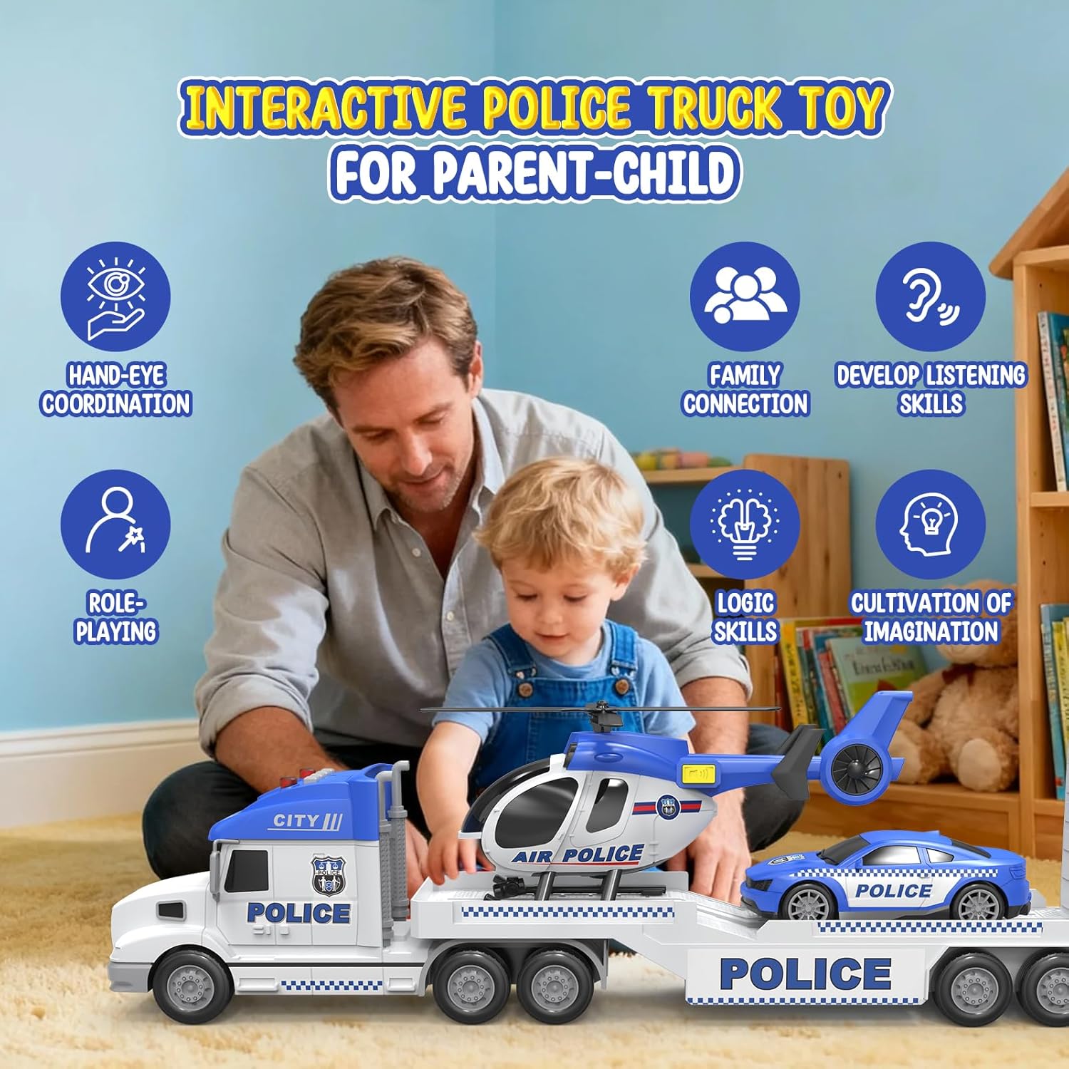 | Additional Features | 27" Large Semi Truck Toys for 3 4 5 6 Year Old Boys, 3-in-1 Friction Powered Transport Vehicle, with Flashing Lights and Realistic Traffic Sounds, Interactive Helicopter and Race Car |