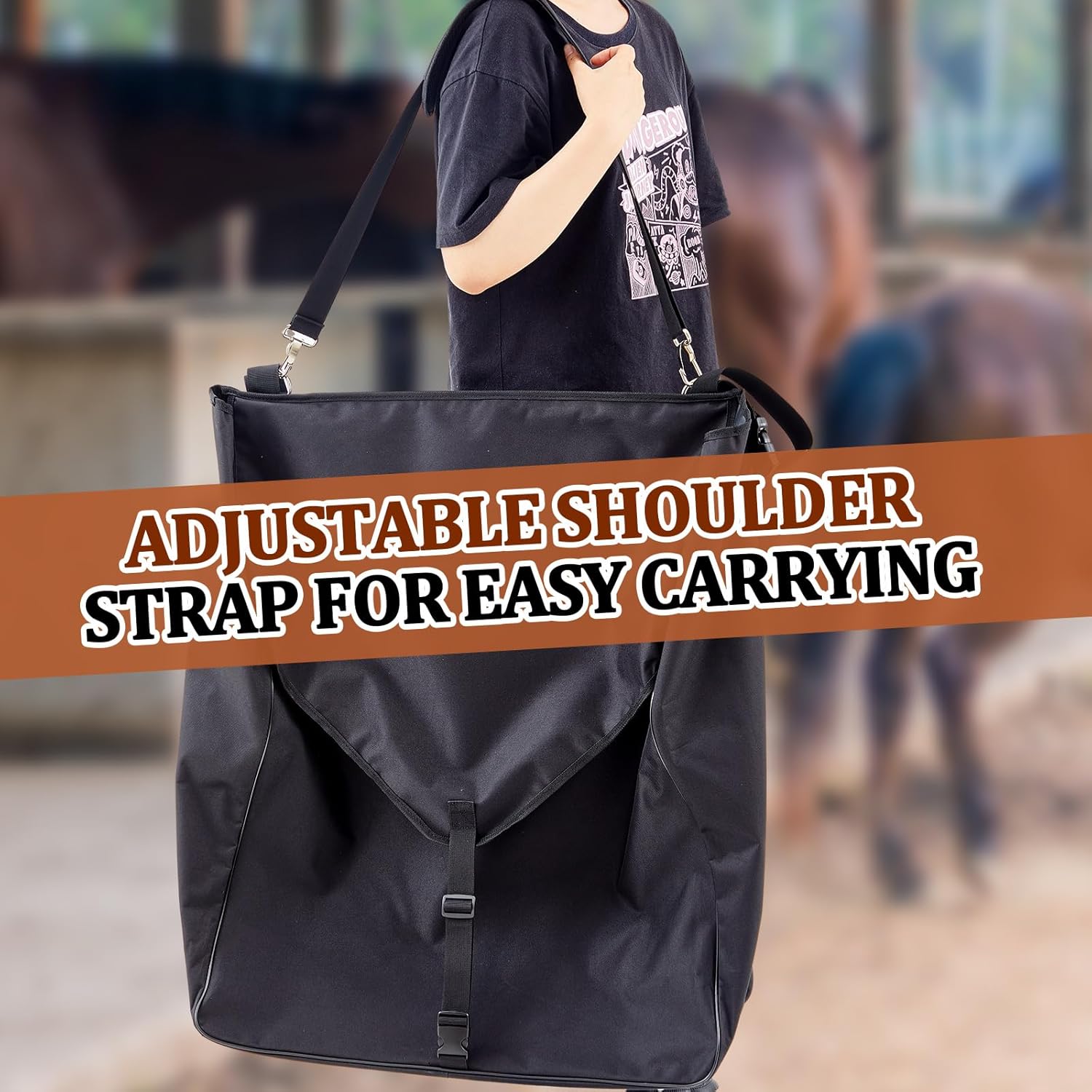 Features: Strategic Inner Elastic Pockets: The bag includes inner elastic pockets tailored to keep smaller items such as wraps, boots, and brushes within easy reach. This intelligent feature enhances accessibility and organization, allowing you to find and retrieve essential tools swiftly. Long Flap: An extra long fold-over flap acts as a shield, keeping dust and debris out of the bag. This protective design not only prolongs the lifespan of your items but also aids in maintaining a clean and orderly space within barns and trailers. Specifications: Material: 600D Oxford cloth Color: black Size: about 29.5 x 24.5 x 9 inches/ 74.93 x 62.23 x 22.86 cm Package includes: 1 x Large horsewear bag Notes: Manual measurement, please allow slight errors on size. The color may exist a slight difference due to different screen displays.
