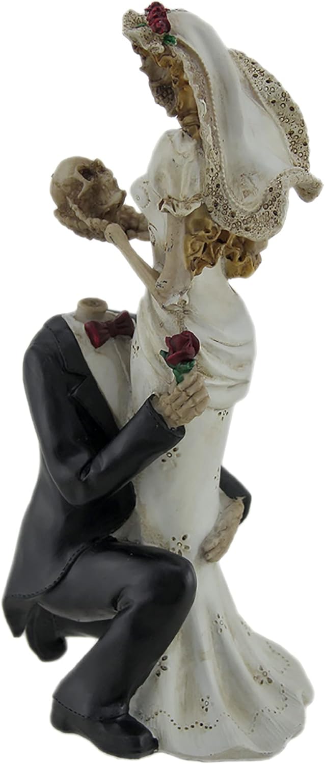 This awesome `Til Death Do Us Part` statue features a groom on one knee, offering a rose to the bride, while the bride holds the groom's skull in her hands. The statue makes a great wedding or anniversary present. It measures 11 1/2 inches tall, 5 1/2 inches long and 4 1/2 inches deep. It is hand-painted, and shows incredible detail.