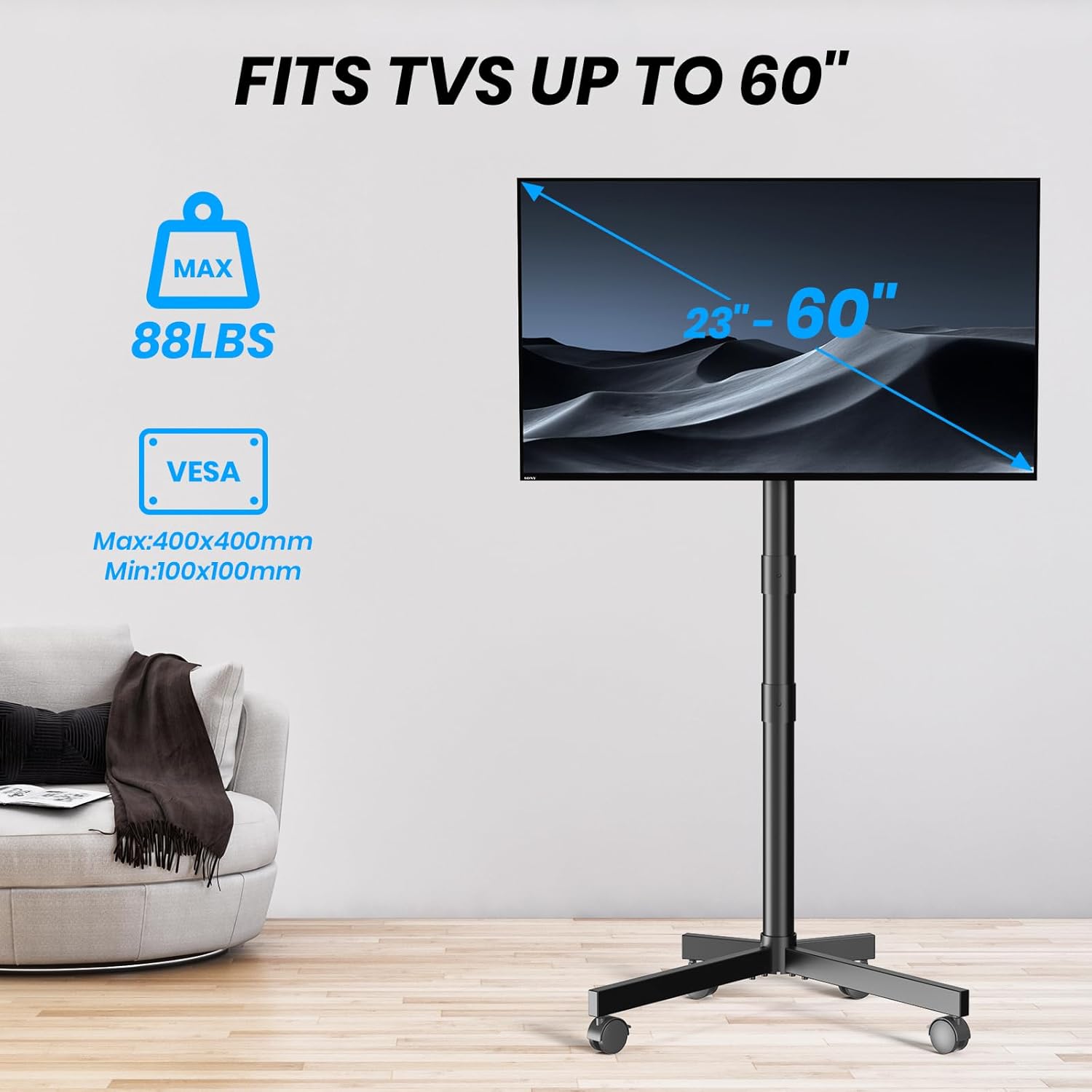Universal Compatibility for Various TV Sizes: The Xyndyx rolling TV cart is compatible with most 23" to 60" LCD, LED, and curved flat screen TVs, compatible with popular brands like Samsung, LG, Sony, and more, supporting up to 88 lbs. Its space-saving design and mobility make it ideal for use at home, in the office, or in commercial settings. Customizable Viewing Experience: Featuring adjustable TV brackets, the Xyndyx TV cart allows for easy height adjustments, ensuring a personalized and comfortable viewing experience. The media shelf can hold devices like laptops, gaming consoles, or DVD players, adding extra convenience. Sturdy and Secure Construction: Made with high-grade steel, this mobile TV cart offers reliable stability. The heavy-duty structure supports TVs up to 88 lbs, while the lockable caster wheels ensure smooth mobility and a stable base when stationary. The durable construction and safety locks provide peace of mind, keeping your TV secure in any environment. Effortless Mobility for Any Space: With its 360° rotating wheels, the Xyndyx rolling TV stand easily moves from room to room. Whether you need to switch between your living room, conference room, or classroom, this portable TV stand provides smooth, hassle-free transport. Quick and Easy Assembly: Setting up the Xyndyx TV cart is quick and straightforward. The package includes all necessary hardware, detailed instructions, and adjustable brackets for an easy and seamless installation process.