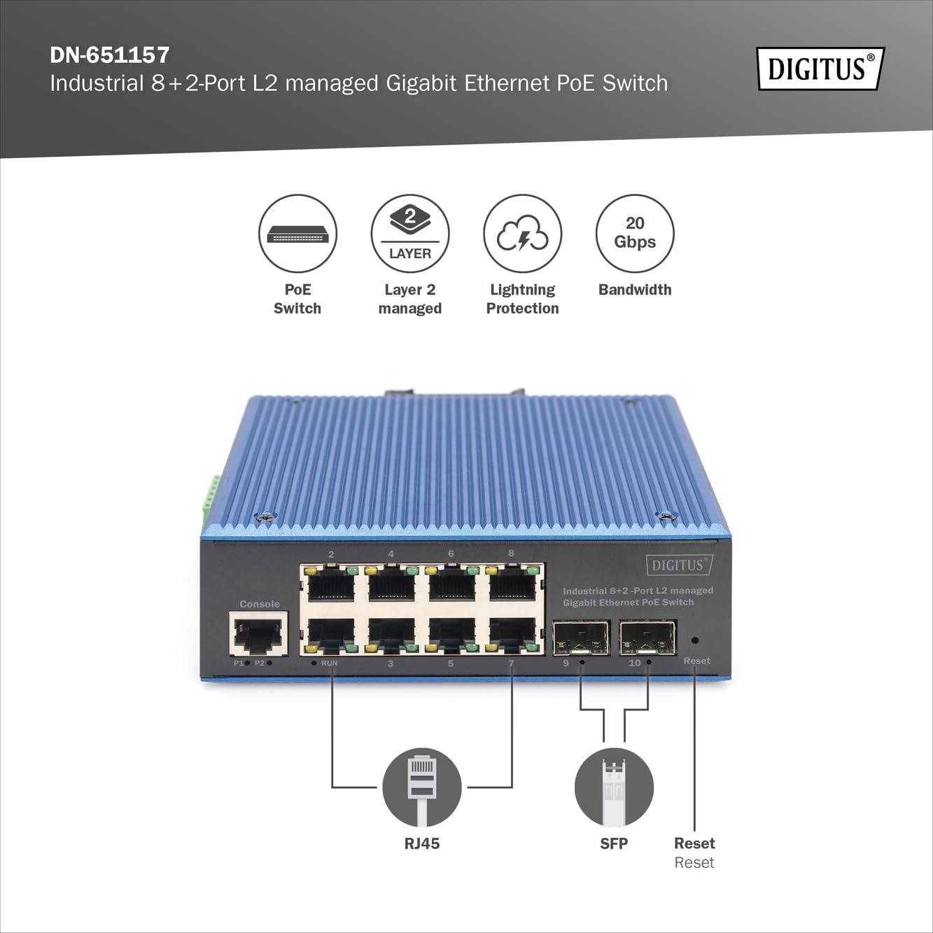 The Digitus DN-651157 Ethernet Switch with 8 RJ45 interfaces as well as 2 SFP Uplinks offers numerous Layer 2 port functions for optimal network performance. Supports flow control, Link Aggregation and different routing strategies. The switch allows VLAN management, supports Spanning Tree protocols and ensures quick reset in case of failures. With IGMP and MLD-Snooping you can optimize multicast data traffic. The switch offers extended security features, such as ACL, and supports QoS for prioritizing data traffic. Extensive management options, such as SNMP and CLI, let you stay in control. RJ45 ports can power connected PoE devices with a maximum of 30W each. Our switch is a reliable network solution with advanced features to meet your needs.