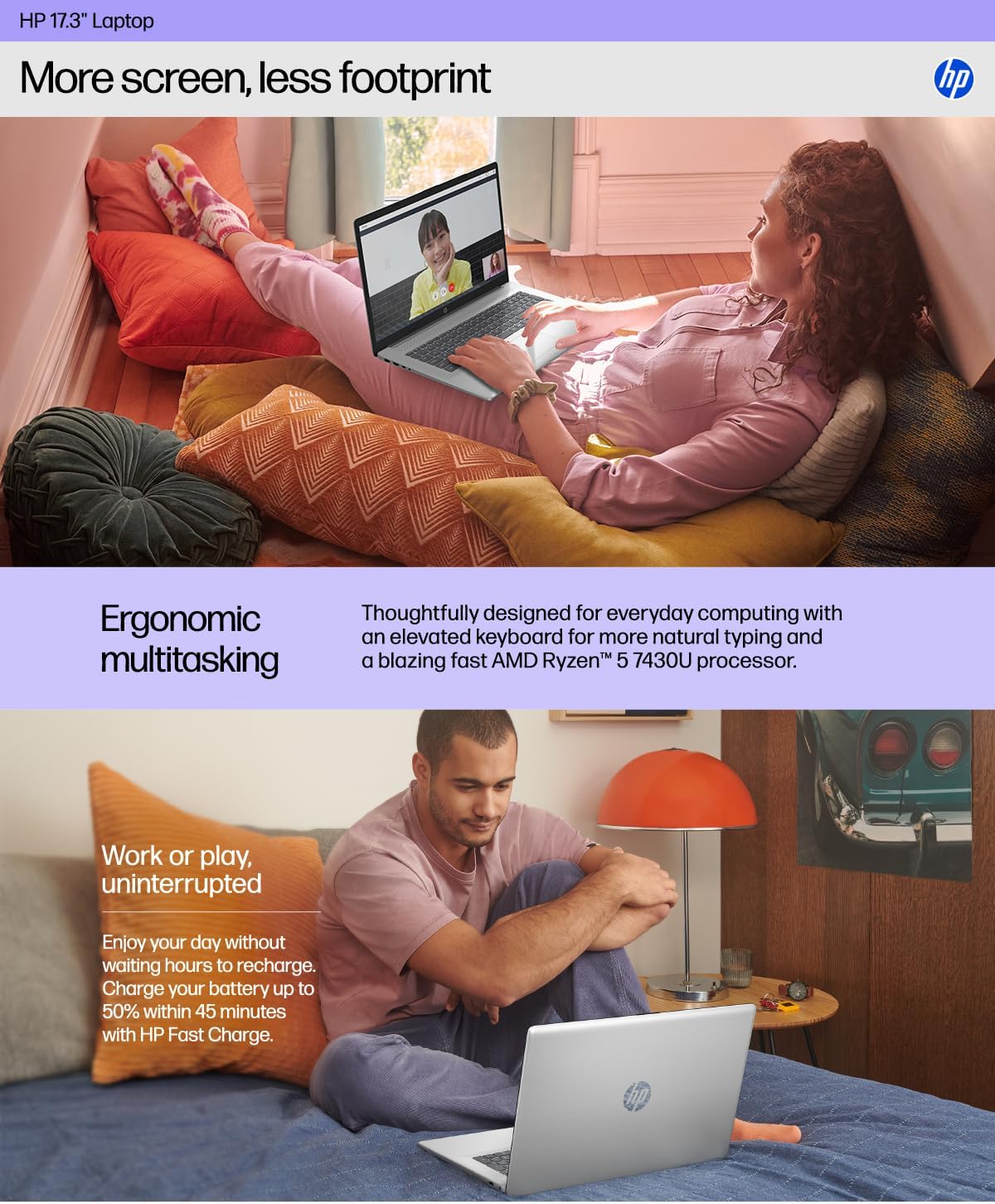 Statement:Original Seal is opened for upgrade ONLY. If the computer has modifications, then the manufacturer box is opened for it to be tested and inspected and to install the upgrades to achieve the specifications as advertised.Brand:HPModel:17-cp3155clProcessor:AMD Ryzen 5 7430UProcessor Brand:AMDCommunications:Wi-Fi 6 (2x2) and Bluetooth® 5.4 wireless cardHP True Vision 720p HD camera with temporal noise reduction and integrated dual array digital microphonesHD Audio with stereo speakersGraphics & Video:17.3-inch diagonal, HD+ (1600 x 900), touch, anti-glare, 250 nits, 60% NTSCAMD Radeon™ GraphicsKeyboard:Full-size, soft grey keyboard with numeric keypadHP ImagepadPorts & Slots:1 USB Type-C® 5Gbps signaling rate2 USB Type-A 5Gbps signaling rate1x HDMI 1.4b1x Headphone/Microphone Combination Jack1 AC Smart pinPower Supply:3-cell, 41 Wh Li-ion battery45 W AC power adapterDimensions: 15.78" W x 10.15" L x 0.81" HApproximate Weight: 4.82 lbs