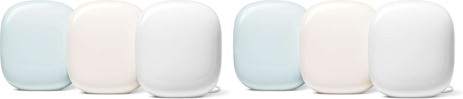 Google Nest Wifi Pro gives you super fast, reliable WiFi 6E coverage for your entire home.[1] One WiFi router provides up to 2200 square feet of fast, reliable WiFi[2], and you can customize your setup to create a mesh WiFi system for the coverage you need. It automatically adjusts your WiFi network’s performance to keep things running smoothly. It’s so smart it can monitor and diagnose common issues on its own. And it has privacy and security features to help keep you and your family safe. LEGAL [1]Up to 2x faster as compared to a Wi-Fi 6 router that supports 80 MHz channels. Wi-Fi 6E specifications are based on use of a Wi-Fi 6 or later generation client device that supports 160 MHz channels. Actual speeds depend on your internet service provider, network conditions, connected device, local regulations and environmental factors. [2]Router placement and home size, materials and layout can affect how Wi-Fi signal travels. Poor placement and larger homes or homes with thicker walls or long, narrow layouts may need extra Wifi routers for full coverage. Strength and speed of signal will also depend on your internet provider. More than 5 routers in a network may result in degraded performance and is not recommended. [3]A Wi-Fi 6E client device is needed to directly access the 6 GHz band, which is limited to indoor use only. [4]Actual speeds depend on your internet service provider, network conditions, connected device, local regulations and environmental factors. [5]Based on product weight. [6]Check go.co/nest/matternow for availability of Matter’s functionality on Nest Wifi Pro. [7]Nest Wifi Pro should only be used indoors. [8]Nest Doorbell and Chromecast with Google TV sold separately.