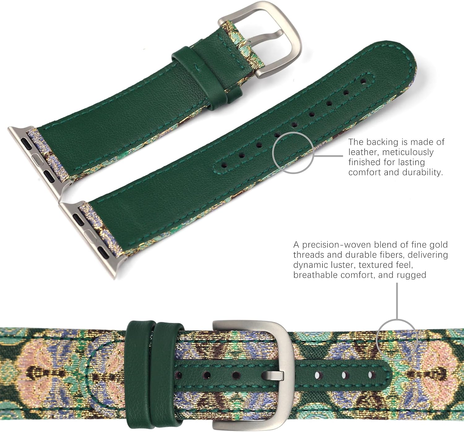 This limited-edition Apple Watch band combines handwoven gold-thread fabric with premium leather, featuring an exclusive green butterfly pattern. Each piece is handcrafted, giving every band a unique and artistic character. The gold-thread weave offers a soft, durable sheen, while the leather backing provides breathable, all-day comfort. Hardware is available in Silver, Rose Gold, or Black to match your watch style. Compatible with most smart watch models, including Apple Watch sizes 46/44/45/49mm and 42/40/41/38mm. Band length approx. 15.5–20cm with an adjustable buckle. Quick, secure, tool-free installation.
