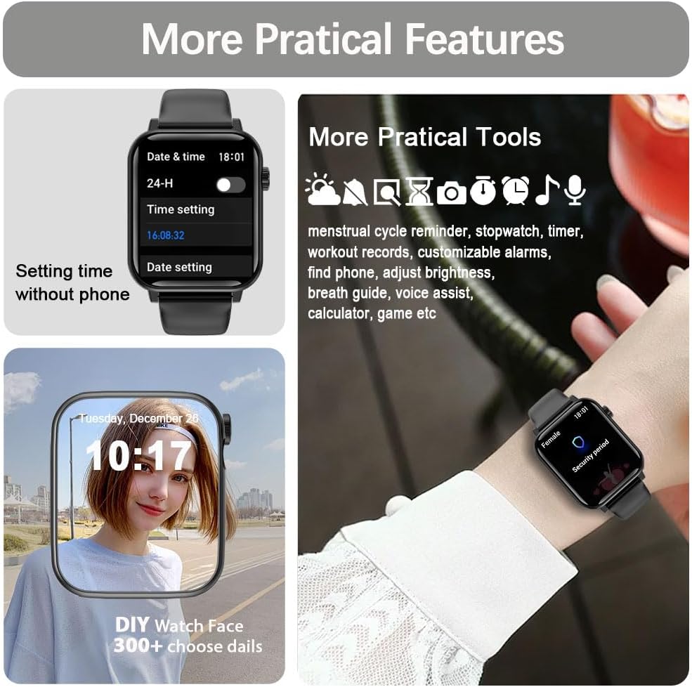 | Additional Features | Activity Tracker, 1.96" Big Screen, 500mAh Large Battery, Blutooth Phone Calls, Built-in Speaker & Mic, 110+ Sports Mode, Heart Rate Monitor, Blood Pressure Measure, Blood Oxygen Monitor, Sleep Tracker, Long Time Standby, Weather Forecast, Music Control, Sedentary Reminder, Remote Camera Shooting, Alarm Clock, Voice Assistant, Breath Guide, Timer, Stopwatch, Calorie Counter, Notifications, Cycle Tracking, Time Display, Touch Screen |