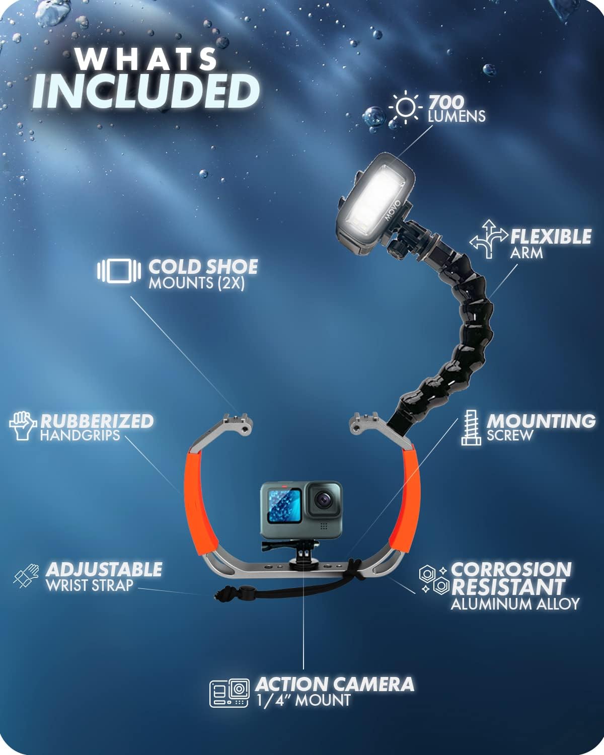 | BuiltIn Media | Underwater Action Camera Cage Rig, Waterproof LED Video Light, Flexible Mounting Arm |