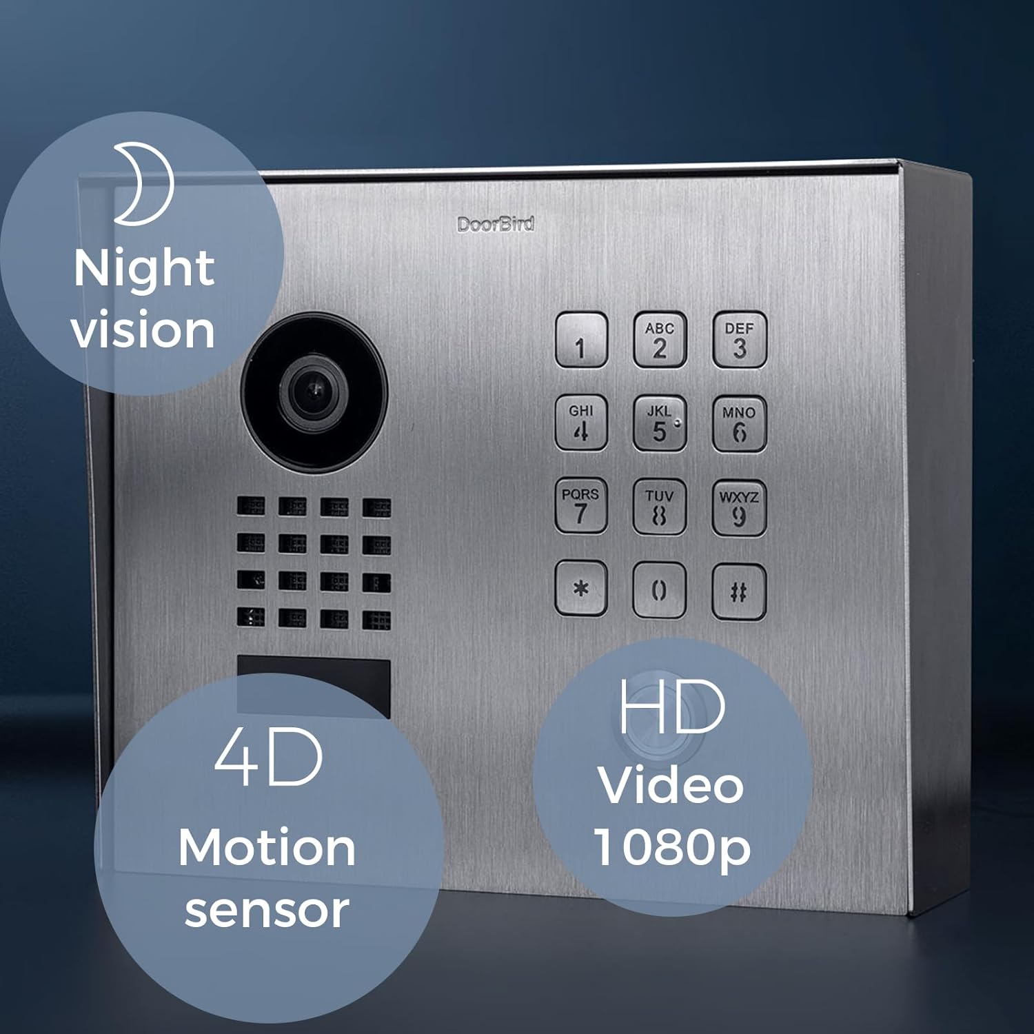 Surface-mounting housing includedLAN connection (PoE compatible)2-way audioUltra-wide angle lens, 1080p, night vision, IR LEDs4D motion sensorKeypad1 freely configurable bistable switching relay