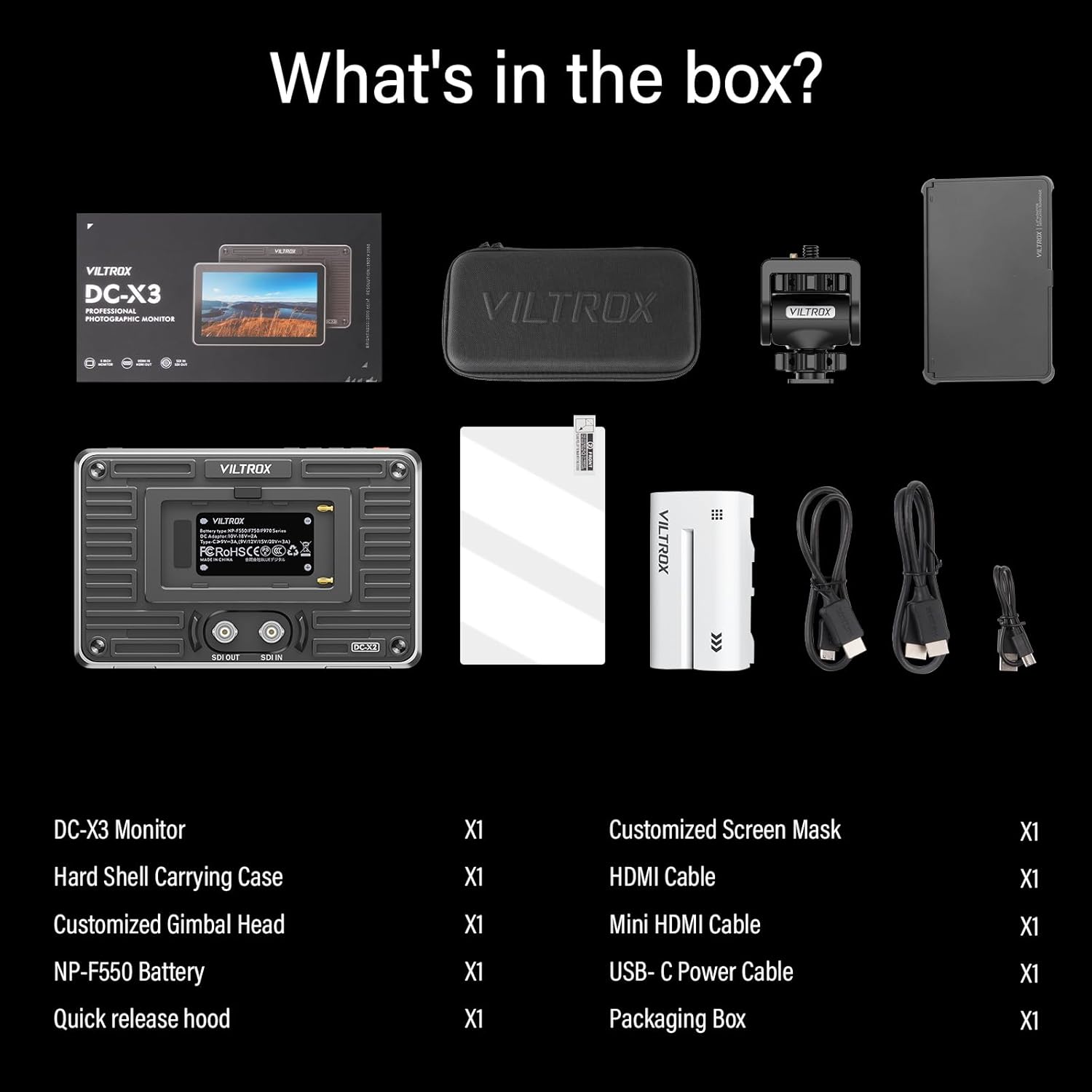 | BuiltIn Media | 1x Custom screen protector, 1x DC-X3 6" touchscreen monitor with Sun Hood, Ball head, 1x HDMI cable, 1x Mini-HDMI cable, 1x USB-C power cable, 1x Hard-shell carrying case, 1x NP-F550 battery |
