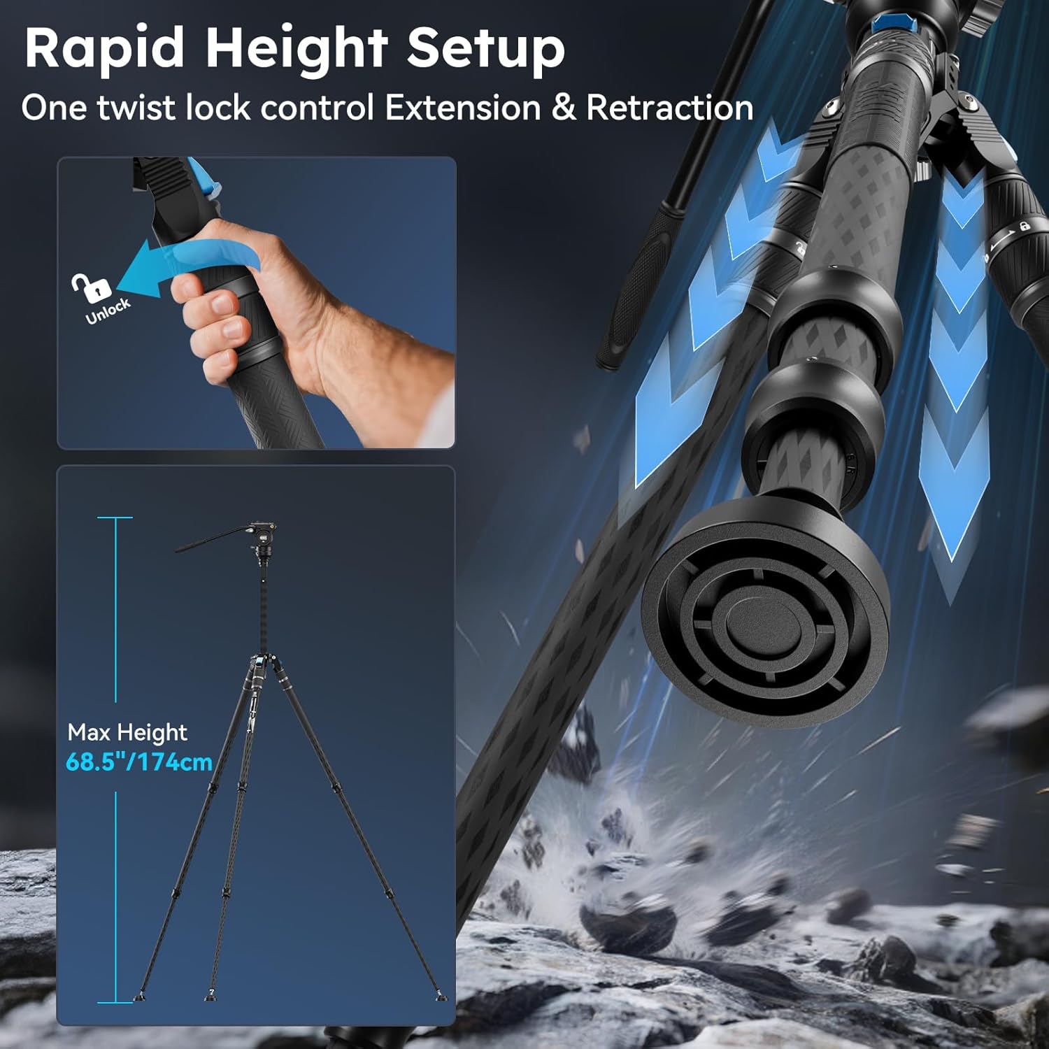 | Features | Carbon Fiber Legs, Compact/±15°Leveling/with Fluid Video Head Kit, Modular Design, One-step Height Adjustment, Triangular Center Column |