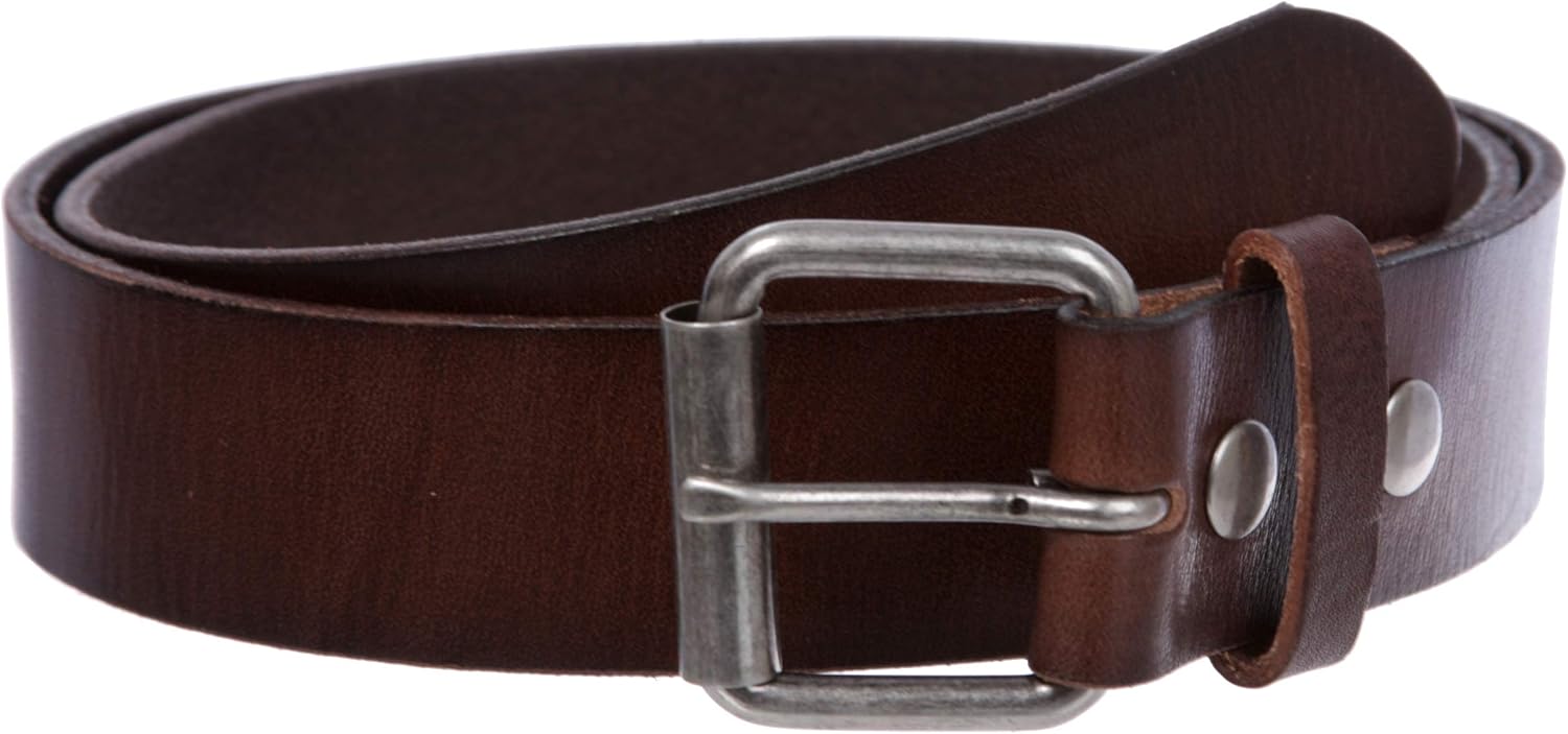 *This classic jean belt is made with 100% oil-tanned leather and snap on removable roller buckle that allows you to change most buckles at our store *Available colors: black/antique silver, brown/antique silver, dark brown/brass, tan/antique silver, dark navy/antique silver and red with silver hardware. *Width: 1 1/2" *Sizing: the size indicates the length from buckle fold to the center hole, excluding buckle length. There are total of five holes, 1" apart. It is recommended to select size from buckle fold to center hole that better matches measurement of your waist or where you wear this belt. It would be more comfortable to measure where you will wear the belt, add 1-2", and then pick the size where this number falls.