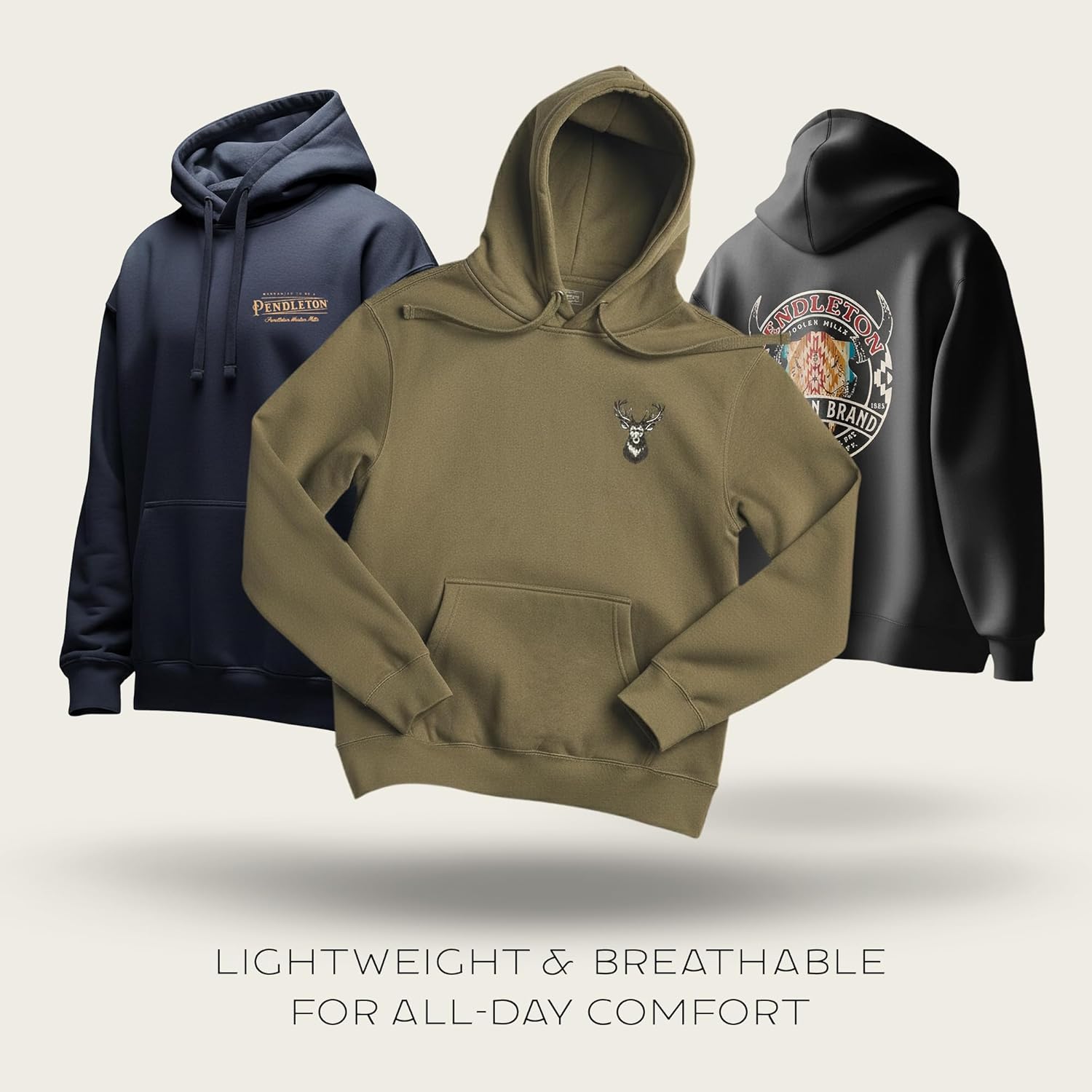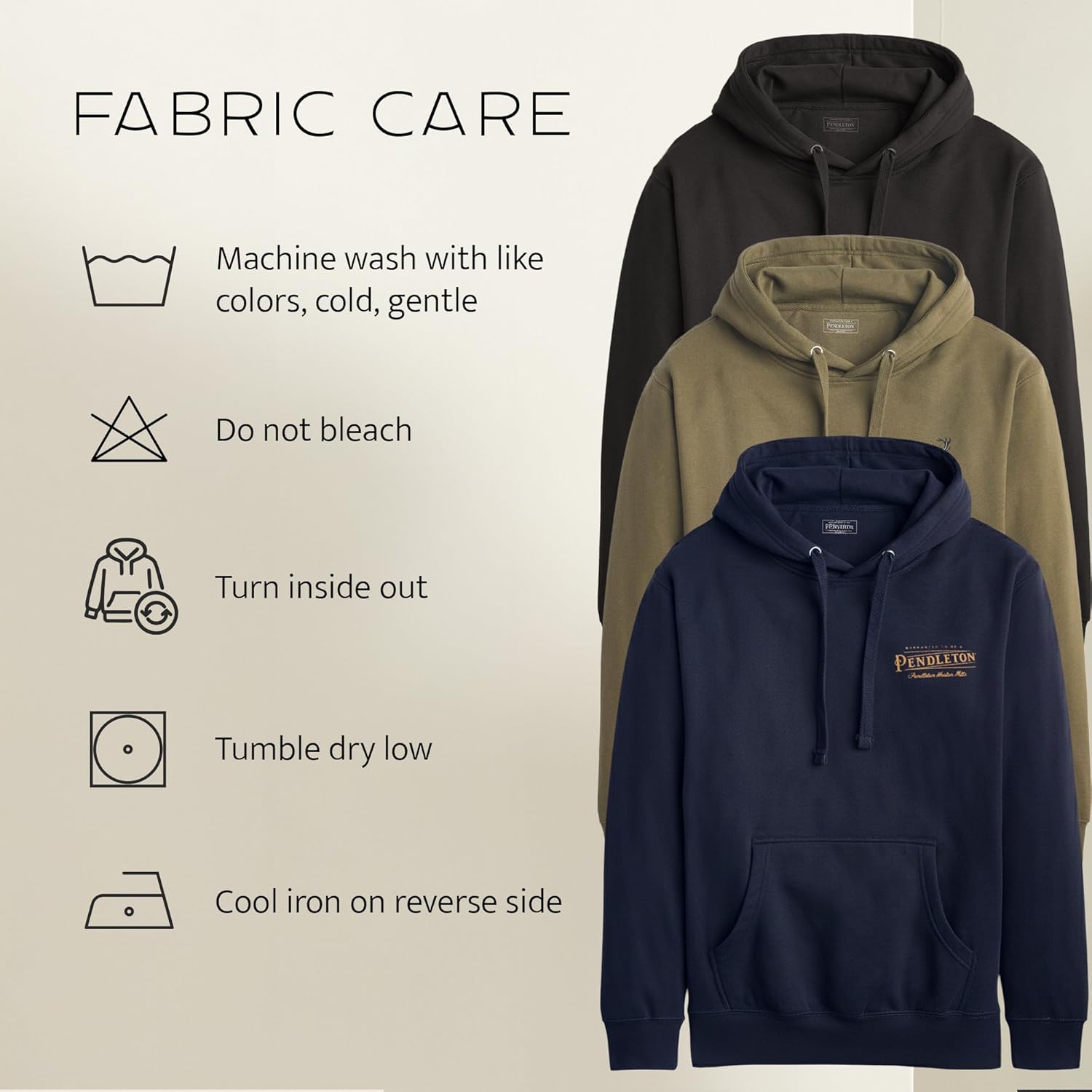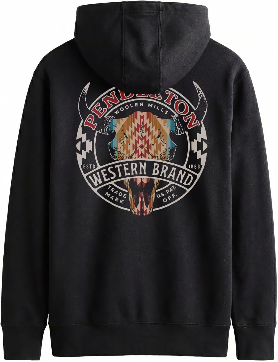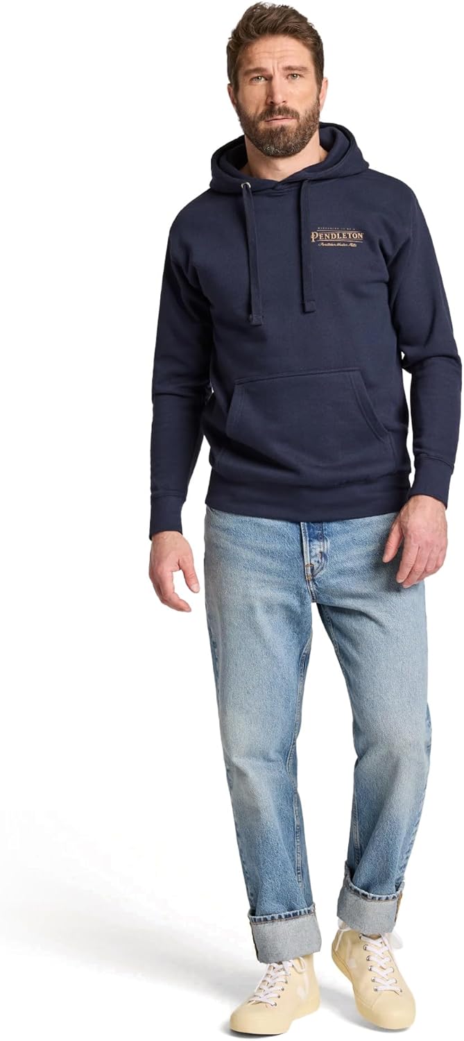 Embrace the legacy of the American West with the Pendleton Heritage Logo Hoodie. This comfortable and stylish top with a hood proudly displays exclusive Pendleton designs. You can find the unmistakable Pendleton logo prominently displayed on the chest and back, letting you showcase your classic styleThe comfortable black hoodie for men offers added warmth and protection, with adjustable drawstrings for a personalized fit. Practicality is further enhanced by the spacious kangaroo pocket at the front, providing a convenient place to warm your hands or keep small essentials close at hand. Perfect for layering on cooler days or as a standalone statement piece, this lightweight sweat top allows you to carry a piece of Pendleton's enduring story with you.Its durable construction and timeless designs make it a reliable and cherished addition to any wardrobe. And it’s machine washable, making care a breeze.Experience the enduring appeal of Pendleton in a comfortable and stylish hooded sweatshirt.