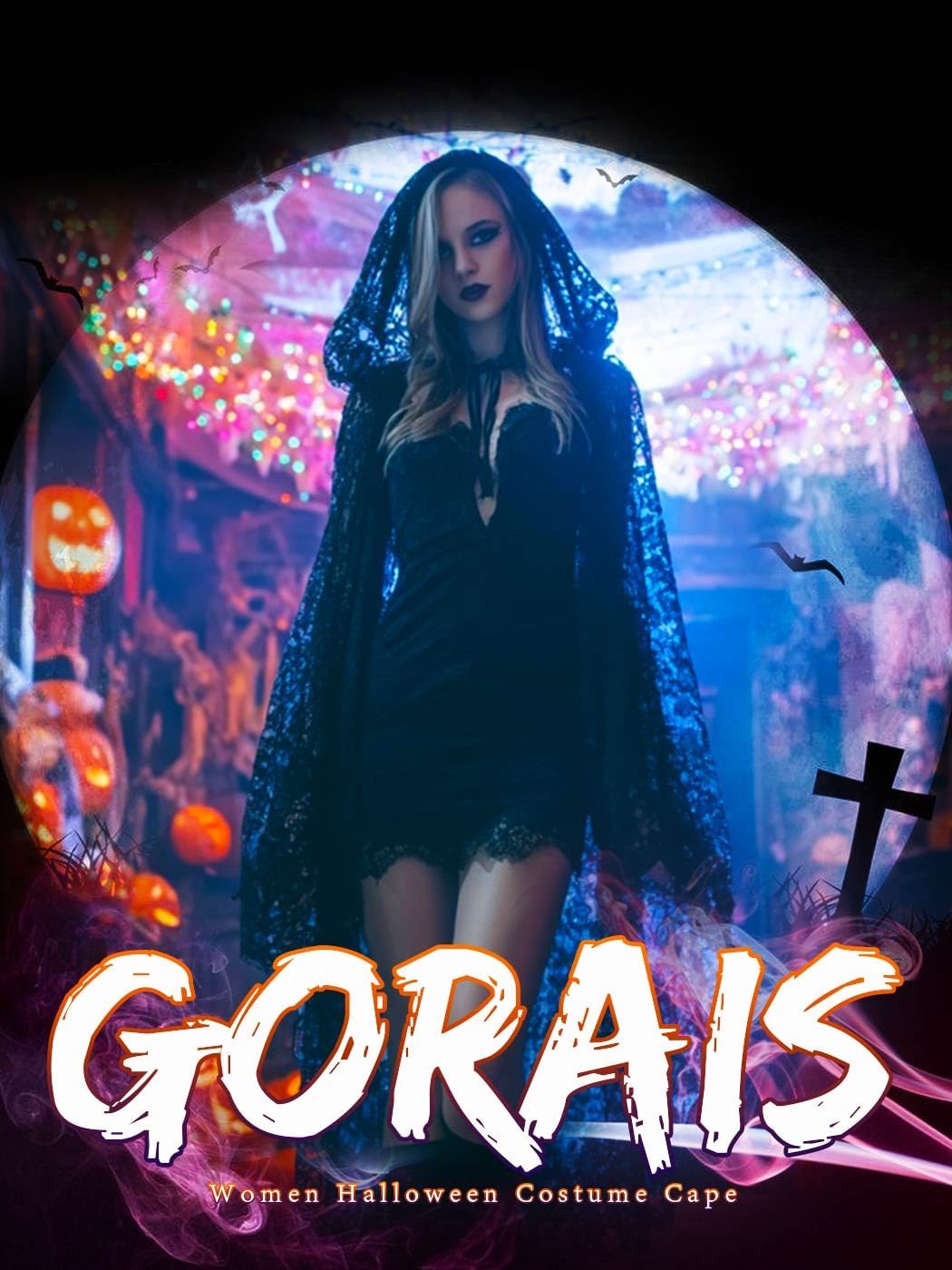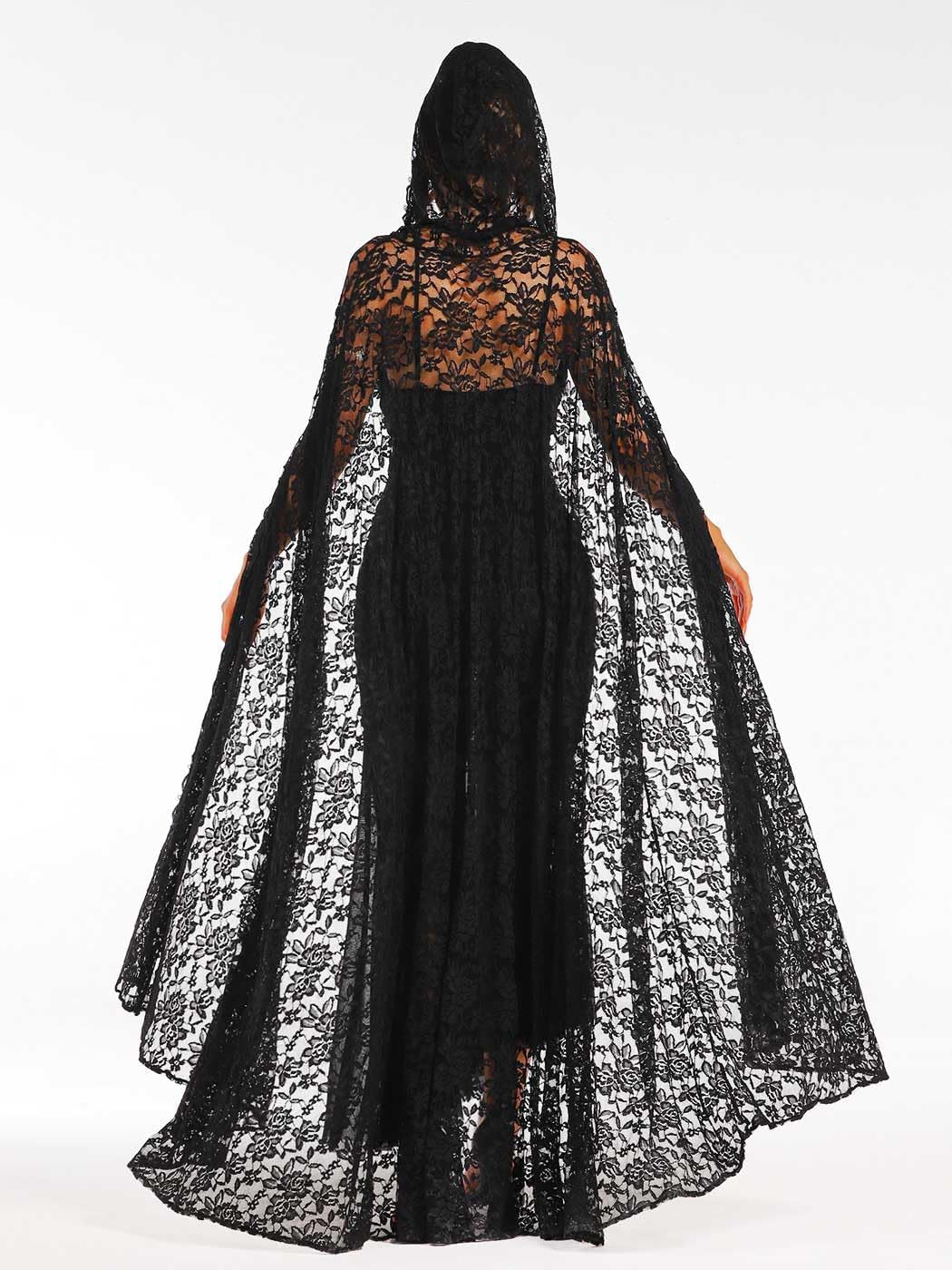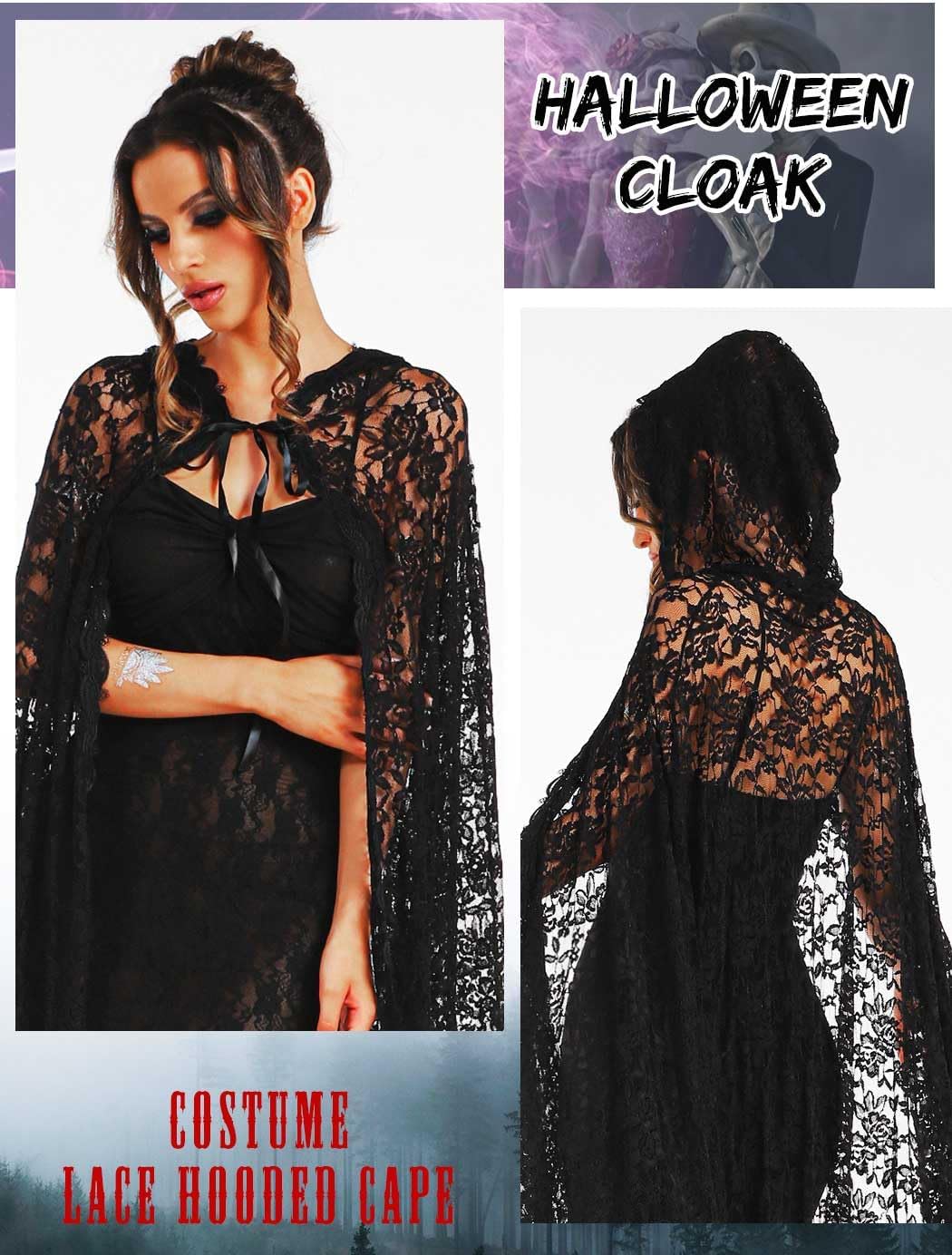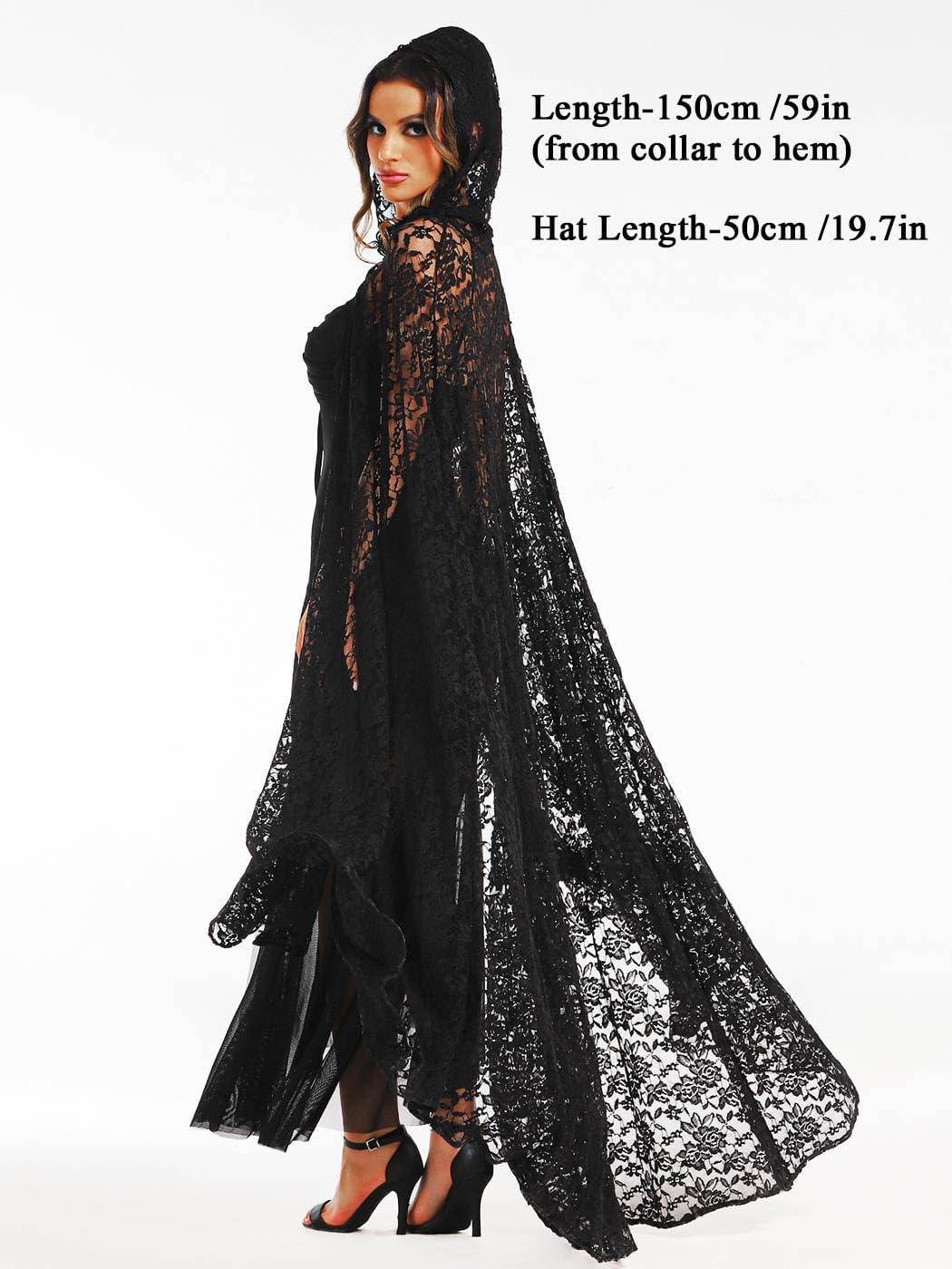 GORAIS Black Lace Hooded Cape Long Halloween Witch Costume Cloak for Women.