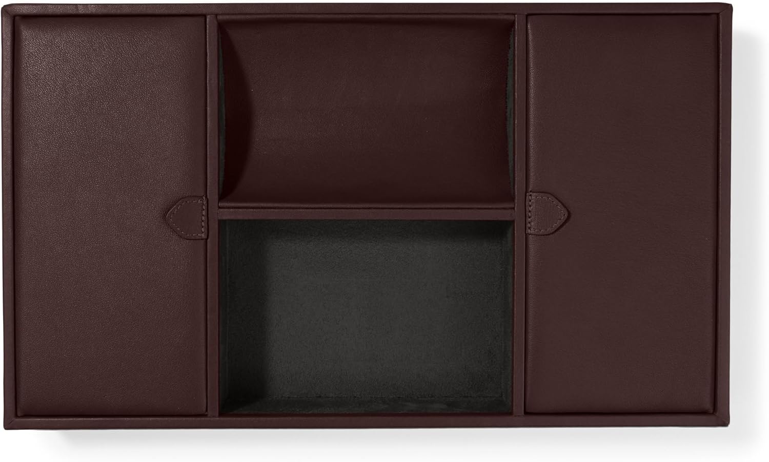 Simplify your routine and elevate your space with the Deluxe Valet Tray, a luxurious organizer crafted from full-grain leather and lined with soft microsuede. Designed for versatility, this tray is perfect for bedrooms, closets, or bathrooms—keeping your jewelry, watches, cuff links, and everyday accessories organized and accessible. It features two exterior compartments—one flat for your phone and one rounded for coins—plus two covered compartments, including one with four divided slots for smaller pieces. Measuring 8.3""H x 14.25""W x 1.8""D, it offers ample space without sacrificing elegance. Stylish, practical, and built to last, the Deluxe Valet Tray is the perfect blend of sophistication and function for your daily essentials.