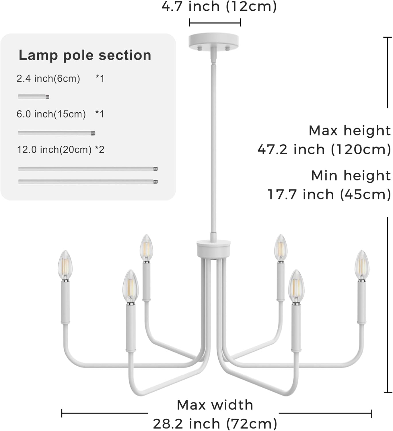 This white farmhouse chandelier blends rustic and industrial styles with 6 elegant lamp arms and a sturdy matte black finish. Made from high-quality materials, it’s available in black, gold, white, chrome, and brass to complement various décor styles. Easy to install with pre-assembled arms, it features adjustable height (17.5" to 47") for various spaces. Compatible with E12 bases and dimmable bulbs (bulbs and dimmer switch not included), it’s perfect for living rooms, kitchens, dining areas, and more.
