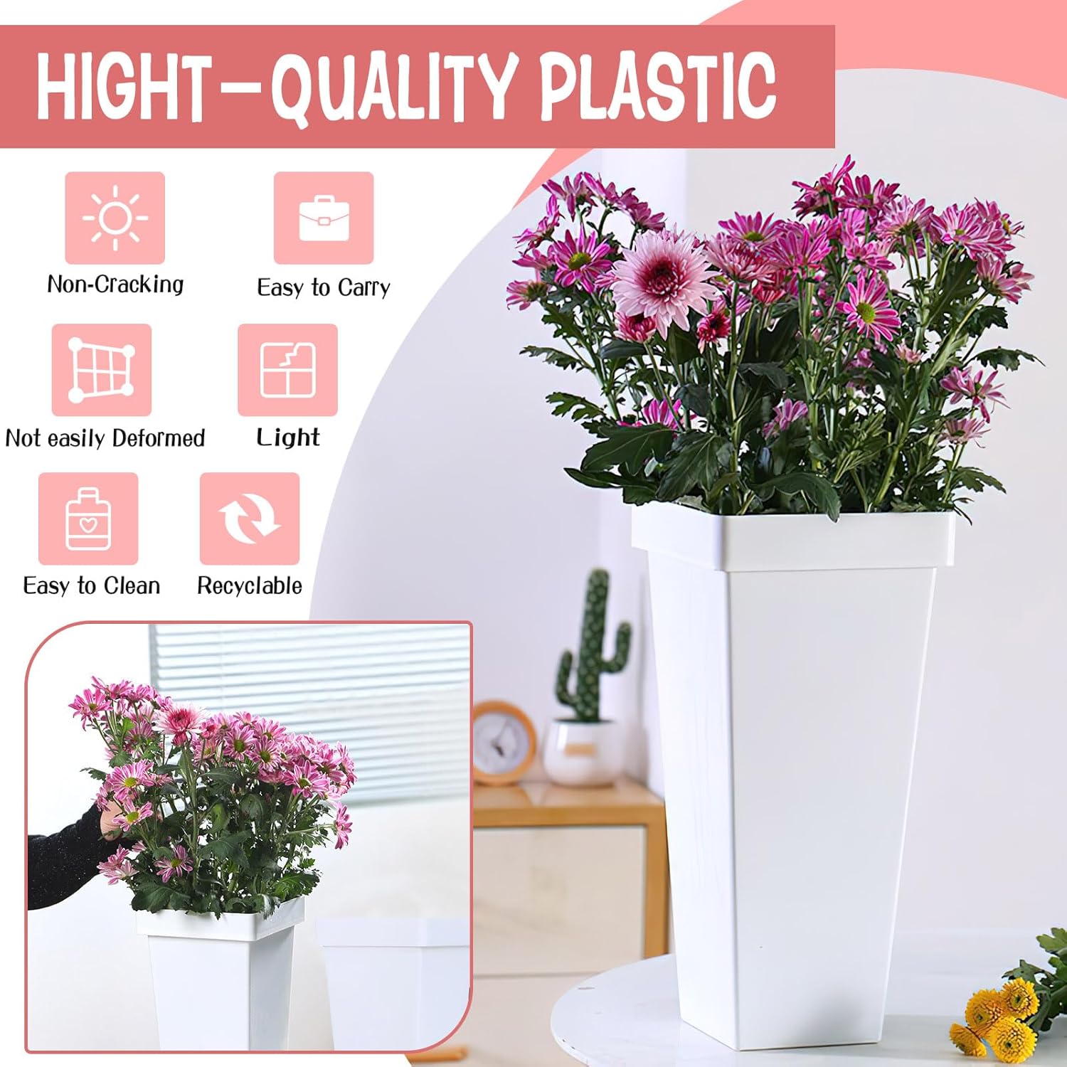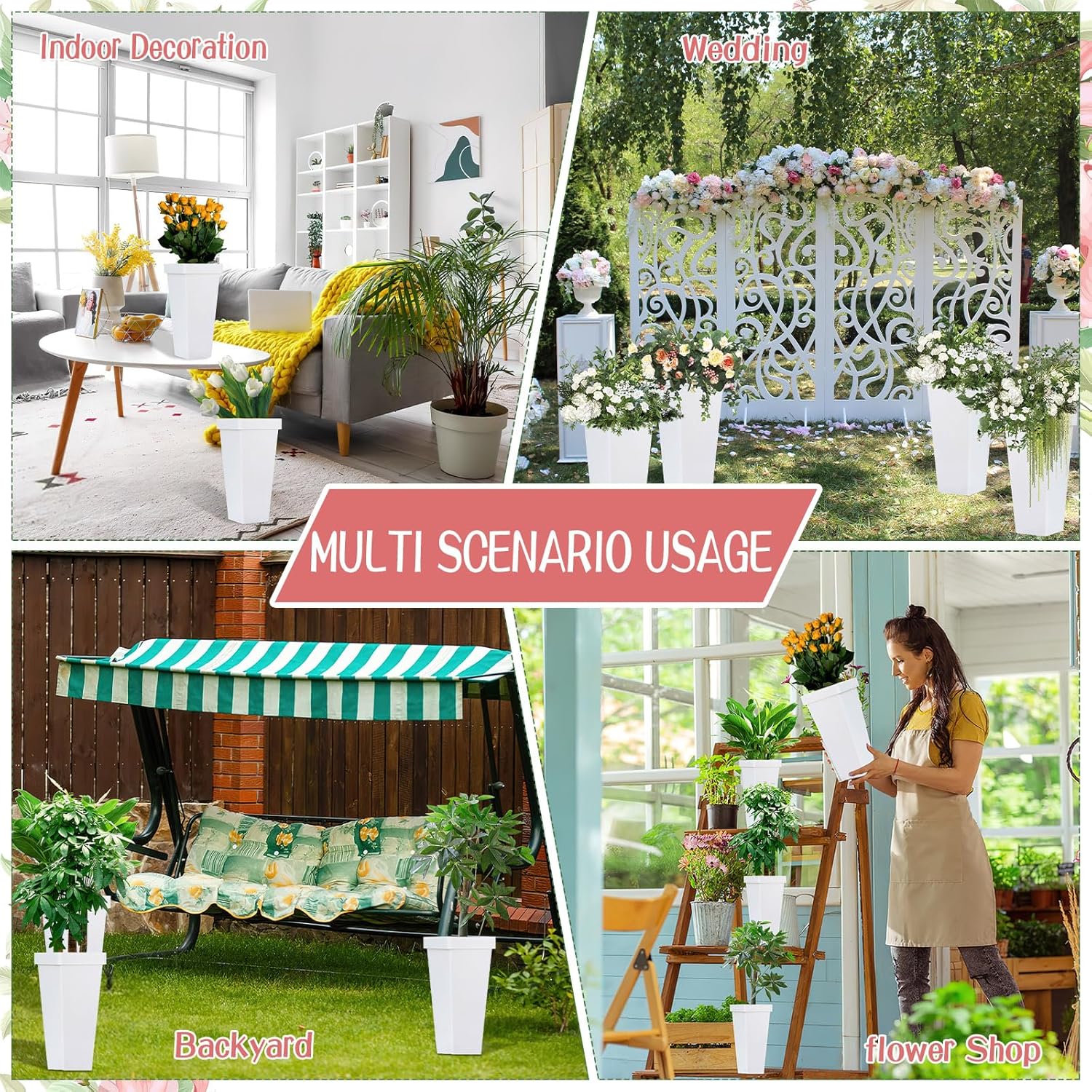 Features▪ Ideal for decorating weddings, events, home, office, party table centerpieces▪ Its minimal design and white finish make them match with any occasion.▪ Square bottom provides plenty of balance and stability, suitable for put on any even surface.▪ The containers do not have drainage holes, but you could easily drill through the bottom to create drainage holes for live planting useSpecifications▪ Material: Plastic▪ Shape: Square▪ Color:White▪ Dimensions: 6.69" Top Diameter, 4.3" Base Diameter, 13.4" Height▪ Package Contents: 8 x Plastic Buckets
