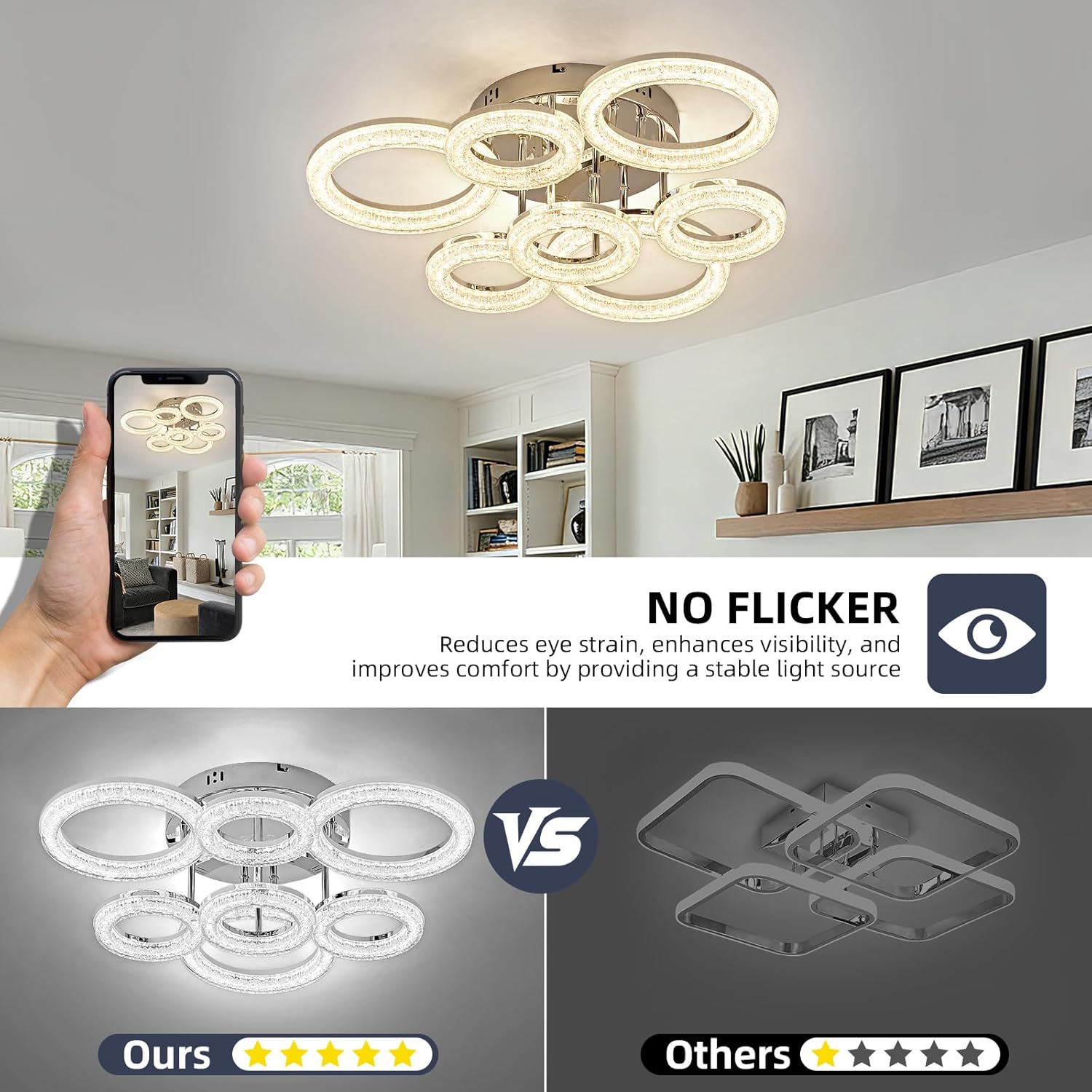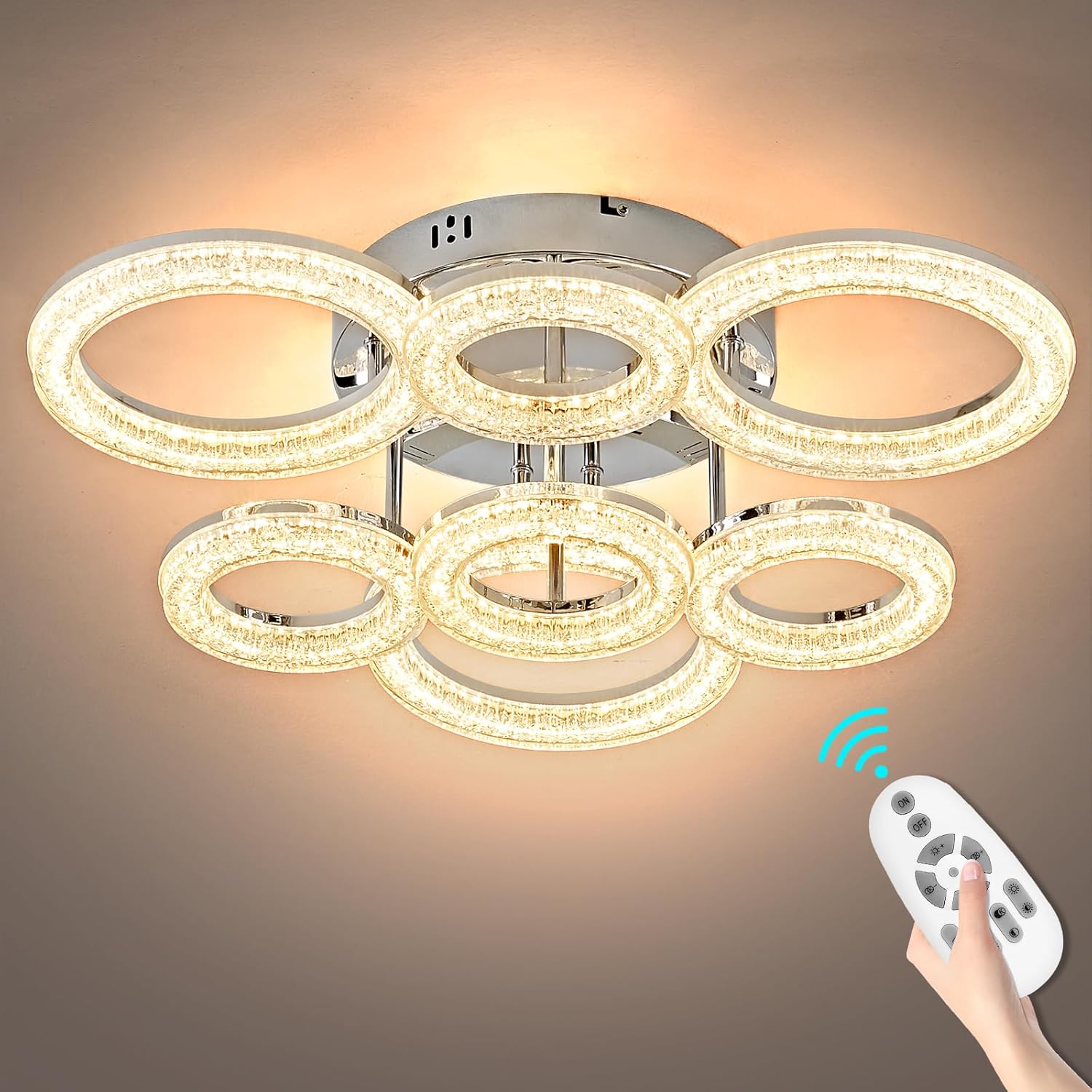 Modern LED Ceiling Light Flush Mount, 7 Ring Acrylic Dimmable Ceiling Fixture, 60W with Remote, Chrome Ceiling Light for Bedroom Living Room Dining Room
