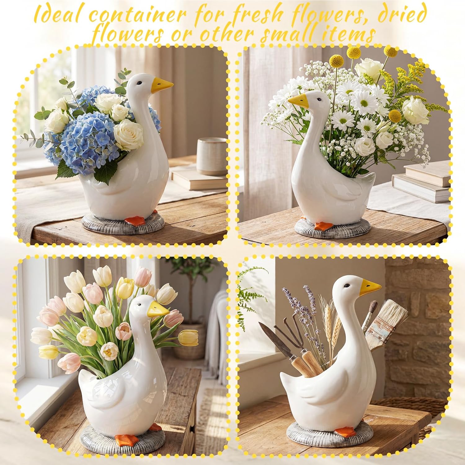 Features: One silly goose flower planter pot has a flat bottom, allowing it to stand firmly on a table and resist tipping, ideal for brightening up tabletops, desks, bookshelves, windowsills, mantelpieces, living rooms, bedrooms, offices, or any space that needs a cheerful atmosphere. This white goose bud vase is also an ideal gift for family or friends, conveying your care and best wishes. Whether it's a birthday, housewarming, party, holiday decoration, or any other event, this charming goose flower planter pot is sure to bring joy and add a touch of elegance to their living space. Specifications: Material: ceramic Color: white and orange Size: 12.6 inches in height, 7.09 inches in width Package includes: 1 x goose shaped decor vase Notes: Manual measurement, please allow slight errors on size. The color may exist a slight difference due to different screen displays