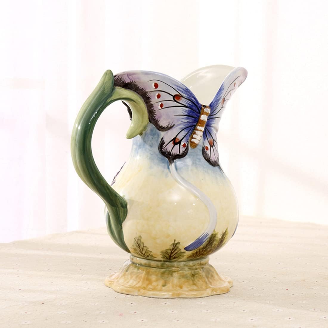 Large Ceramic Water Pitcher Flower Vase, Hand-Painted Purple Butterfly and Flowers Home Decor Bouquet Holder-9 Inches