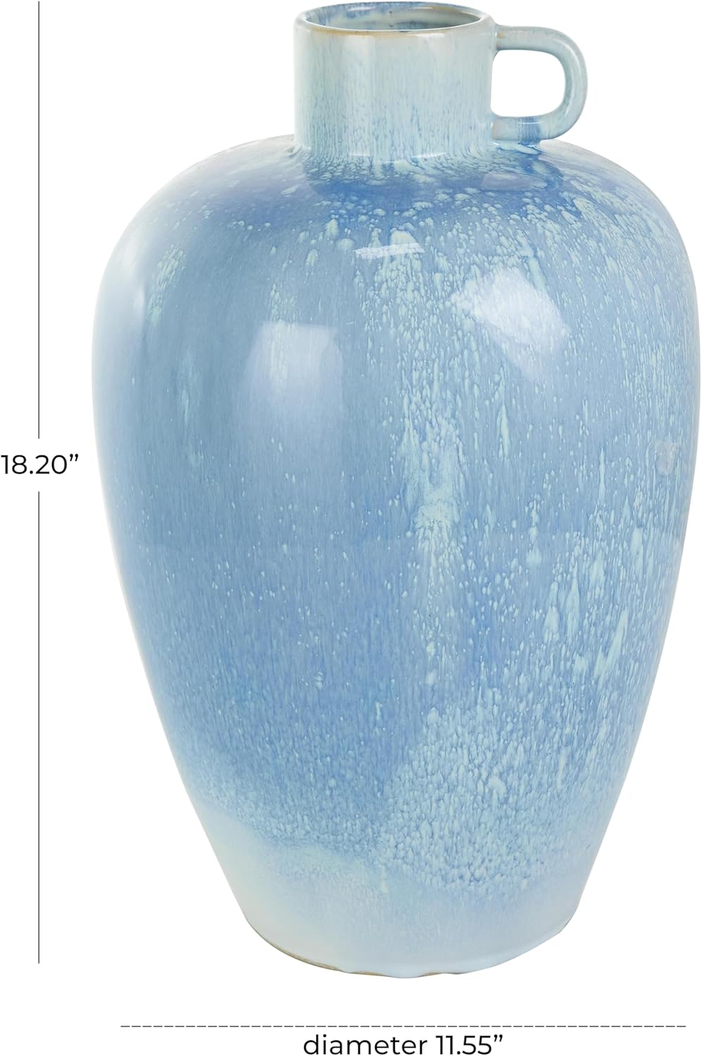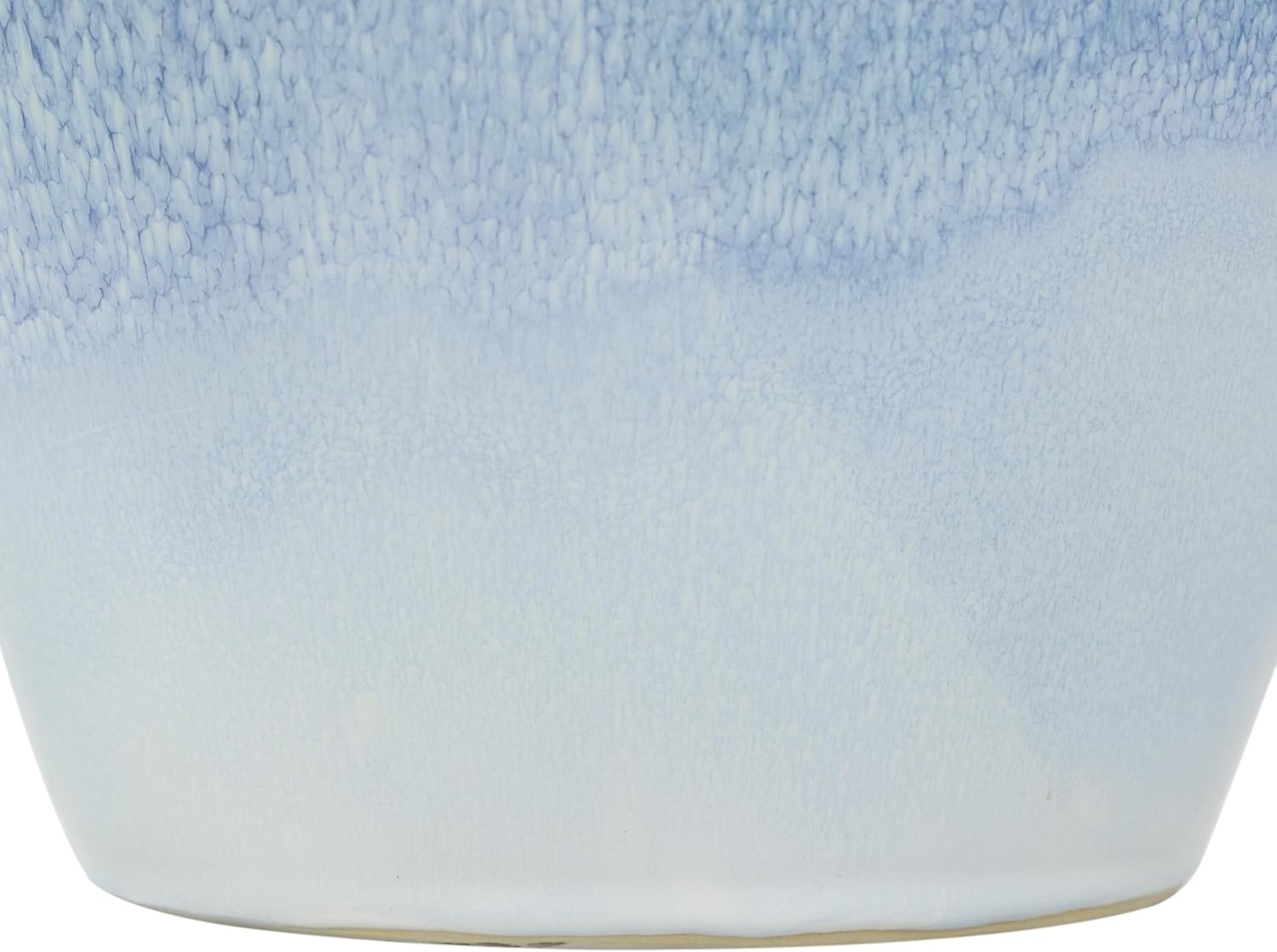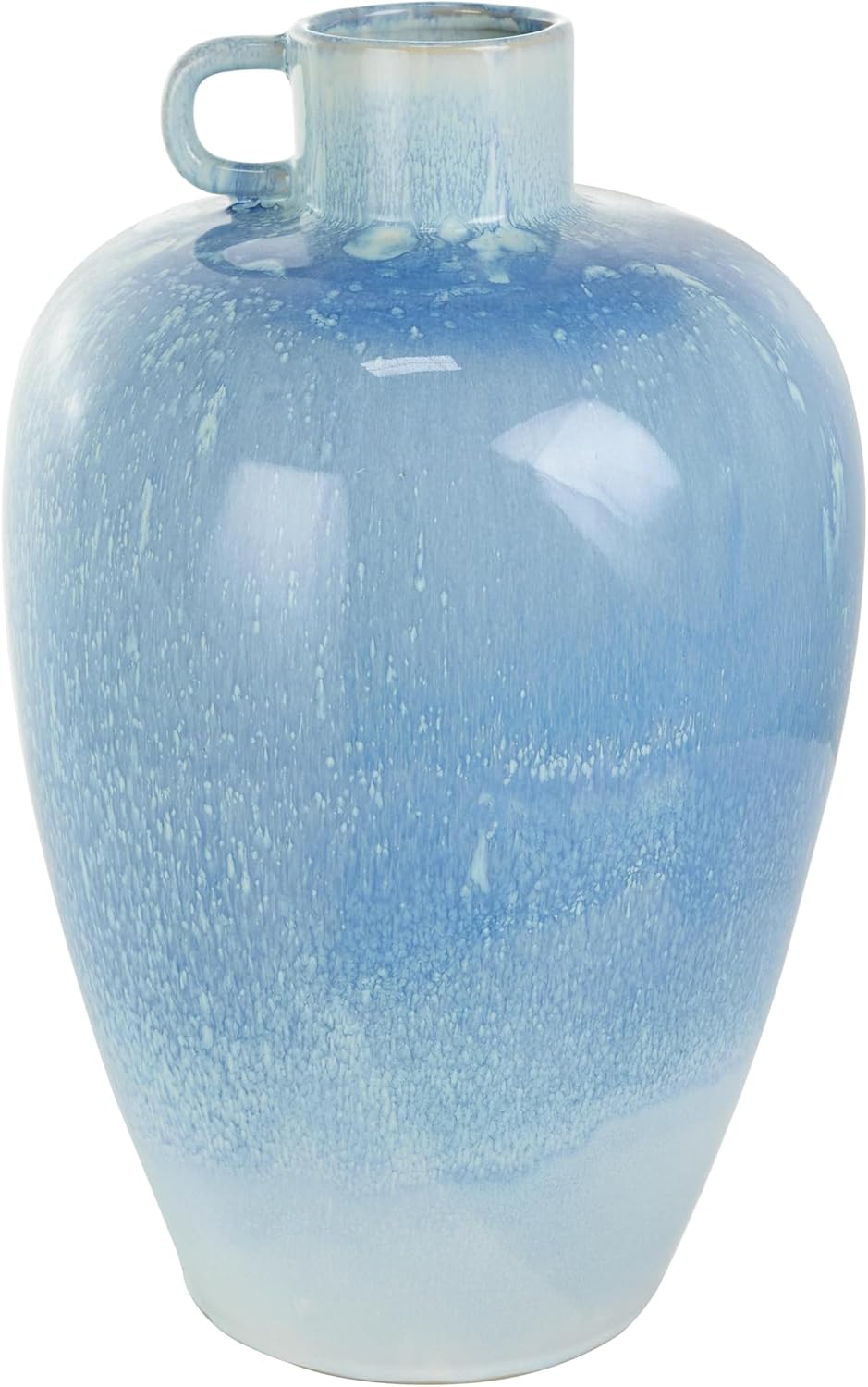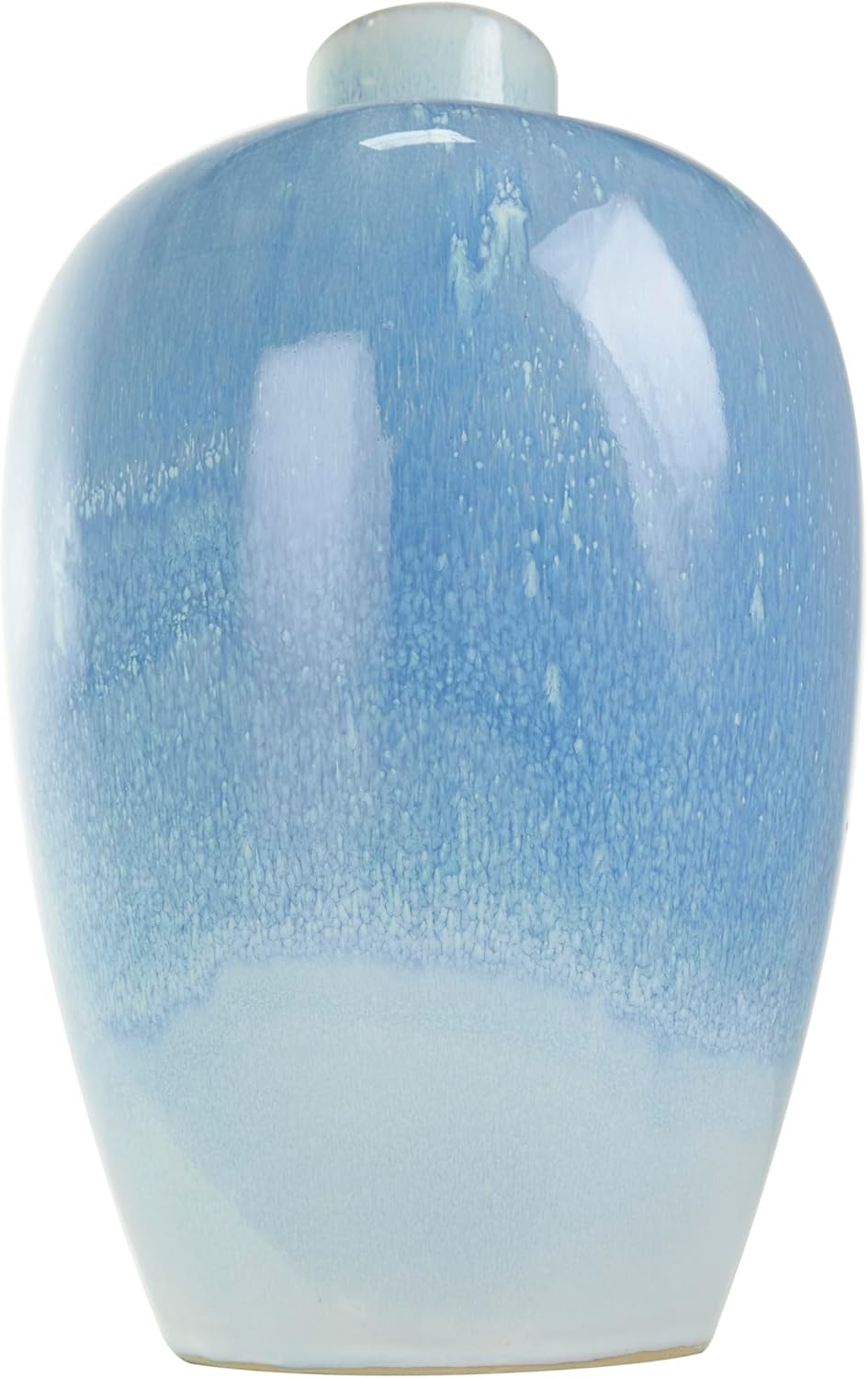 The modern vase for home decor is made from molded ceramic, ensuring each material complements the overall design. With its perfectly rounded shape and ombre pattern, the polished blue vase for faux flowers makes a striking addition to any setting. Wipe clean with a dry cloth. Ideal for living rooms or dining areas, the blue centerpiece vase enhances your home's aesthetic appeal. Designed with felt or rubber stoppers at the base that prevent scratching furniture and table tops, as well as sliding around. This item ships in 1 carton. Ceramic vase makes a great gift for any occasion. Suitable for indoor use only. This item ships fully assembled in one piece. This is a single blue colored vase. Modern style. Vase has a 3 in mouth opening.