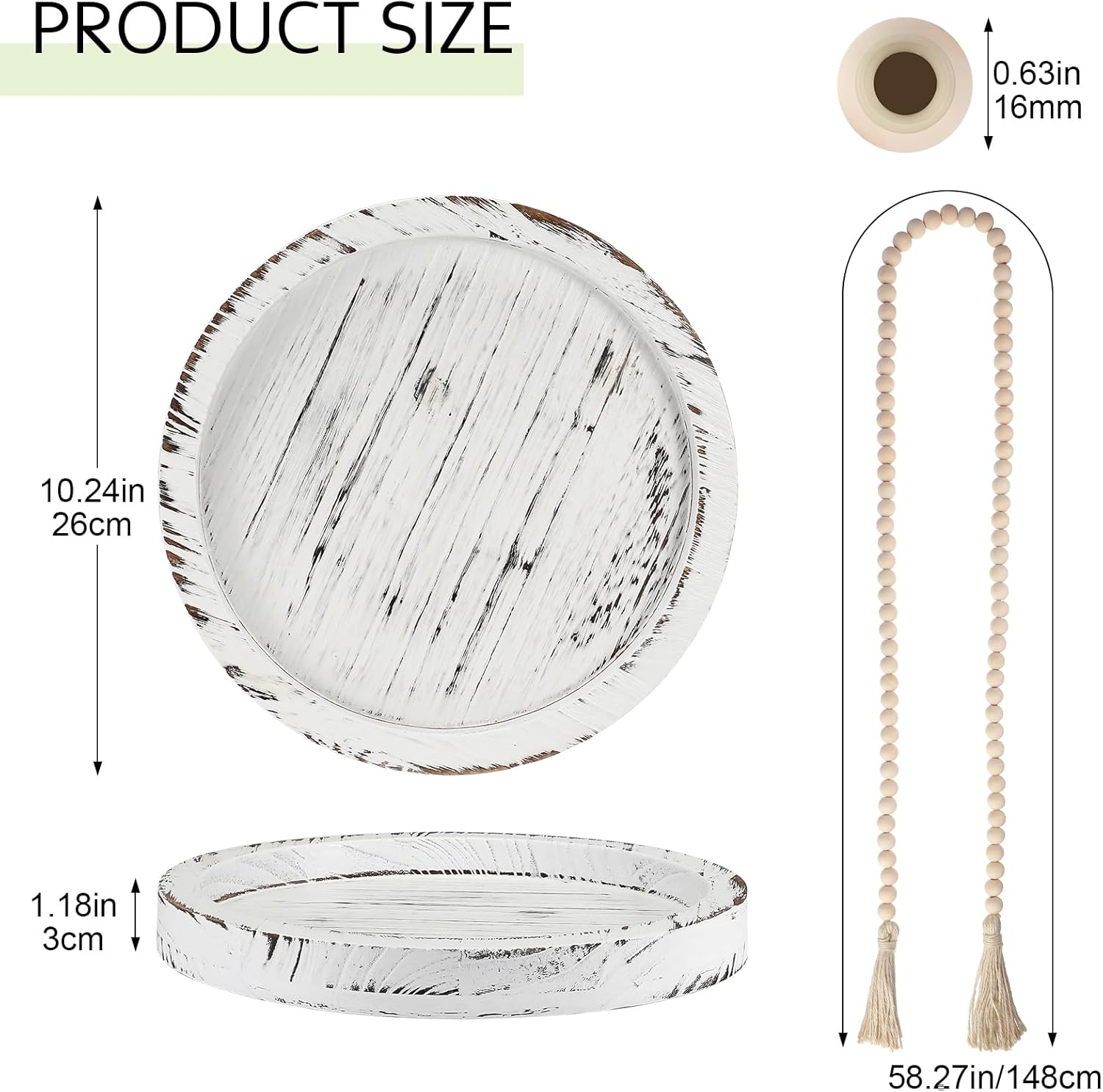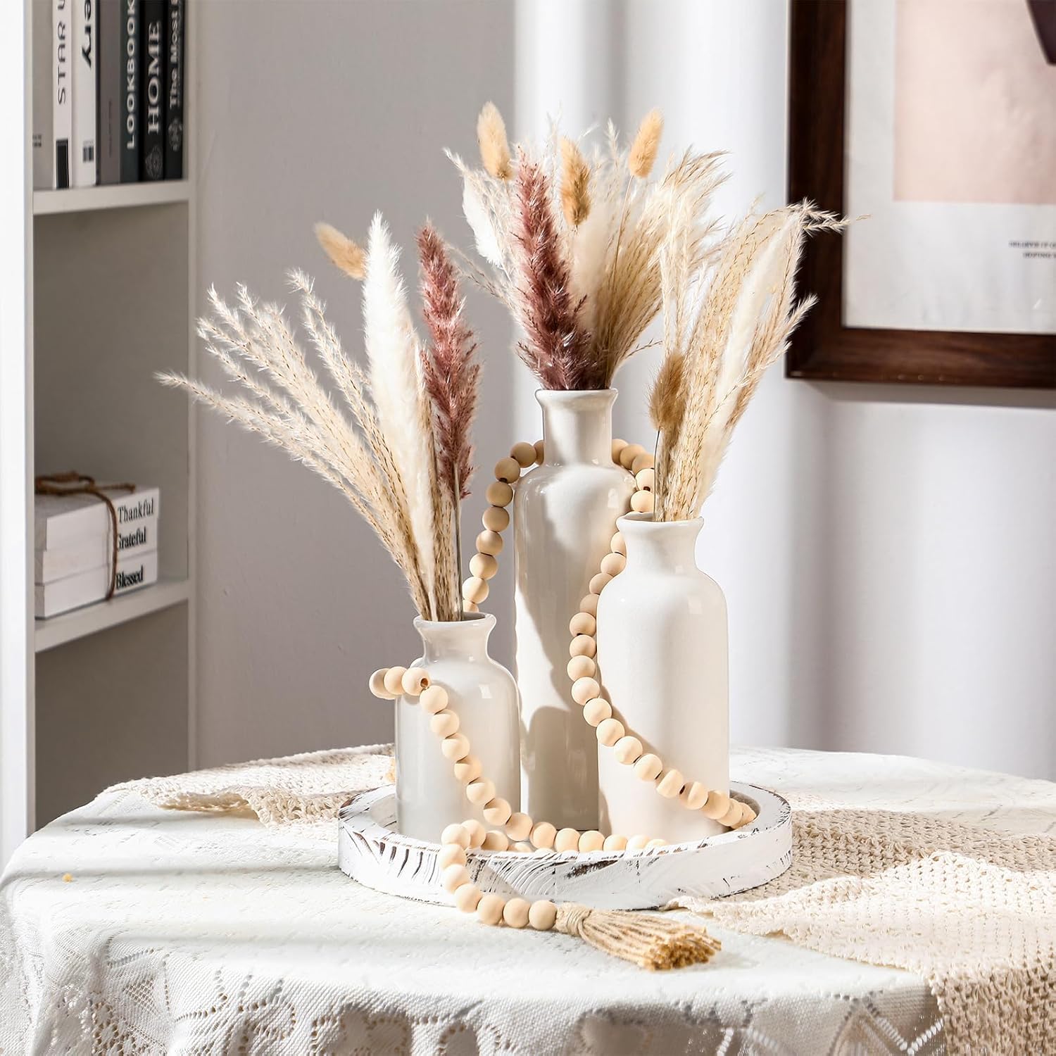 Features: Adds charm to varied spaces: This decorative set fits in with your existing decoration, becoming an exquisite addition to the living room, bedroom, bathroom, table, bookshelf, or mantelpiece. With its minimalistic design, it enhances your space's charm. Delicate style: With this set, we offer you not just a product but the freedom to shape your own style. You can even color the wooden beads to add your individual touch, making your decoration unique and true to your personal aesthetics. Specifications: Material: ceramic, wood, jute Color: white Size: Vases: 3.03 x 3.03 x 9.84 inches/ 7.7 x 7.7 x 25 cm, 2.83 x 2.83 x 7.48 inches/ 7.2 x 7.2 x 19 cm, 2.8 x 2.8 x 4.92 inches/ 7.1 x 7.1 x 12.5 cm Bead garland: 58.27 inches in length Wooden tray: 9.69 inches in diameter Package includes: 1 x Wooden tray 1 x Bead garland 1 Set of ceramic vases Notes: Manual measurement, please allow slight errors on size. The color may exist a slight difference due to different screen displays.