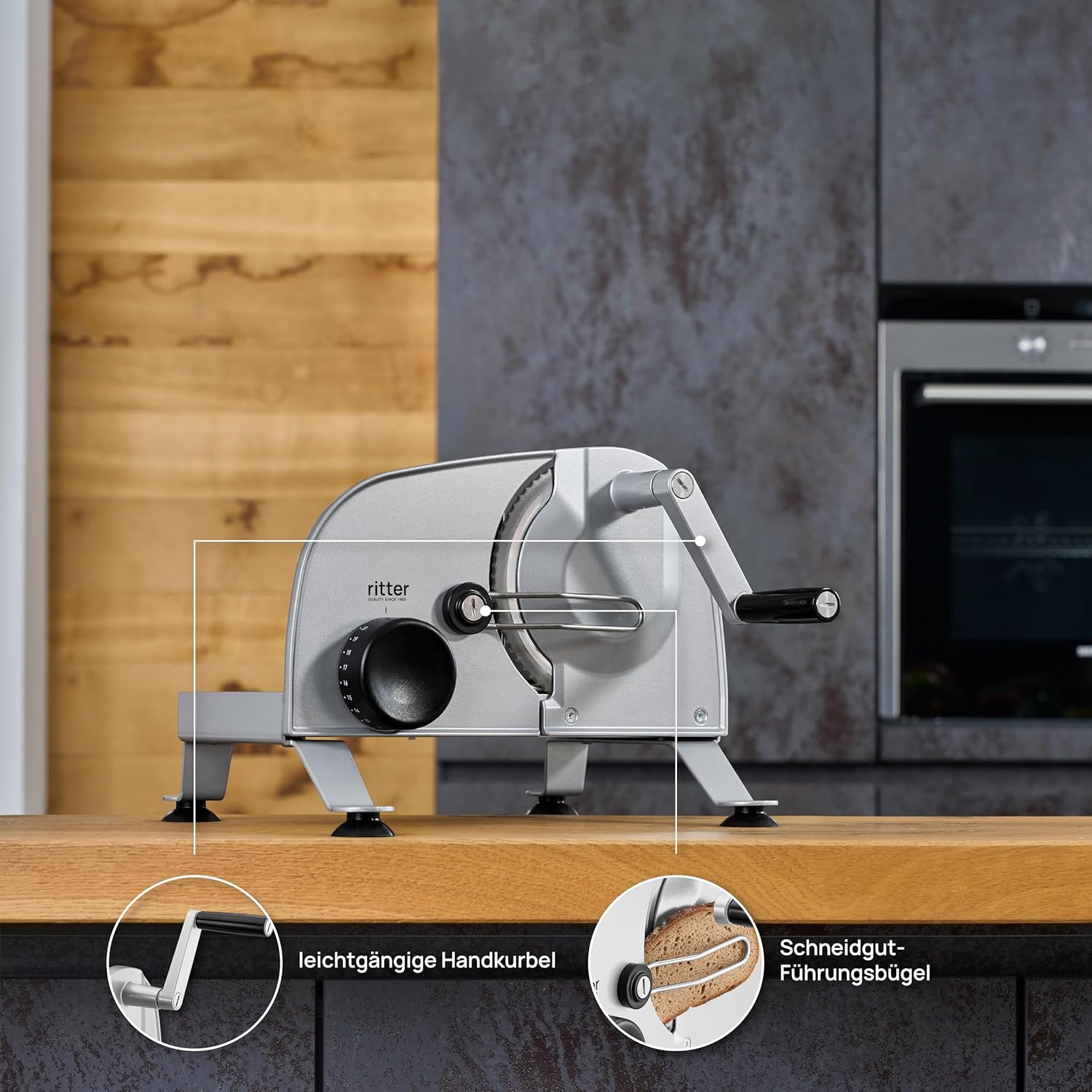 ritter hand-operated food slicer manus 3 silver metallic Short description - manually operated - food sliced from left to right - full metal construction - silver metallic - serrated circular blade, 17 cm Ø - slice thickness adjustable up to approx. 20 mm - detachable carriage made of stainless steel - carriage way approx. 20 cm - smooth crank made from metal with a plastic handle - stainless steel guide bracket for the food to be sliced - feet made of steel - four high-quality suction feet for a non-slip and solid footing Technical details - TÜV Rheinland/GS - dimensions: width 36.5 cm / height 25.0 cm / depth 33.5 cm - weight: 3.3 kg Scope of delivery - hand-operated food slicer silver metallic with serrated circular blade, 17 cm Ø - smooth crank with plastic handle - slicing carriage - left-over holder - operating instructions