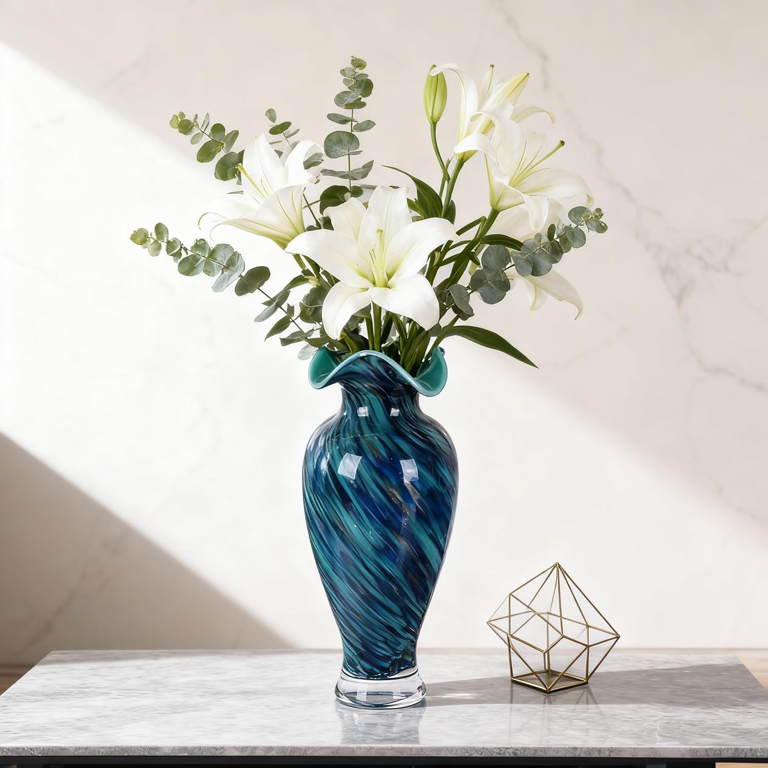"This Murano glass vase collection offers the perfect blend of traditional craftsmanship and modern elegance. Each hand blown glass vase features vibrant colors and intricate patterns, making it a unique addition to any home. The blown glass vase technique ensures that no two pieces are alike, providing an exclusive decor item for those who appreciate fine art. Many customers struggle to find a piece that can complement both classic and contemporary decor styles, but this vase solves that issue. Whether placed in your living room, office, or even in your bathroom, this large glass vase adds a sophisticated touch that enhances the atmosphere of any room. Its versatility makes it ideal for creating a statement in any large glass decorative vase or as a peacock vase for a more whimsical look. A common issue with many vases is their lack of versatility. They either don’t fit into the desired space or don’t match the desired decor style. The extra large glass vase design of this product fits effortlessly into large spaces and serves as a bold focal point. The wide mouth vase is designed to hold a variety of floral arrangements, from tall elegant flowers to lush bouquets, ensuring that your decor always looks fresh and vibrant. Its inner diameter of 5.5cm/2.2in ensures that your flowers stay in place, making it practical as well as decorative. If you're seeking a blown glass gift or a stained glass vase, this piece offers all the qualities you're looking for. Another common problem with traditional vases is their lack of quality and longevity. Many decorative pieces are made from low-quality materials that can break easily or lose their appeal over time. This Murano glass vase is hand-crafted from premium glass, ensuring durability and long-lasting beauty. The glass is strong and the vase is designed to withstand everyday use, making it an excellent investment for any home. Whether you choose it as a statement piece or for practical use, it offers unmatched quality that other vases simply cannot match."
