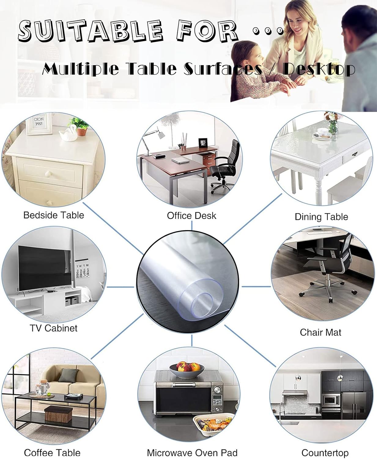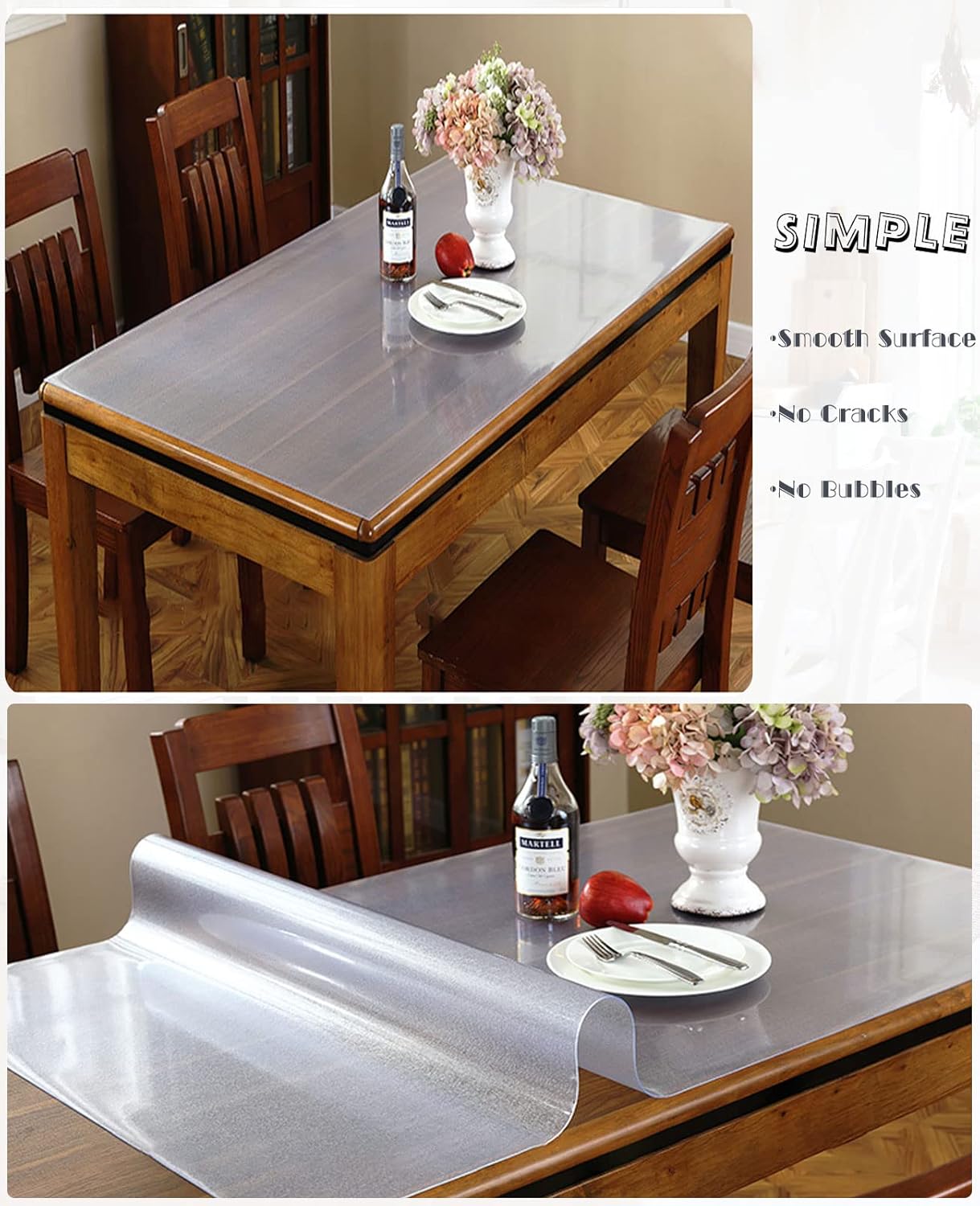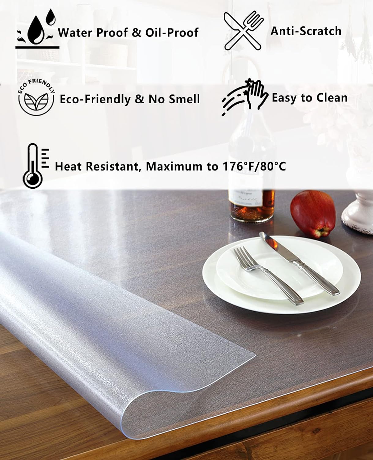 【 FEATURES OF CLEAR TABLE COVER PROTECTION: 】 ·1.5mm thickness clear table pads, won't easily slide off and Doesn'T Slide Or Move; ·Easy to Clean, Thick and Durable ·Against heat, maximum heat resistant up to 176°f/80°c; ·Easy to cut to fit; ·Waterproof and Oil Resistant; ·Clear table cover is no plastic smell , with better quality; ·Machine Cutting: The cover will be slightly bigger than advertised size for margin of shrinking, therefore slight size difference is not qualified as a quality issue;【PRODUCT PARAMETERS】 ·Product Name: ·Material: Heavy Duty Vinyl(PVC+TPU) ·Shape: Rectangle/Square/Round/Oval ·Corner Edges: Rectangular or Rounded Corners ·Recommended Wash Type: Wipes clean with a damp cloth ·Packing: Roll【Package Included:】 ·1x PVC clear table cover (packing: roll)【How to lay it flat on the table when unroll it?】 1. Heat it with a hair drier and put something heavy on the curled places. 2. Lay it unroll on the sunlight. 3. Use the steam setting on your iron. 4. Lay out in Reverse-Roll direction, use heavy duty items pressing in days.【How to Contact Us?】 ·Please open SXHQYG storefront, looking for Have a question for SXHQYG? Then Click Ask a question.