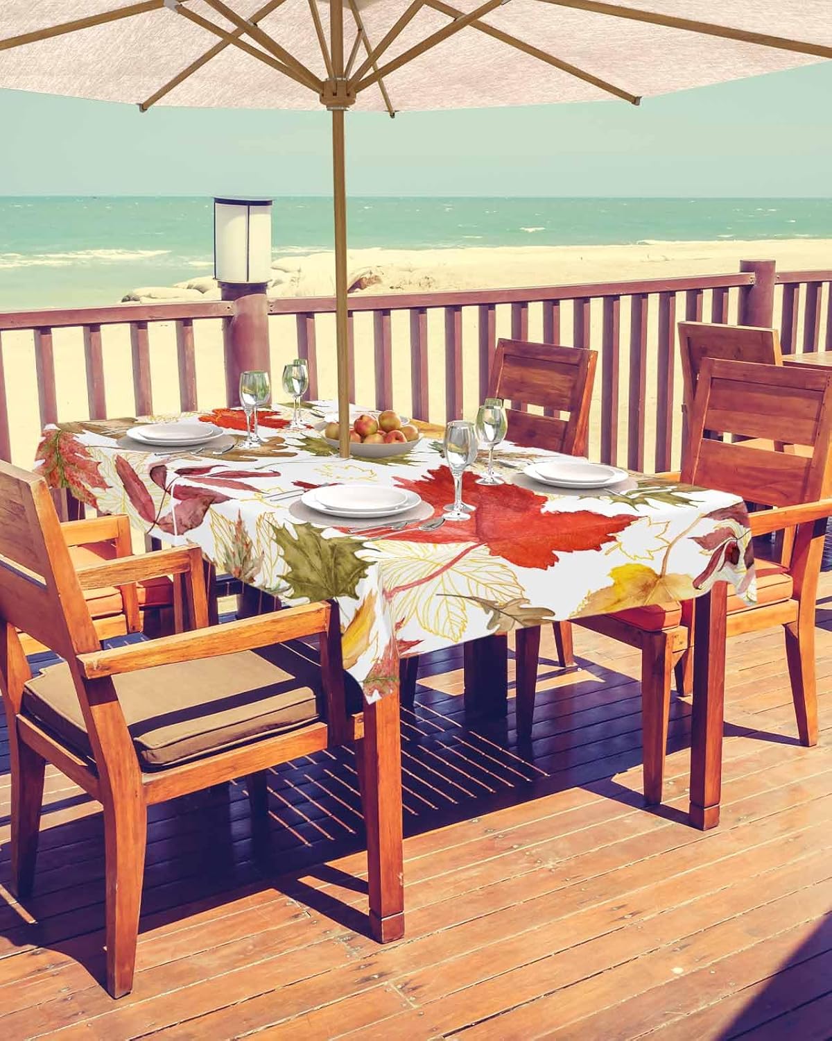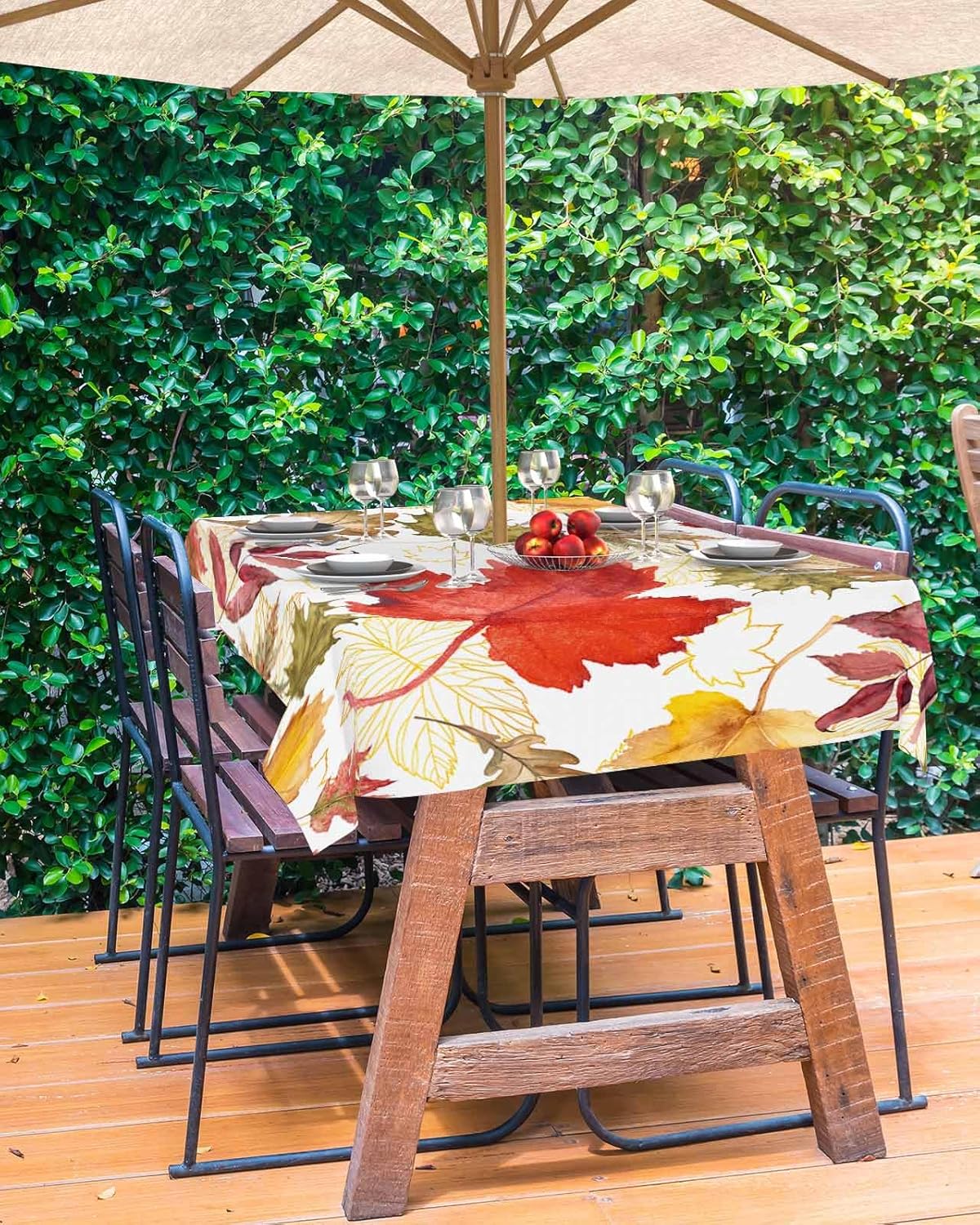 Fall Tablecloth with Umbrella Hole and Zipper to Brighten Up Your Thanksgiving Holiday Party Patio Outside TablesProduct DescriptionTablecloths Size Dimensions: Round 54 InchRound 60 InchSquare 54x54 InchRectangle 52x70 Inch / 60x84 Inch / 60x102 Inch / 60x120 InchExquisite WorkmanshipMade of reuasble polyester fabric which gives you superior strength and durability and also provides the convenience of spillproof & waterproof that your dining events require.Smooth Zipper DesignAll outdoor tablecloth sizes have an option with a smooth zipper and an umbrella hole.Easy To InstallZip on and off easily around patio table umbrellas, no need to remove the patio umbrella.Vibrant Fall PatternOur tablecloths come in a variety of vibrant colors and patterns for each season and occasion. Give your space a real personality, the perfect gift for various holidays.Ideal Garden DecorEmbellish your patio umbrella with beautiful outdoor tablecloth, enjoy a great sense of beauty. Impress your guests and bring you a good mood. A good decoration for independence day Table.More Scene UsesMatches delicately and create unique style for your party, ceremony, holidays, banquet, hotel, diner, wedding, cafe, catering, picnic, BBQ, camping, buffet, outdoor and indoor use. Perfect decor for sandy beach, garden and coffee shop.Special NoteBoth machine and hand washable with gentle cycle and lay flat to dry, no bleach, iron on low heat if required.Please measure your table prior to purchasing to ensure the best fit.