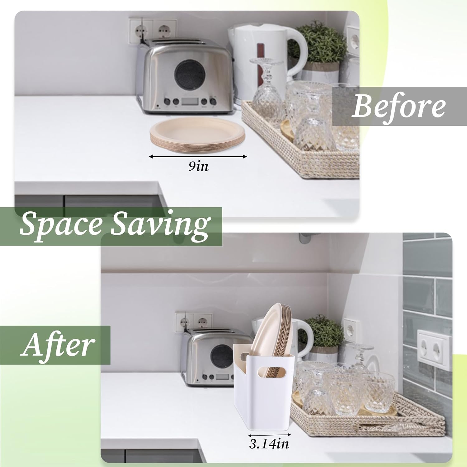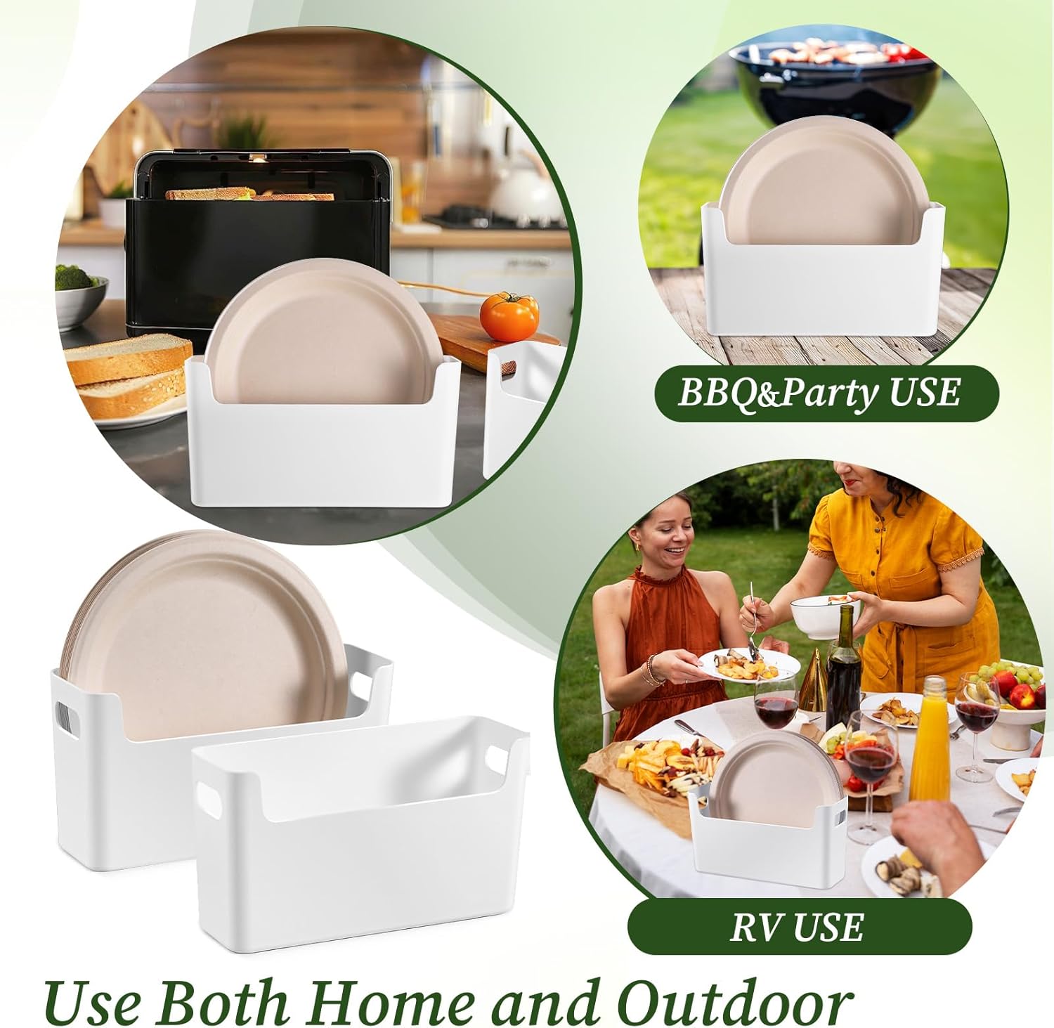 Packing List: 3 PCS Paper Plate DispensersSpecificationSize: 25.5*13.5*8.5 cm(10*5.31*3.34inches)Color: WhiteMaterial: PPAdditional InformationDurable and lightweight, these organizers feature a fine frosted texture on the outside and a smooth interior for easy plate sliding. Perfect for home, RV, or outdoor use