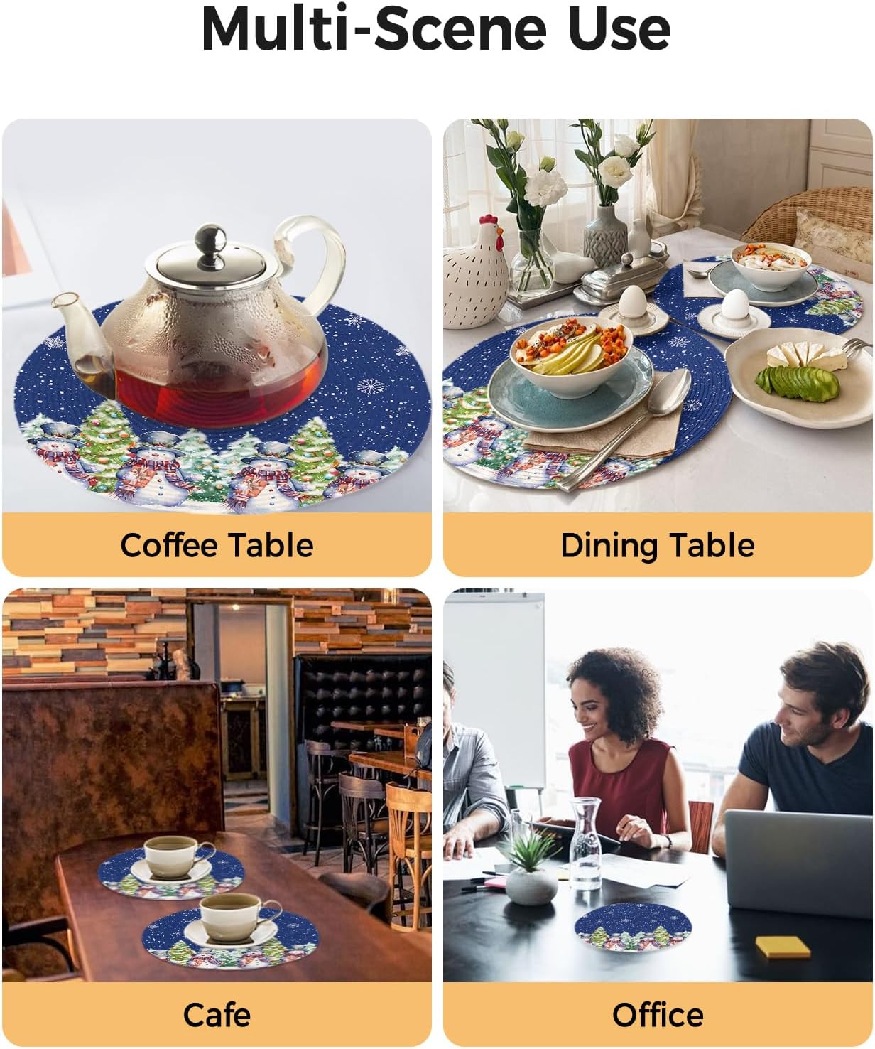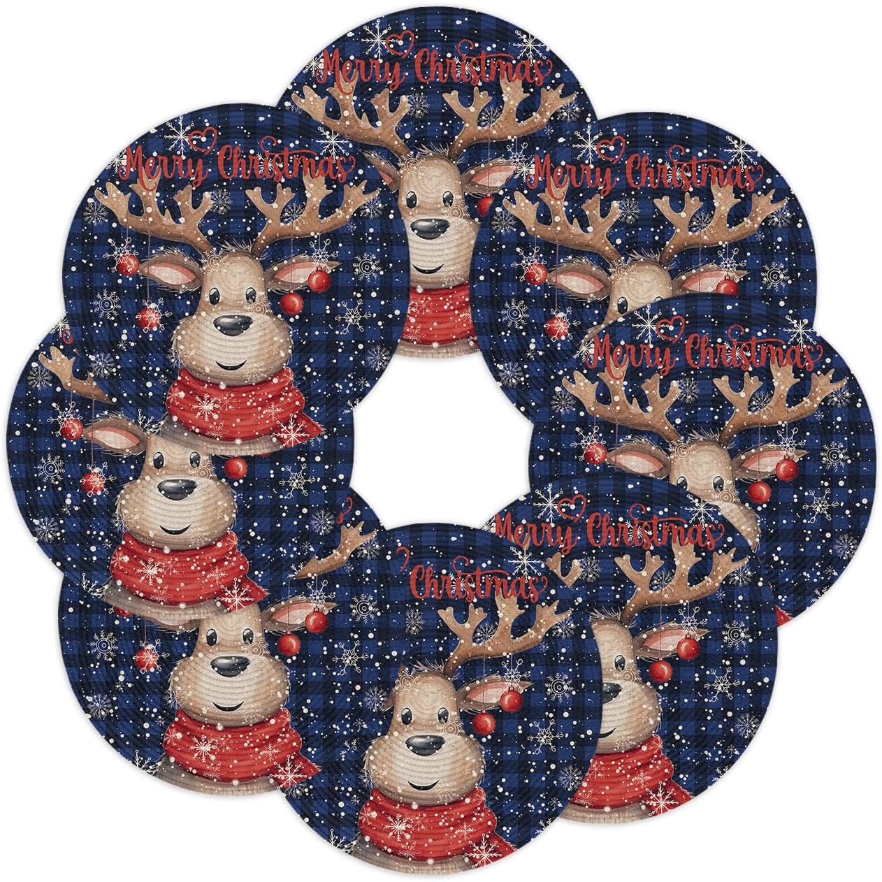 Christmas Round Woven Placemats for Indoor Outdoor Xmas Dining Table DecorGive an elegant decor touch to your home, and add a natural art aesthetic chic atmosphere.【Product Description】Package: Placemats Set of 2/4/6/8 PCSSize: Diameter 15 InchMaterial: Eco Friendly PolypropyleneMatches delicately and creates a unique lifestyle for your dining table, kitchen, garden, party, banquet, hotel, diner, reception, cafe, bar, picnic, BBQ, patio, any outdoor and indoor use.【Multiple Design Occasions】Adopting advanced digital printing technology, bright colors, and clear images, sturdy weave, overall elegant and beautiful.Our place mats come in a variety of vibrant colors and patterns full of natural aesthetic feeling for you to decorate your home.Our placemats set are durable, reusable, and exquisite. Great choice as a considerate and delicate gift for family members, couples, friends, and roommates.The high end placemats look elegant and stylish, and could be used for cups, plates, some tableware, cooking pots, potted plants etc, to meet your different needs. 【Warm Tips】Wipe clean with damp sponge or cloth. Both machine and hand washable with gentle cycle and lay flat to dry, no bleach, iron on low heat if required. The colors may have slight differences due to different screens.Due to the official package restrictions, placemats rolled up in the box, we suggest put some heavy things on the mats after unboxing, the crease will disappear and it will be flat.【Special Note】How to make the placemats flat?Unboxing → Crease the back → Turn over the placemats opposite → Make the front side up → Put heavy things on it → After a while, they will be flat
