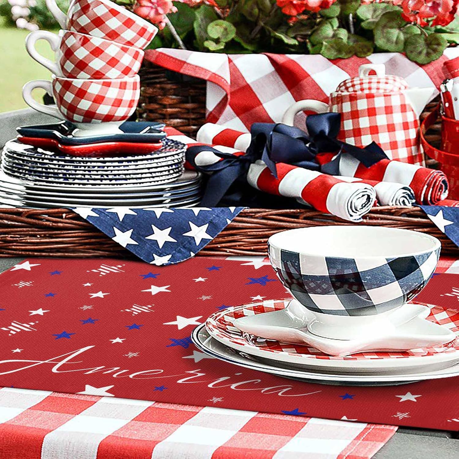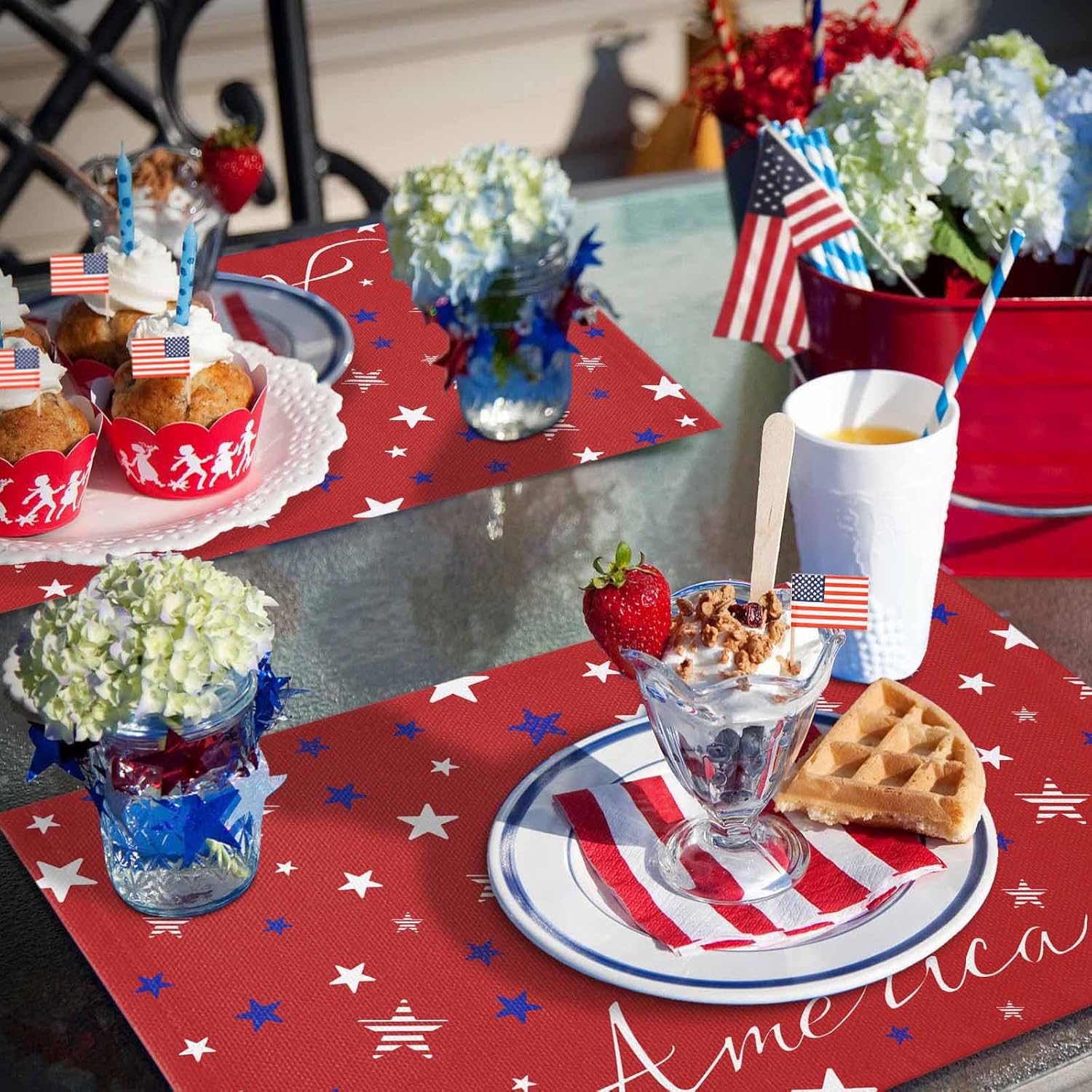 Use our Patriotic Placemats, elevating your dining experience Placemats Function Waterproof and heat-resistant, odorless and safe, not easy to fade and deform,reusable Protect your table from scratches and stains, brings you a pleasant meal experience Exquisite Design Delicate and elegant rectangular design Bright and vivid color, classic patterns, delicate and adorable Minimalist and Practical The placemats are crafted with exquisite workmanship, paying attention to detail, showcasing a high-quality and refined quality that adds a unique style to your dining table Multipurpose Use Great for outdoor/indoor decor Be used for dining tables, buffet cabinets, TV tables, farm tables, coffee bars, buffet tables, dressing tables decoration Make an ideal gift for housewarmings, weddings, parties, and special occasions About cleaning Cleaned with water and dry under the shade. Natural drying is recommended Just using the wet cloth or towel to wipe off when the table mats have some liquids Notice When have crease problems, flatten the table mat and put some heavy objects on it, then the Crease will disappear. Please allow slight color differences due to different displays. Please allow a 2-3 cm error due to manual measurement.