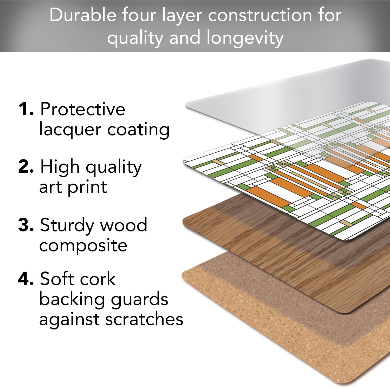 CounterArt Oak Park Skylight by FLW Decorative Hardboard Placemats. Frank Lloyd Wright is one of the renowned architects of the 20th century. He is often considered the pioneer of the Prairie School movement, which sought to create architecture that was in harmony with its natural surroundings. Place Mats are printed with designs from the Frank Lloyd Wright Collections. Manufactured in the USA. Hardboard Place Mats are made with a layered construction. The surface of the mats is coated with protective lacquer. Heat resistant to 212 degrees Fahrenheit. The art is laminated to a wood composite layer. A soft cork backing protects the table surface from scratches. These place mats add distinction and elegance to your dining space. Decorative Place mats are an easy way to change the look of your kitchen, dining room, or outdoor eating area. Place mats measure 15.75” L x 11.5” W and are rectangular in shape.