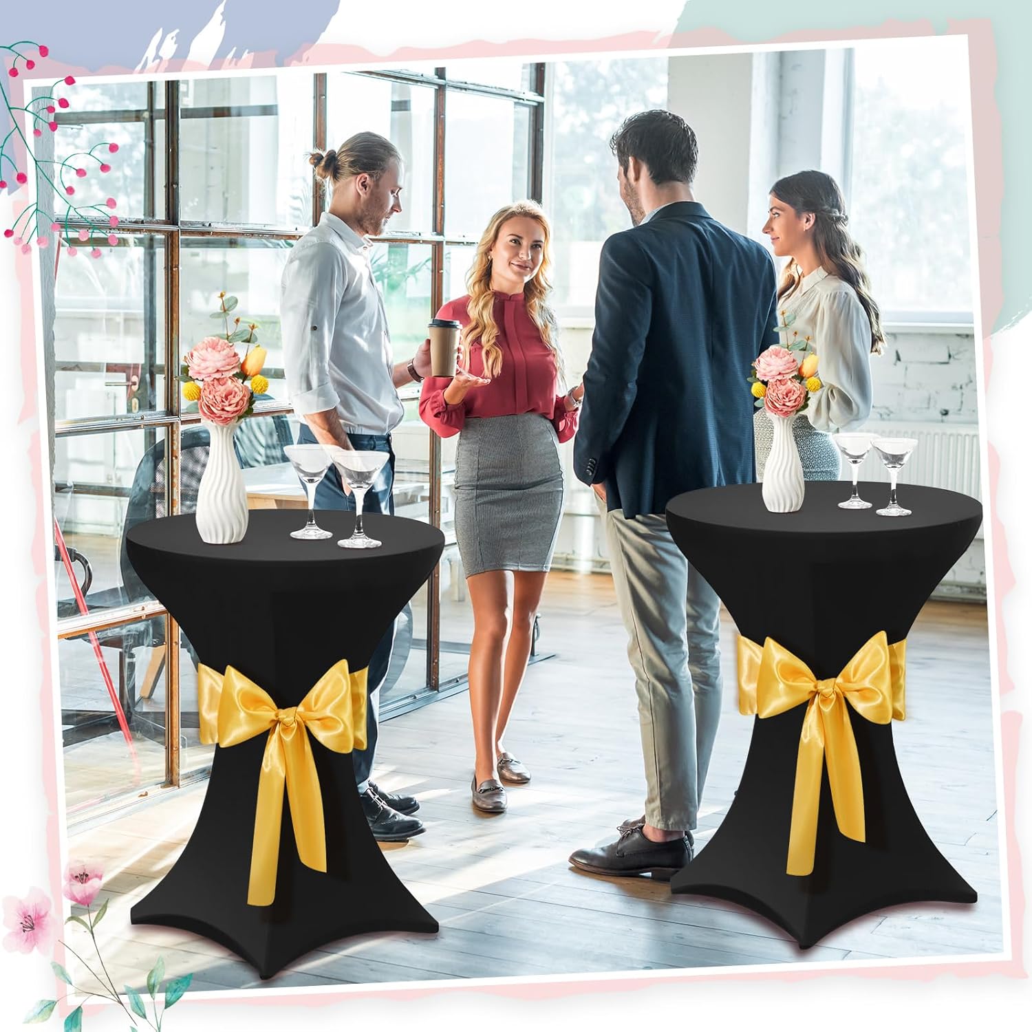 Features: Protection for tables: Beyond adding aesthetic appeal to your event, these spandex cocktail table covers also function as reliable protective layers, safeguarding your tables from dirt, dust, and scratches. Elegant design: The glossy gold sashes, made of light and textured polyester material, add an elegant style to each table, transforming your event space into something truly spectacular. Specifications: Material: Table cover: stretch polyester, spandexSash: polyesterColor: black, goldSize: Table cover: approx. 32 x 43 inches/ 80 x 110 cmSash: approx. 6.7 x 108 inches/ 17 x 275 cmPackage includes: 6 x Table covers6 x SashesNotes: Manual measurement, please allow slight errors on size. The color may exist a slight difference due to different screen displays.