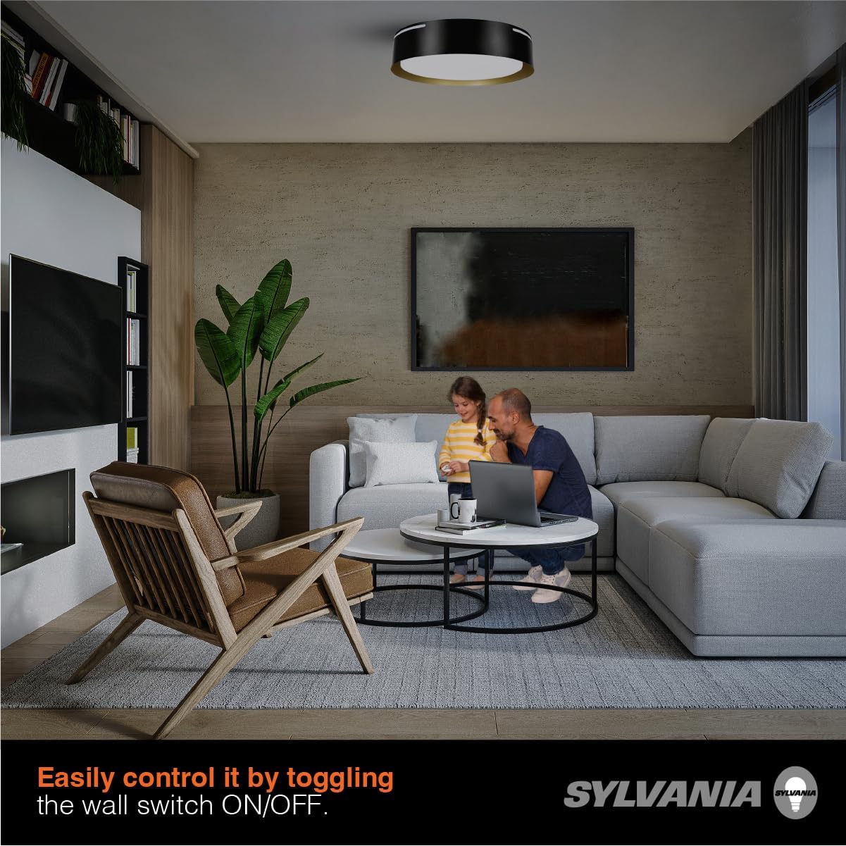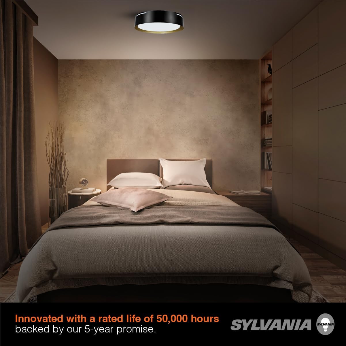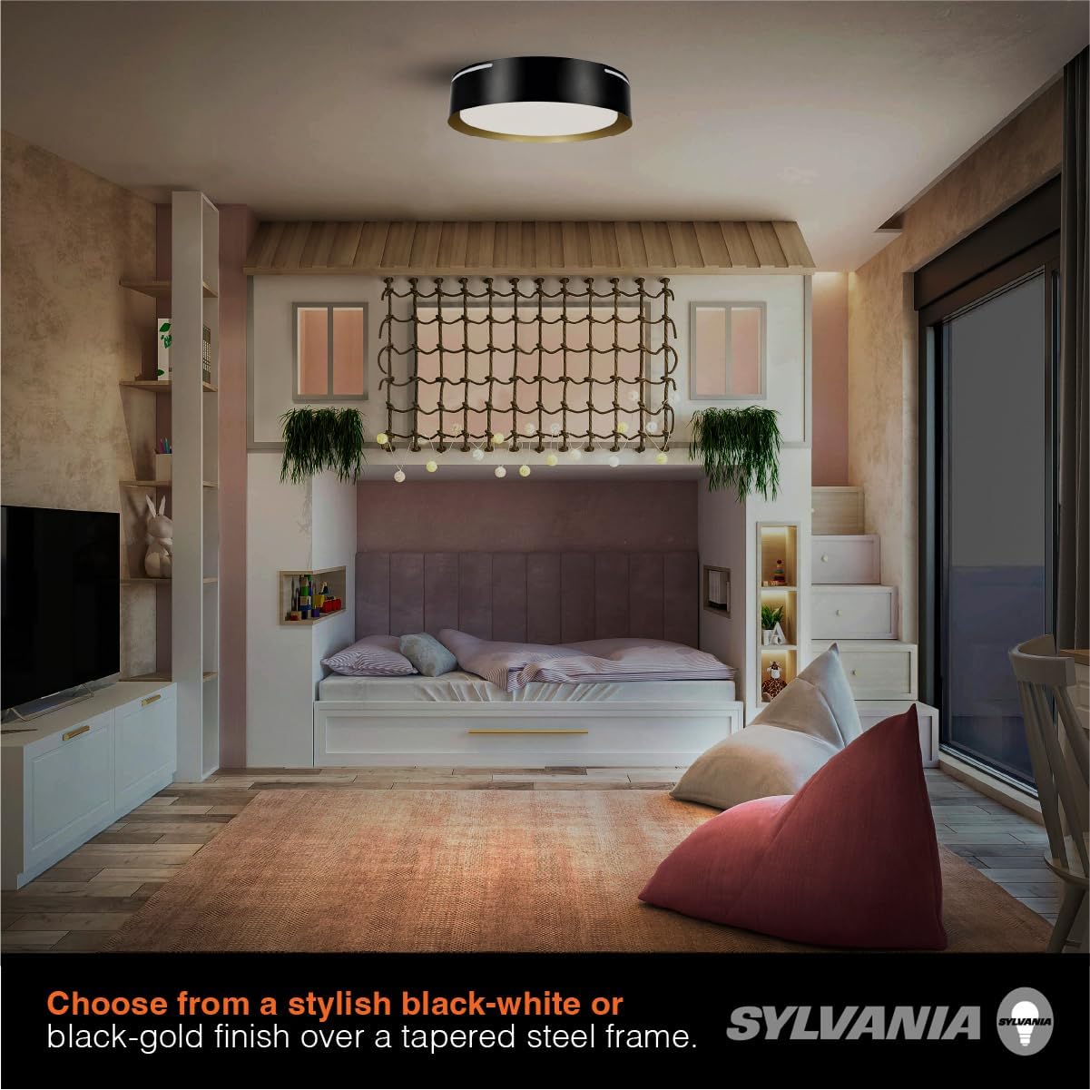 Upgrade your home's interior with the sleek SYLVANIA Flushmount ceiling lights luminaire, adding a touch of contemporary elegance. Experience the convenience of integrated Night Light technology, providing a soft warm glow of 90 lumens separately from the main light. Easily control it by toggling the wall switch ON/OFF. These ceiling lights feature built-in LEDs, offering 5 color-selectable temperatures and a bright 1400 lumens output. Choose from a stylish black-white or black-gold finish over a tapered steel frame. Save on cost and energy over a 45-year lifetime, all backed by our reassuring 5-year promise. Enjoy a straightforward installation process – no extra hardware needed.