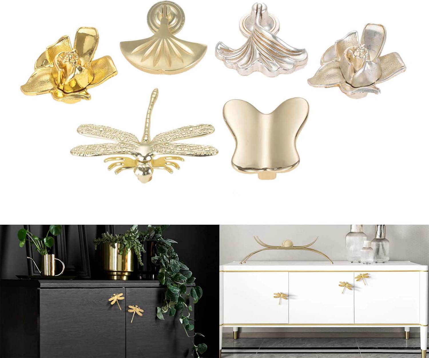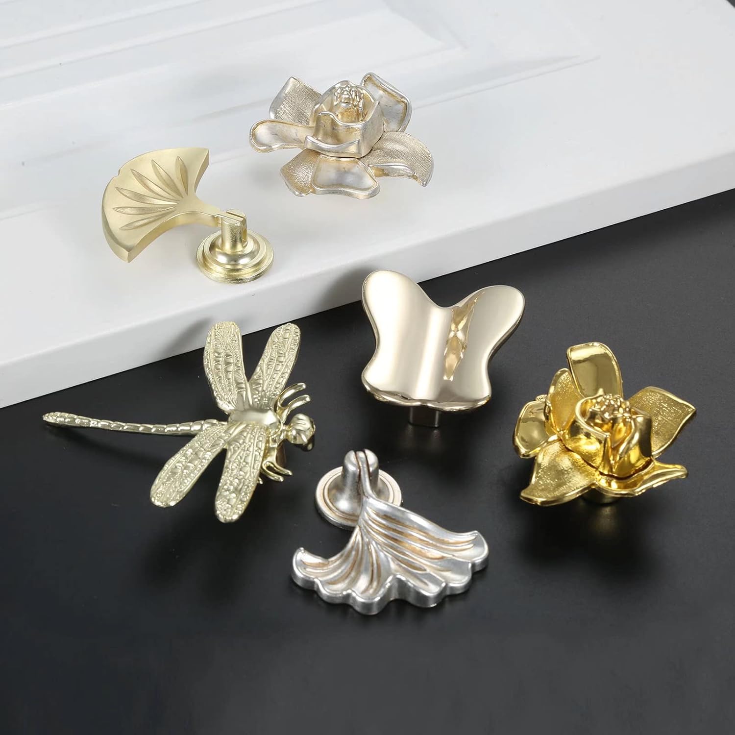 Specification: Material: Zinc alloy Color: Golden or Ancient Silver Tone Flowers --Size (LxWxH):64mmx34mmx45mm; Butterfly -Size (LxWxH):54mmx48mmx21mm; Leaf -Size(LxWxH):55mmx55mmx18mm; Dragonfly-Golden-Size(LxWxH):580mm x 80mm x 17mm Features: STYLE UP YOUR SPACE - Update our home décor by adding decorative hardware to our cabinets and drawers. The simple addition of knobs and pulls can revitalize the look and feel of an entire room. DURABLE - These retro handles are made of excellent quality Zinc alloy that is colorfast, rust less, sturdy and long lasting on any door. EASY INSTALLATION - Knobs are easy to install, three different size of mounting screws are included to fit most of thickness drawer. These beautiful knobs are the finest option for gifting to your loved ones on any occasion and suit every celebration, elegant, unique and durable. It is the combination of classic drawer handle and modern hardware industry. Modern look and solid pull handles design, add a decorative touch to your cabinets and make your home unique and gorgeous.