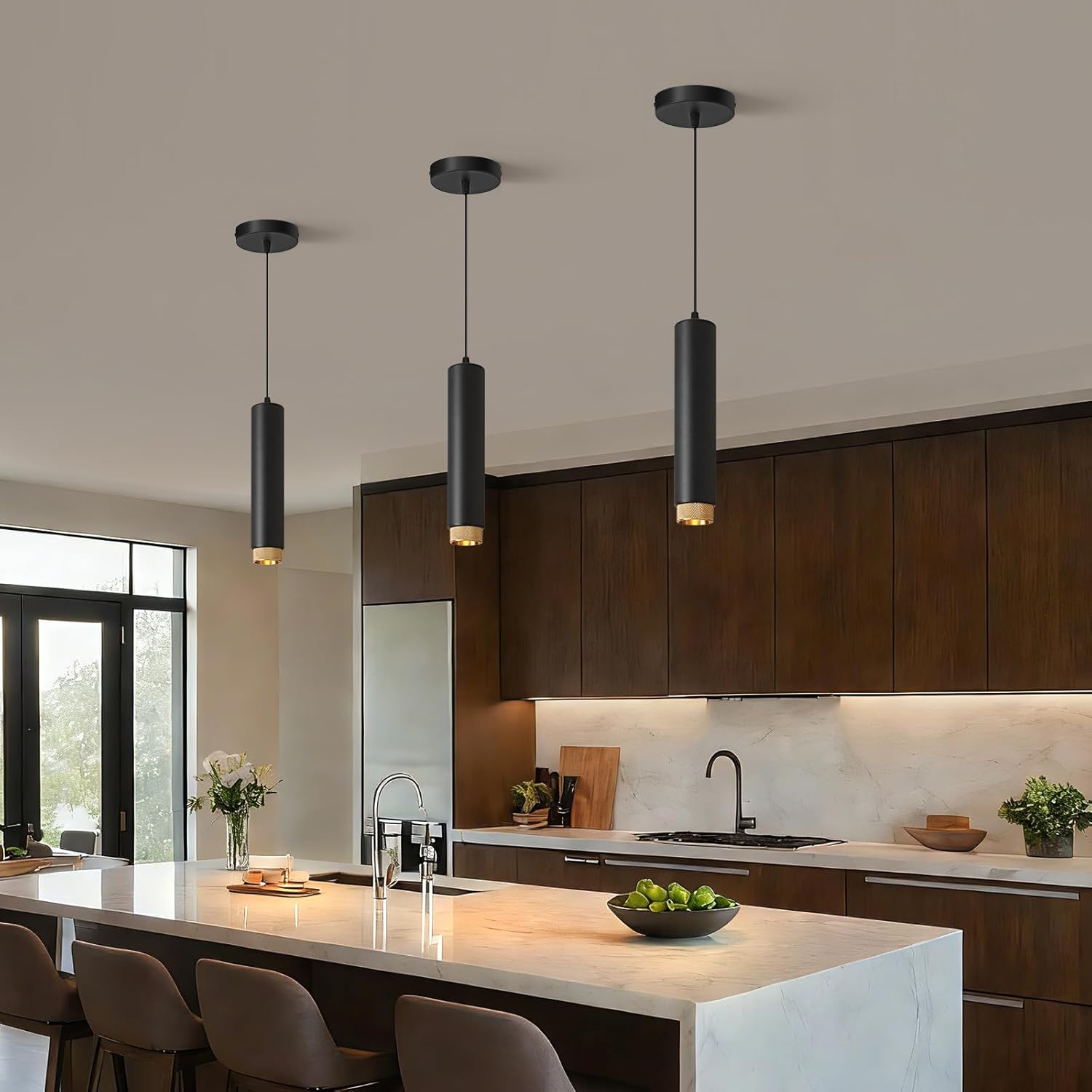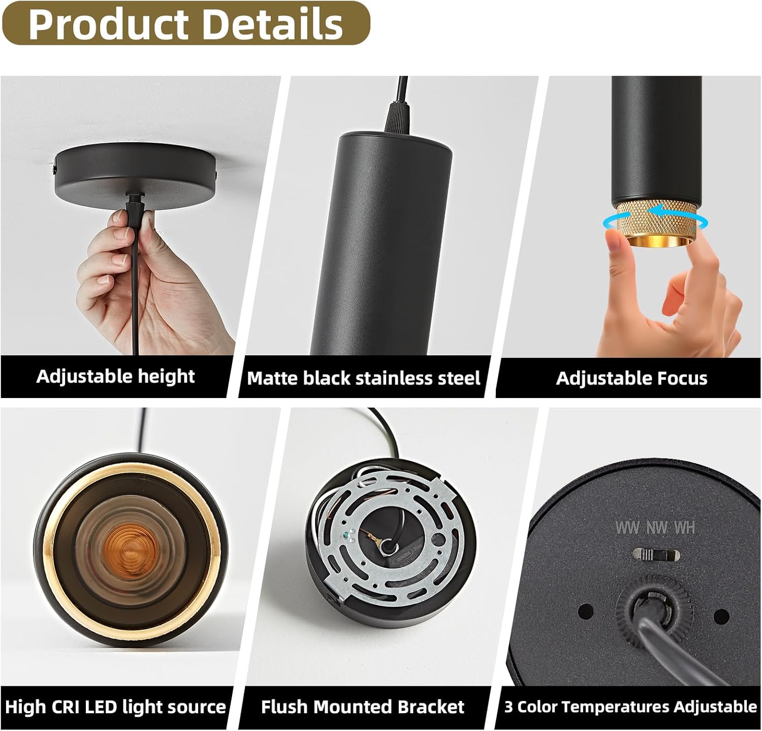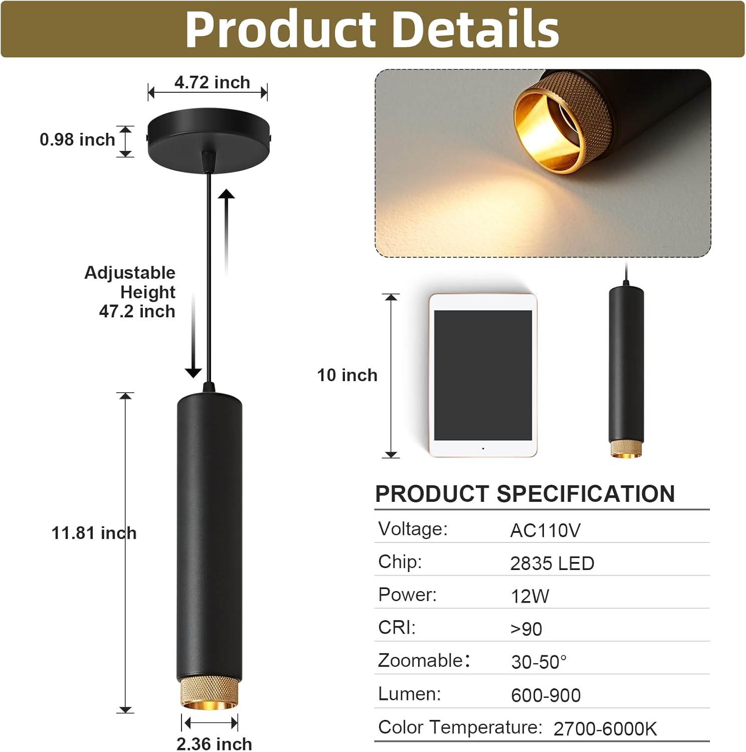 OKELI Modern Pendant Lights, Dimmable Adjustable Focus Pendant LED Light Fixtures, 2700K/4000K/6000K for Kitchen Island,Bar,Bedroom, 11.8 inch, 12W, 1 Pack