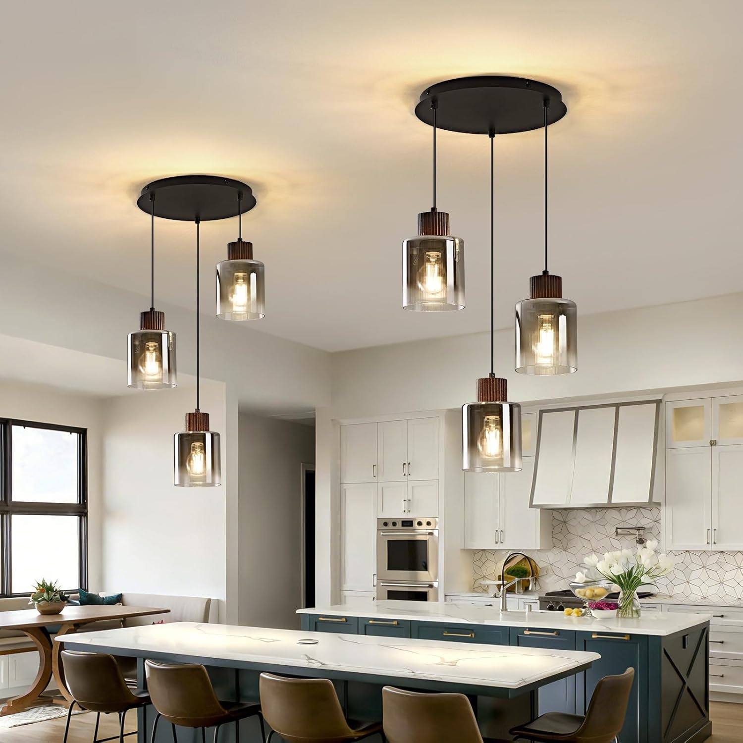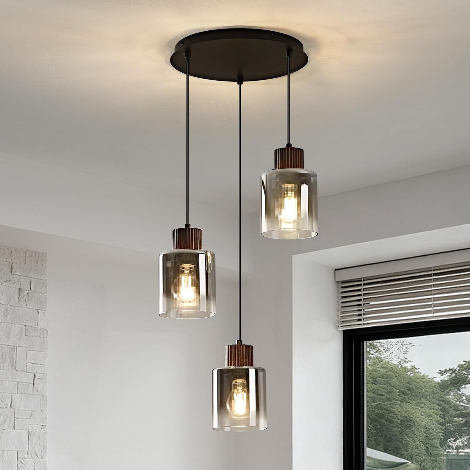 Modern Glass Pendant Light, Black 3-Light Chandelier for Kitchen Island/Dining, Height Adjustable, E26 Sockets, Bulbs Not Included