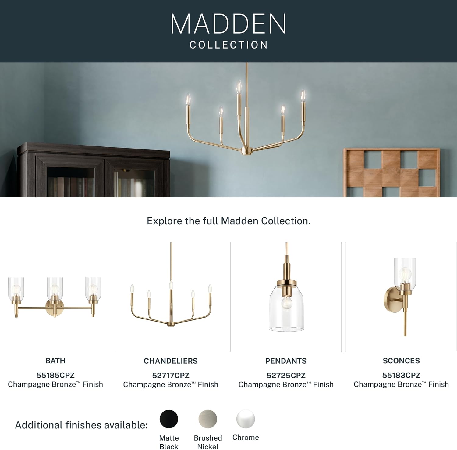 The Madden mini pendant illuminates your space with its clean, modern aesthetic. Elegant stacking details and soft curves pair well with various decor. In Champagne Bronze, Sloped Ceiling Compatible, for Entryway, Breakfast Nook or Laundry Room, Madden is the perfect accent.
