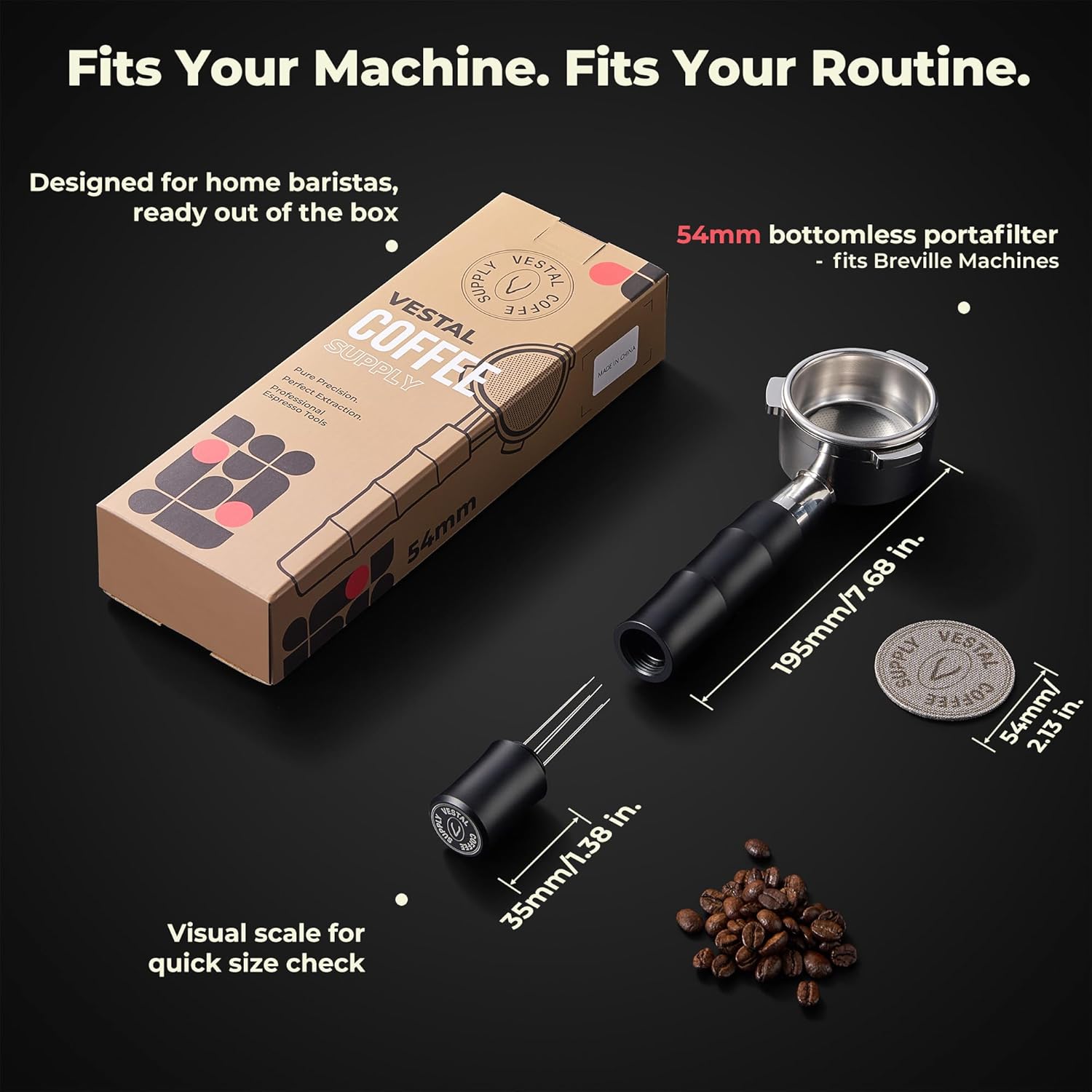Pure Precision. Perfect Extraction. Experience the next evolution in home espresso with Vestal Coffee Supply's revolutionary bottomless portafilter - the first to seamlessly integrate a professional WDT (Weiss Distribution Technique) tool directly into the handle. Clean design meets flawless function. Engineered for Excellence Integrated WDT Tool: Premium stainless steel needles screwes in the handle for perfect grind distribution every time Precision Puck Screen: Food-grade mesh screen prevents channeling and ensures even water flow 54mm Precision Fit: Compatible with Breville Bambino, Infuser, and other 54mm machines Bottomless Design: Visual feedback reveals extraction quality - diagnose channeling and perfect your technique Artisan Crafted: CNC-machined from food-safe materials with precision-engineered basket The Vestal Difference: ✓ Consistent, even extractions eliminate bitter or sour shots ✓ Built-in distribution tool streamlines your workflow and saves counter space ✓ Bottomless design helps identify and fix extraction problems instantly ✓ Puck screen creates uniform water distribution across coffee bed ✓ Professional-grade construction built for decades of daily ritual ✓ Minimalist aesthetic honors the purity of great espresso Perfect For: Discerning home baristas who demand café-quality results. Whether you're upgrading from basic equipment or seeking to eliminate channeling forever, Vestal delivers the tools for espresso perfection. Complete Kit Includes: 54mm Bottomless Portafilter, Integrated WDT Tool, Precision Basket, Puck Screen Pure tools. Perfect ritual. Exceptional espresso.