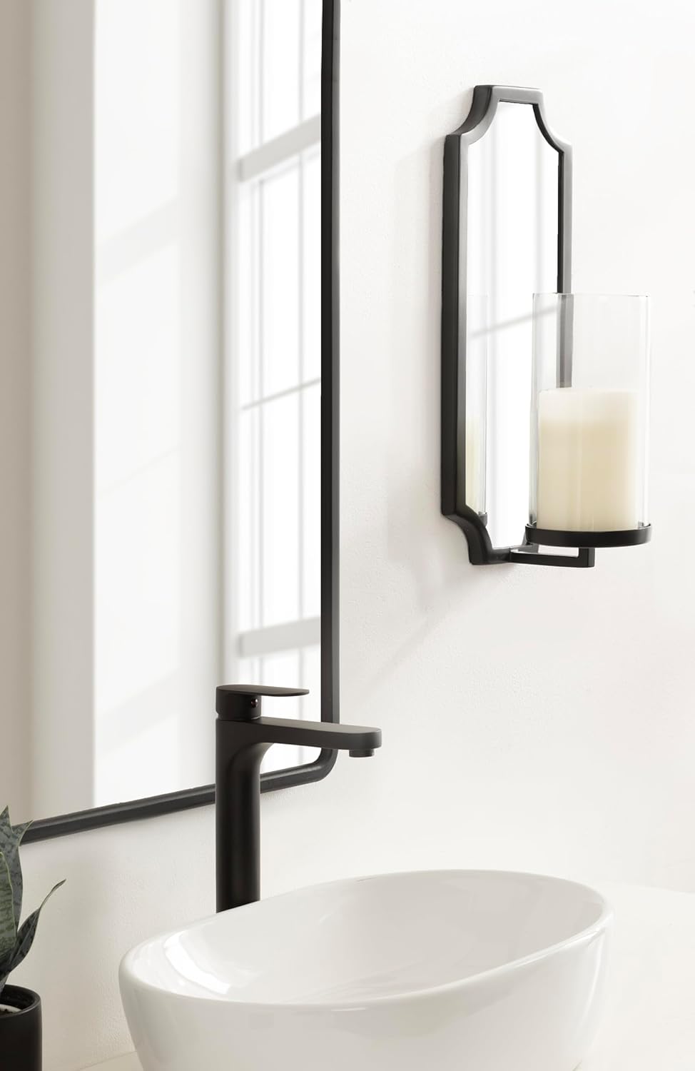 Elevate your home decor with the Kate and Laurel Ciel mirrored wall sconce. Crafted with meticulous attention to detail, the sconce features a durable metal construction with a modern black finish, imparting a touch of contrast to any room. The contemporary scalloped candle holder not only serves as a stylish accent but also offers a practical solution for enhancing the ambiance with flameless candles. Behind the candle holder is a scalloped mirror that reflects more light throughout your home. Another highlight of this sconce is the removable glass cylinder, thoughtfully designed to beautifully showcase your favorite candles. Whether adorning your living room, bedroom, or hallway, the soft glow emanating through the glass cylinder creates a mesmerizing visual impact and a hint of light. The overall dimensions of this versatile candle sconce are 6 inches wide by 5 inches deep by 16 inches tall. This timeless wall sconce seamlessly combines form and function, making it an ideal choice for those who appreciate a harmonious blend of style and practicality in their home decor. Transform your space with this versatile wall sconce, effortlessly bridging the gap between traditional and contemporary aesthetics.